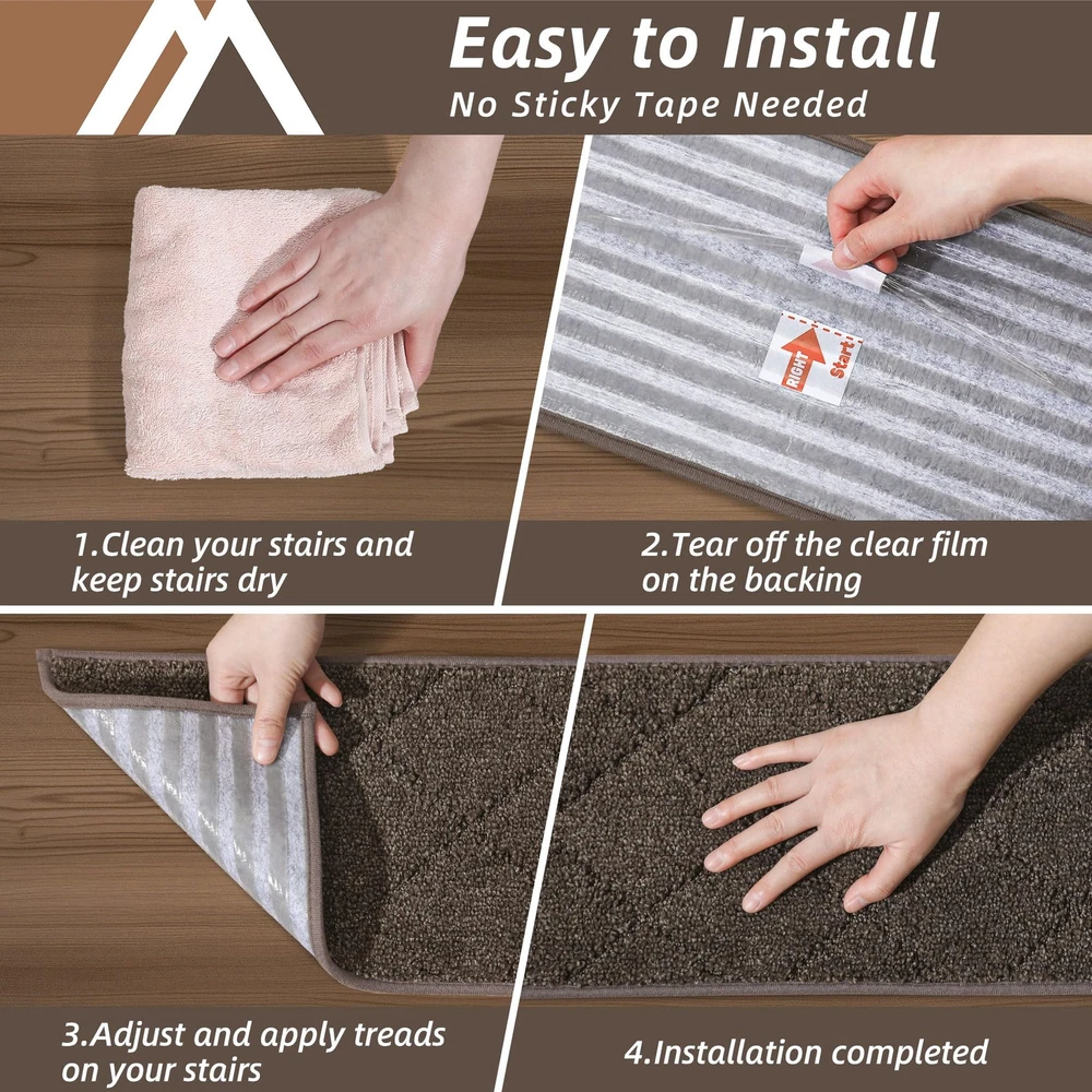 COSY HOMEER Edging Stair Treads Non-Slip Carpet 4 pieces (28×9 inches), Brown Description Features: NON-SLIP STAIR RUG: Multi-purpose Stair mats to use the TPE Non-Skid backing on dry floor, helping it to stay in place on your floor, it won't slip or scuff floors. Low profile design so doors won't get stuck.Perfect for homes with pets (dogs or cats) or kids. HOW TO USED Stair Treads for Step - Just clean, peel, and stick! If you need to reposition or remove,it won't leave any residue,always keeping your floors intact.And it won't remove or slip when meeting water. STAIR TREADS MAT SIZE:28"x9"x0.4",material:made of 100% polyester STAIR MAT NO -SLIP: Non Slip Strips can be washed repeatedly 30 times without affecting the slip resistance. Fit for restaurants,family rooms, corridors,game rooms and children's bedrooms CUSTOMER SERVICE: Our brand is always pursuing customer satisfaction as the top of priority. We are glad to receive more suggestions from our customers, if the mats have problems, we will process any request from customer with 24 hours, and replacement will be paid by us for any quality issues Product Details: Handling We will ship all orders within 1 business day of payment. Delivery We Do Not Ship Outside of the Continental US. Return Policy All items qualify for returns within 30 days of receipt. Buyer is responsible for return shipping on any item that is not damaged. Feedback We take our reputation seriously, we buy and sell online, so we understand the value of trust. If you are unsatisfied with your order, please contact us and we will work with you to resolve it to your satisfaction.