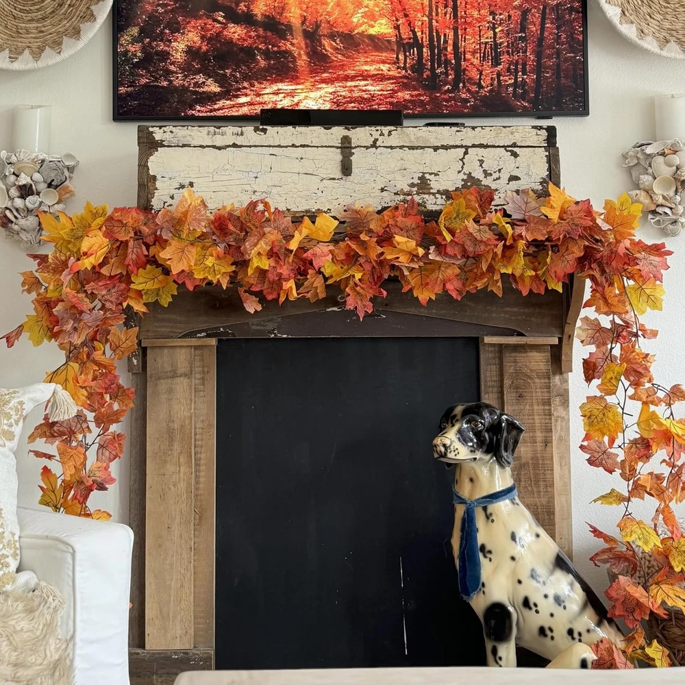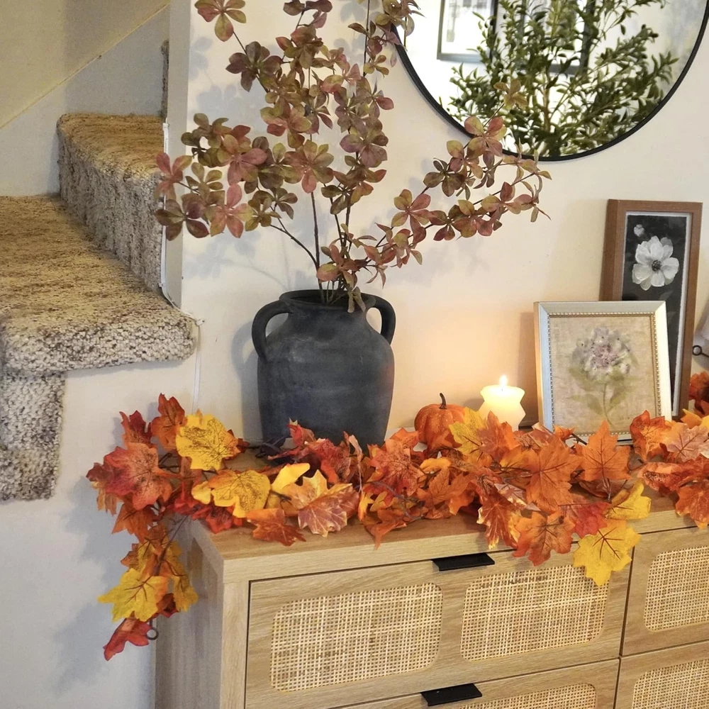 CQURE 6 Pack Fall Leaf Garland, 5.9Ft Artificial Maple Leaves 35.4FT, Orange LuxeFusion Product Description Features SIZE:Our artificial maple leaf garlands made from Silk,Plastic,High Quality,Each garland plants 5.9 FT Long,total 35.4 Ft,Including 6 pieces. SUITABLE OCCASION:The Fall Leaves Garland can decorate weddings,festivals,parties,home decorations,gardens,fencing,floral tributes,sheds Swing frame,air-conditioning pipes,water pipes,door frame,exposed wires,stairs,led lights,etc.Especially suitable for Christmas and Halloween decorations CRAFTSMANSHIP: Realistic Fall Leaves Garland.The color of the maple leaves range from dark green to vibrant orange, look like the real fallen leaves.The orange, yellow, and red and more color maple leaves make for a great blend of colors to warm up any room.Not fading,UV resistant , not falling off, good wear resistance,Non-flammable. DURABLE and REUSABLE: Sturdy and texture clear ivy leaf are made of fabric, stems are made of plastic, It's soft, and easily bent or cut down as you need, and adapt to all kinds of weather。Hanging ivy garland does not require any sort of special care. SERVICE:CQURE stands behind all of its products with super customer service. If for any reason you are not satisfied in autumn garland, please don't hesitate to retrieve us for help. Product Details Number of Light Sources: 6 Is Artificial Garland: Yes Is Lighted: No Size: 35.4FT Shape: Round Manufacturer: CQURE Package Dimensions: 12.17 x 5.39 x 5.28 inches Item Weight: 1.06 pounds Country of Origin: China Item model number: GD-FYSQ-6 Brand: CQURE Color: Orange Material: Silk Item Length: 70.8 Inches Plant or Animal Product Type: Maple Free Shipping All orders ship free and fast to your doorstep. Easy Returns Satisfaction guaranteed. 30-day returns, no questions asked. 24/7 Support Contact us anytime; we’re here to help, day or night. Brought to you by LuxeFusion – Quality you can trust.