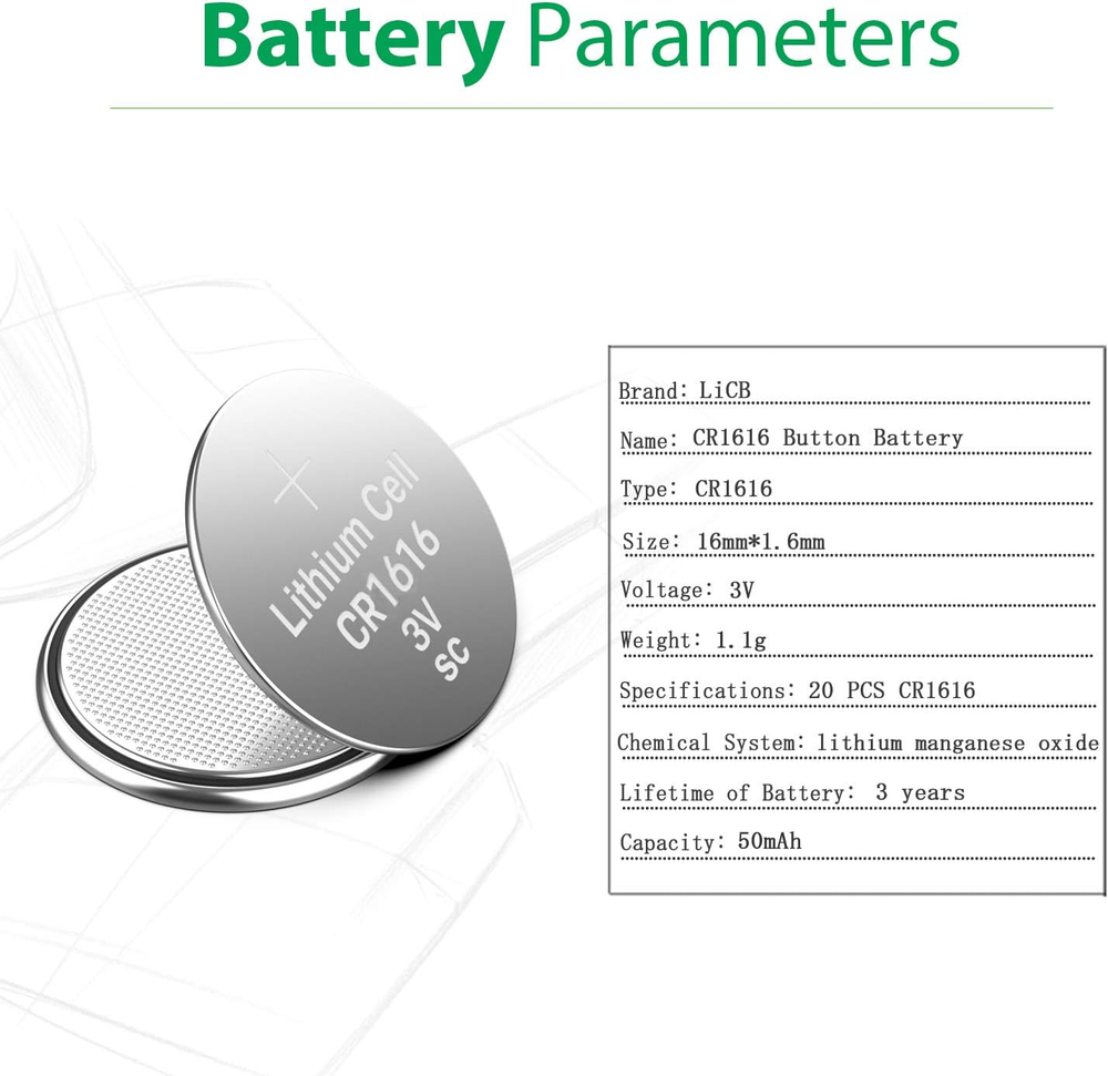SAFE AND RELIABLE: LiCB Since 2006,Specialize in Battery 12 Years. CR1616 Button Coin Cell Tested under Strict Quality Control Standards. CE and ROHS Certified. Grade A cells CR1616 Ensure Longer Battery Life and Long Lasting Power. Long-Lasting AND COST-SAVING:Get the 20 PCS Exact Fresh CR1616 Battery, Have Full 3 Volts Charge, 3 Years Shelf Life. Safety AND LEAK FREE -- Zero Mercury LiCB CR1616 Batteries Offer Premium Performance in a Variety of Devices. LiCB Batteries are Designed not to Leak in Devices During Their Usage and for up to 3 Years after They are Left in a Device. MULTIPLE COMPATIBILITY : Equivalent to other Brand Models, Like 1616 CR1616 DL1616 ECR1616 BR1616 and Works Perfect for Remote Control, Watch, Calculator,Electronic Notebook,Thermometer, Mobile game. What You Get: 20 PCS CR1616 Batteries in Exact Blister Pack.18-month Warranty and Friendly Customer Service. LiCB CR1616 Battery,Long-Lasting & High Capacity CR1616 Lithium Batteries,3 Volt Coin & Button Cell ( 20-Pack)
