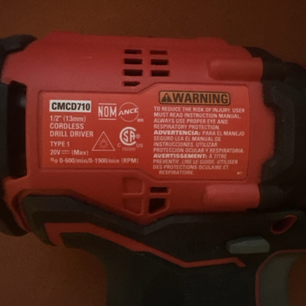 This is a Craftsman 20V CMCD710 Brushless Drill with a 1/2" keyless chuck, operating at 1900 RPM. It is a cordless drill powered by a 20V battery. The model does not come with a battery included. This drill is designed for various drilling tasks in workshops and homes. Very lightly used