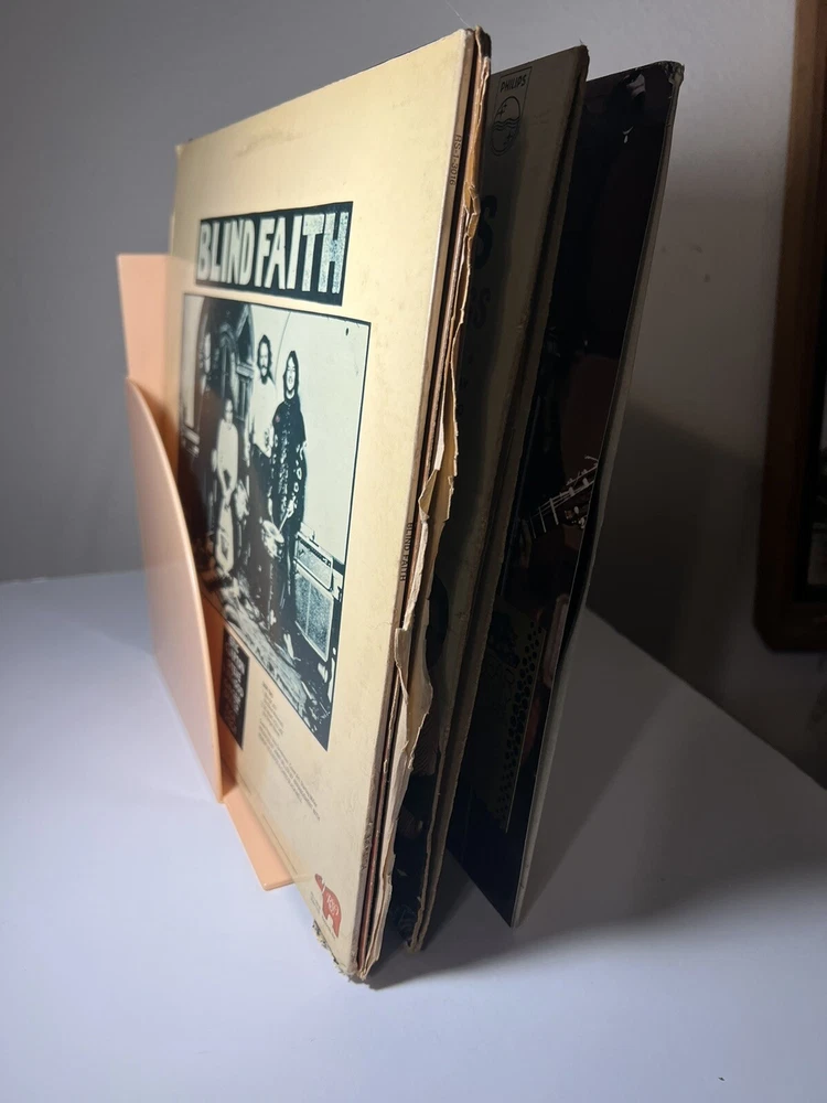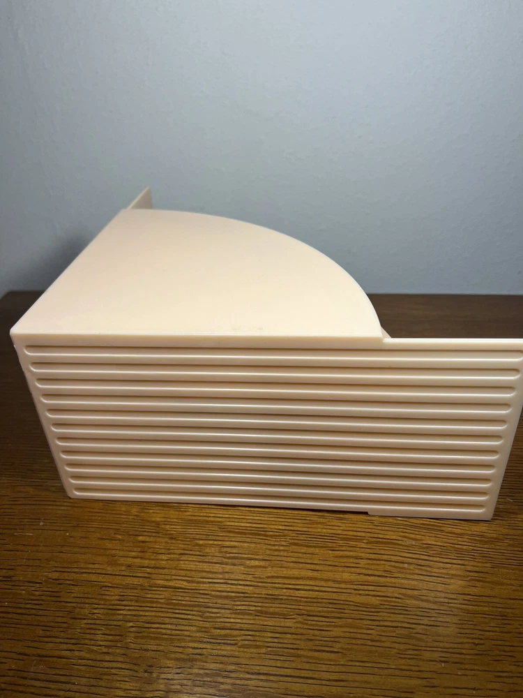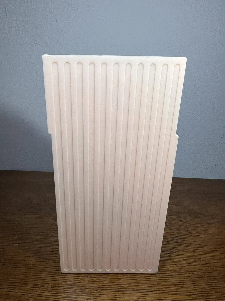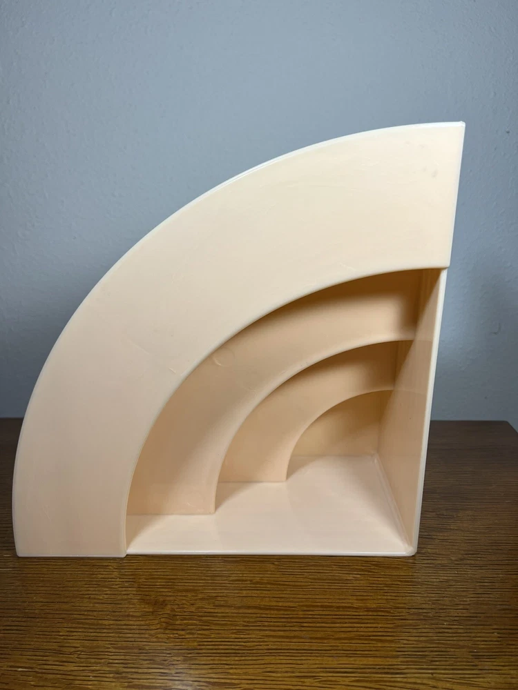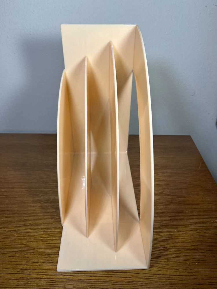 This vintage CRAYONNE LP magazine rack is a must-have for any mid-century modern collector. The peachy pink plastic material adds a pop of color to any room and the LP/magazine/record size is perfect for displaying your favorite records or reads. The rack was manufactured in the 1960s, making it a true retro piece. Use it to hold your LP collection or as a decorative piece in your home. Excellent condition.