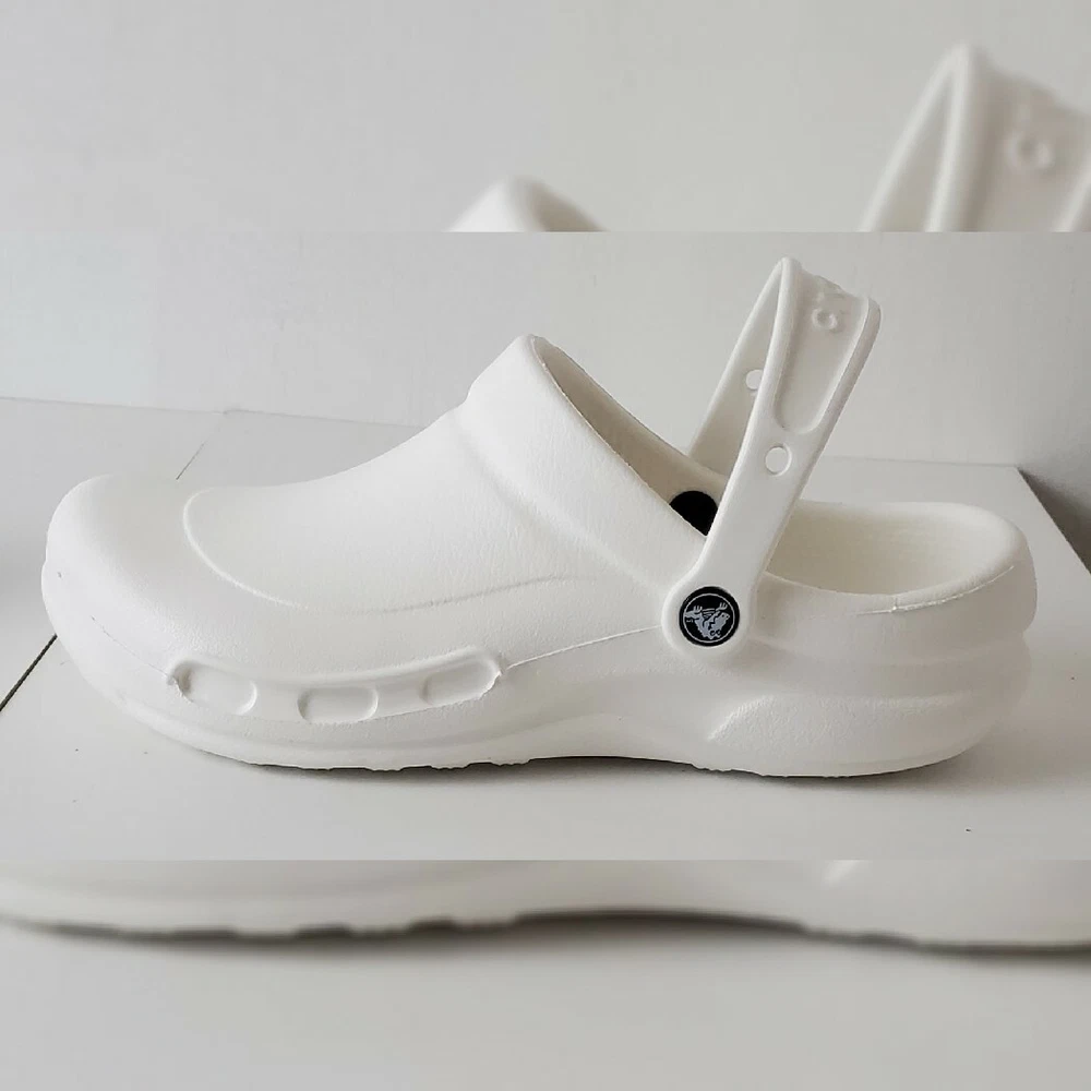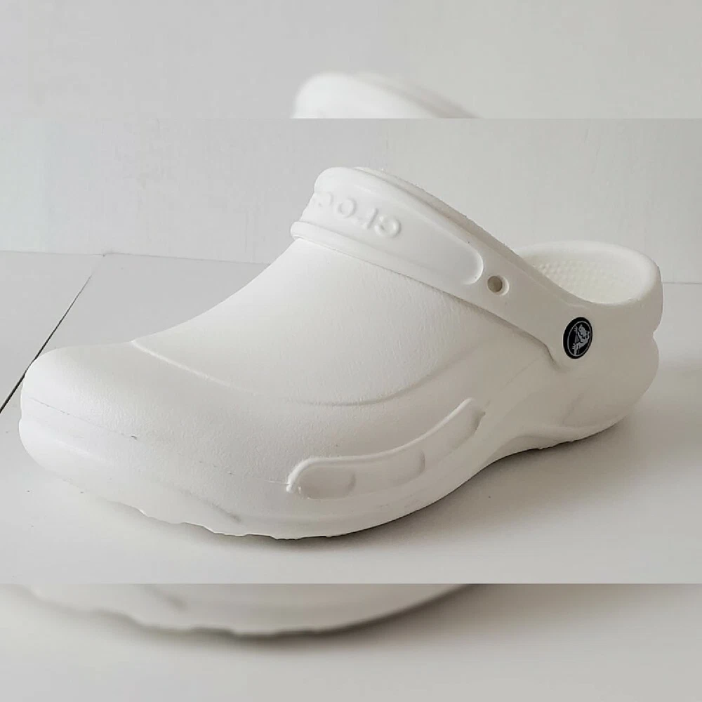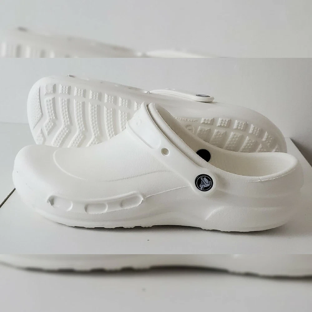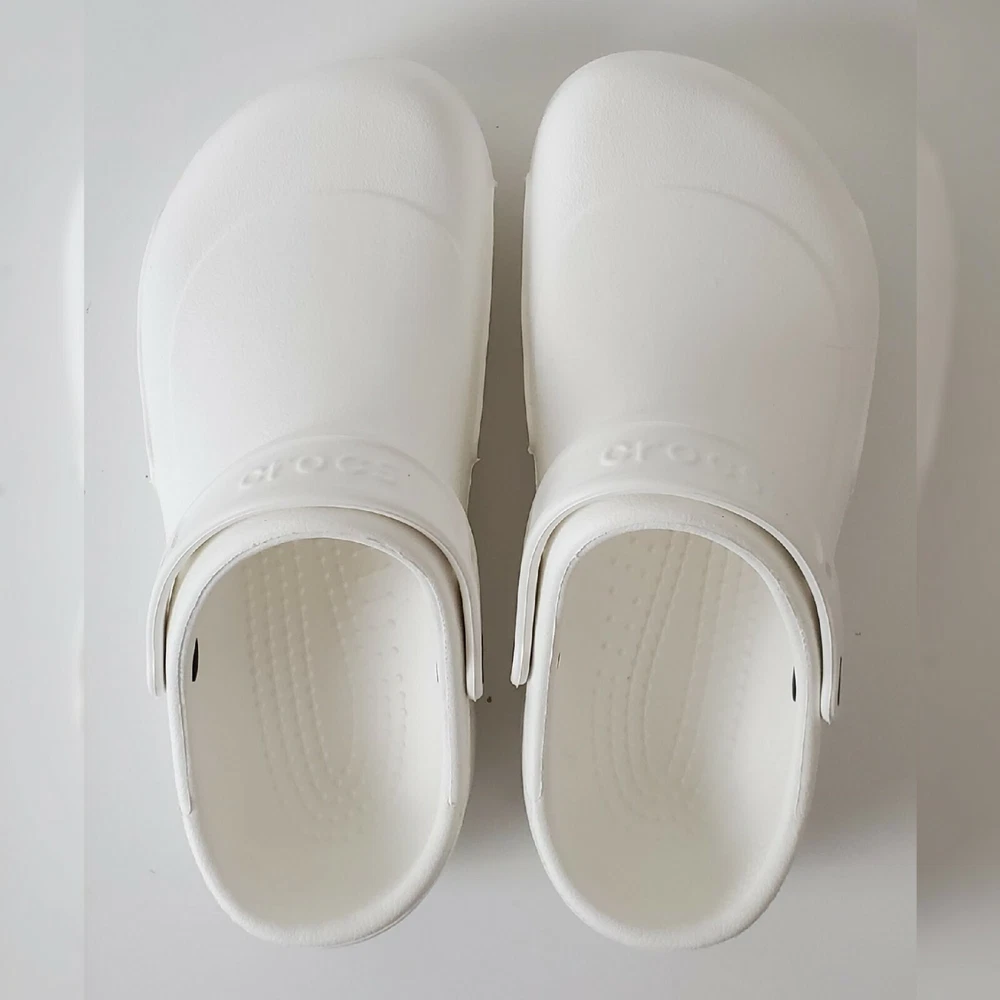 CROCS AUTHENTIC AT WORK ESPECIALIST CLOG SHOES SANDALS MEN'S WOMEN'S CERTIFIABLY COMFORTABLE SIZE M8 W10 WHITE LIGHTWEIGHT NEW WITH TAGS. The Crocs™ Specialist CLOGS, work shoes that let your feet breathe. With an increased metatarsal area, this clog offers additional protection for the top of your foot. A croslite™ footbed, closed heel and raised edging around the portals make this the perfect shoe for work. New professional styling creates the ultimate comfort shoe for the workplace. Designed to meet workplace standards with a closed heel. Exclusive croslite™ material conforms to foot creating a custom fit. Supportive arch and footbed circulation nubs ensure all-day comfort. Side ventilation ports promote airflow and are inset to protect foot from spills. Thicker metatarsal area helps protect the top of the foot. Loose fit allows foot to bend and expand naturally. Odor resistant and bacteriostatic. Simply sterilize and clean in water and bleach.FEATURES EVA upper Slip-on with pivoting strap Round toe Croslite™ foam contoured EVA footbed EVA sole Imported
