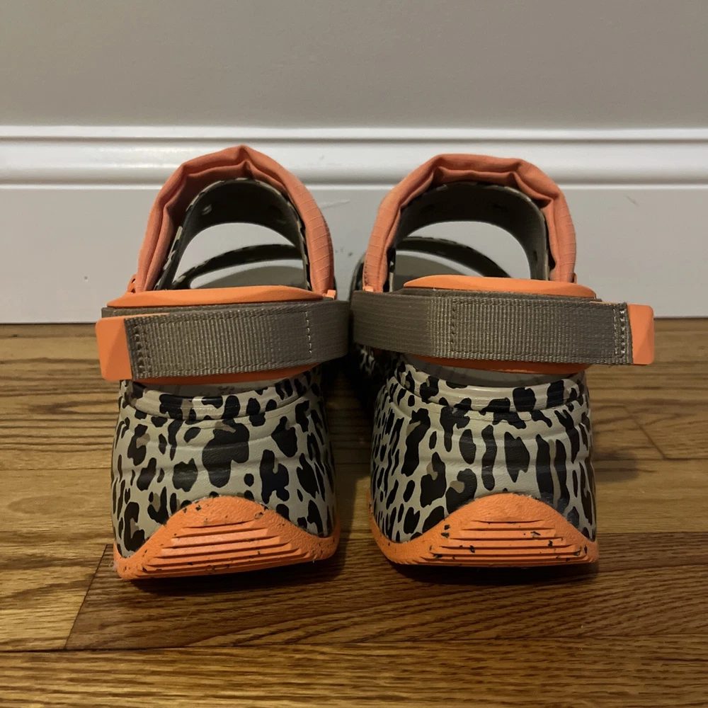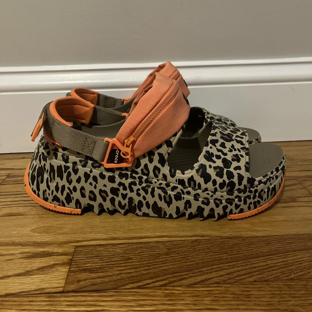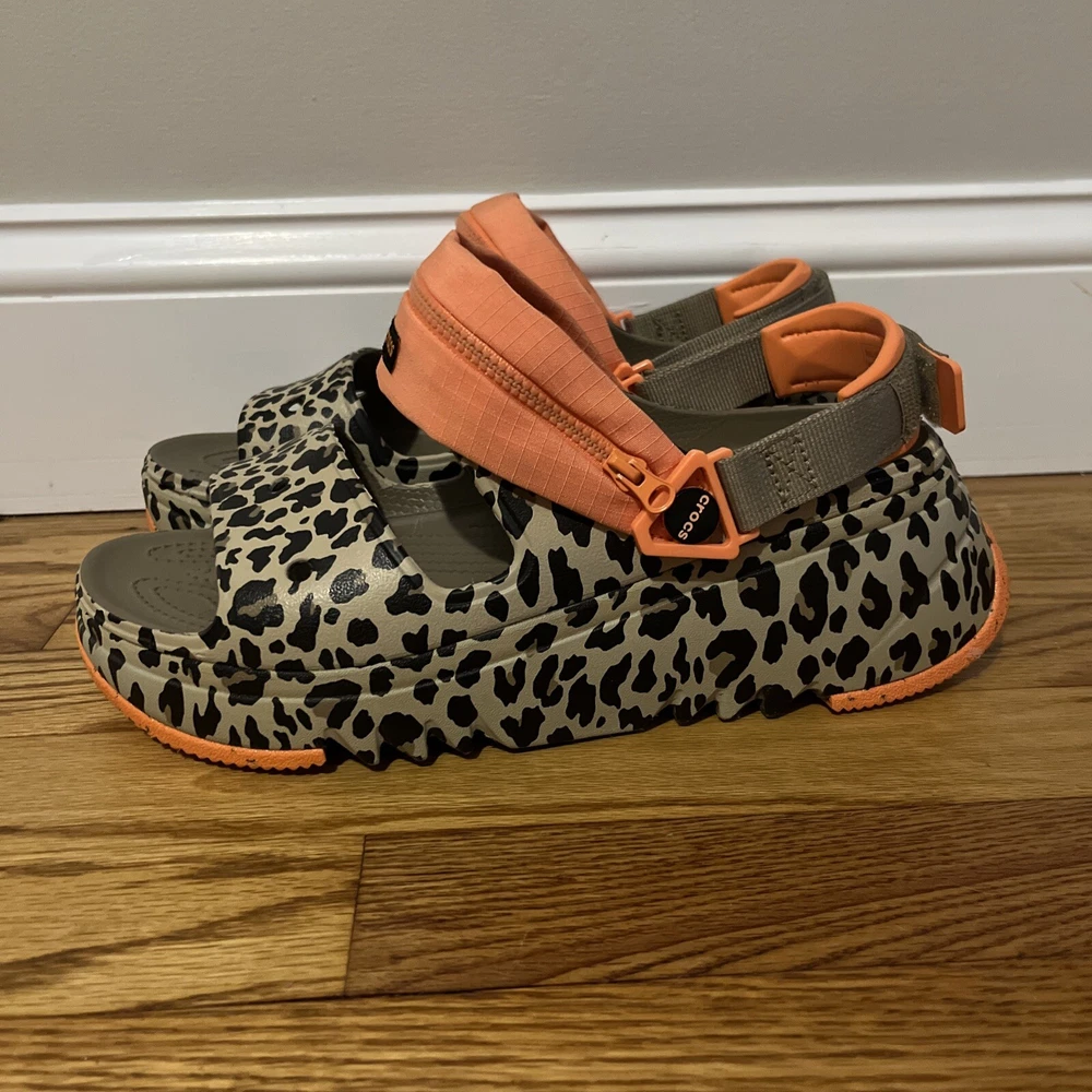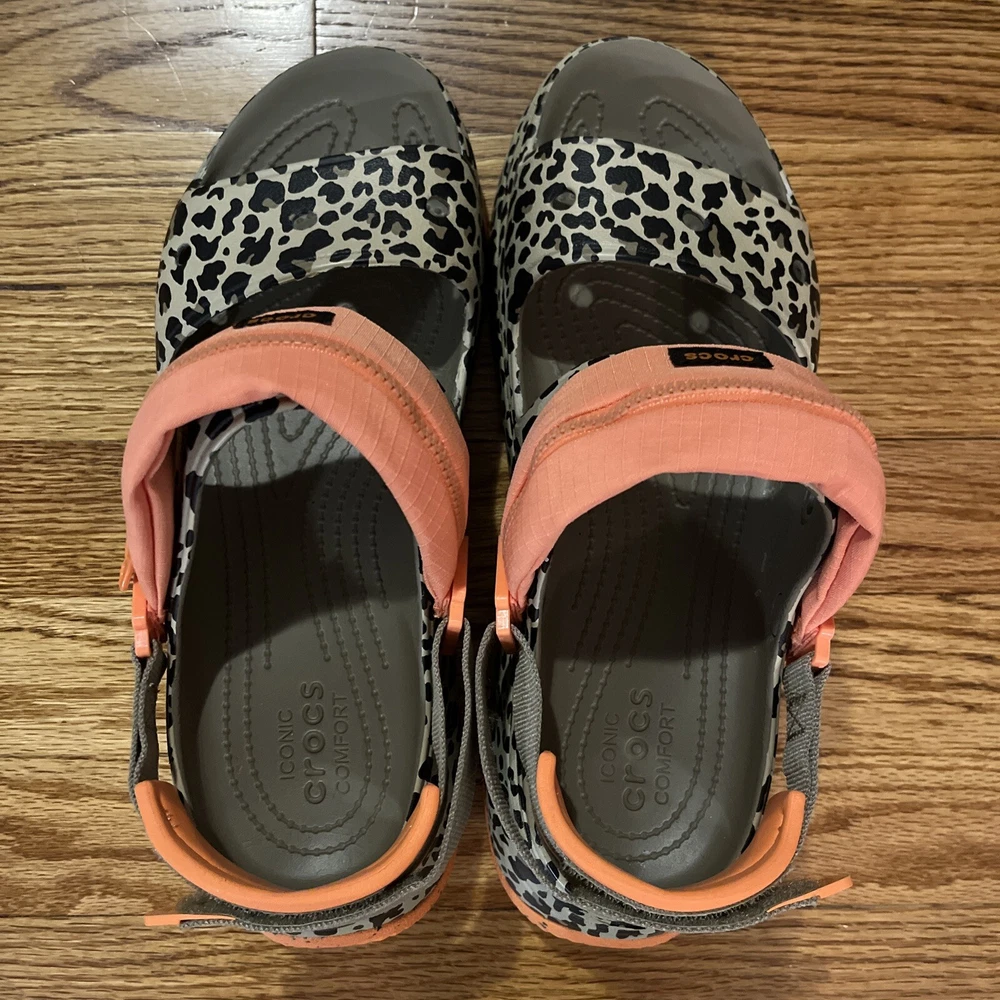 Ships Fast! Elevate your summer style with these limited edition Crocs Hiker Xscape Animal Sandals in Khaki Leopard. The unisex sandals feature a lightweight flexible upper material, ankle strap, and comfortable wedge heel style. The multicolor animal print pattern and platform accents add a touch of fun and the water-resistant design makes them perfect for any outdoor adventure. These sandals are customized with a mid-height of 2-2.9 inches and a medium width of M. The Crocs Mega Crush Clog product line ensures durability and the breathable material allows for optimal air circulation. Whether you're headed to the beach or a hiking trail, these sandals are the perfect choice for any anime-themed outfit.