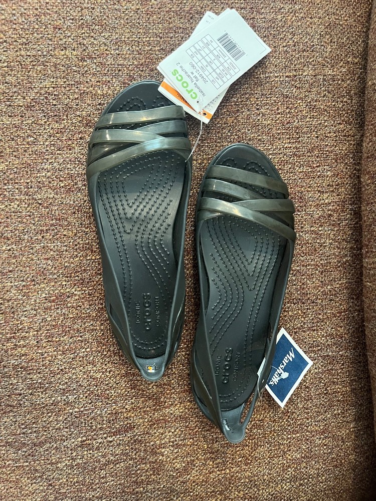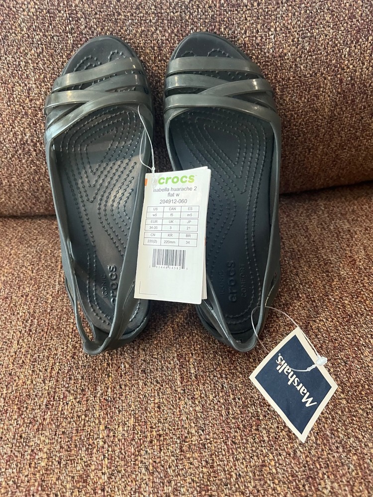 The CROCS Isabella Huarache 2 Flat Women's Slip On Black Sandals in size 5 feature a comfortable flat heel with a soft footbed and criss-cross accents for added style. These sandals are perfect for travel, activewear, and casual occasions.various seasons like The rubber outsole and PVC lining ensure durability and a secure fit, while the classic black color and strappy design add a touch of sophistication to any outfit. Hard to find in new condition as they are a retired style. PLEASE ASK ANY AND ALL QUESTIONS BEFORE BIDDING. Payment is expected within 24 hours of auction's end