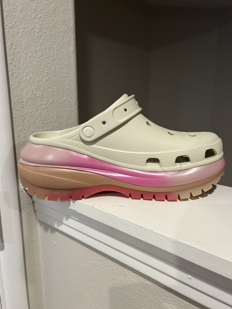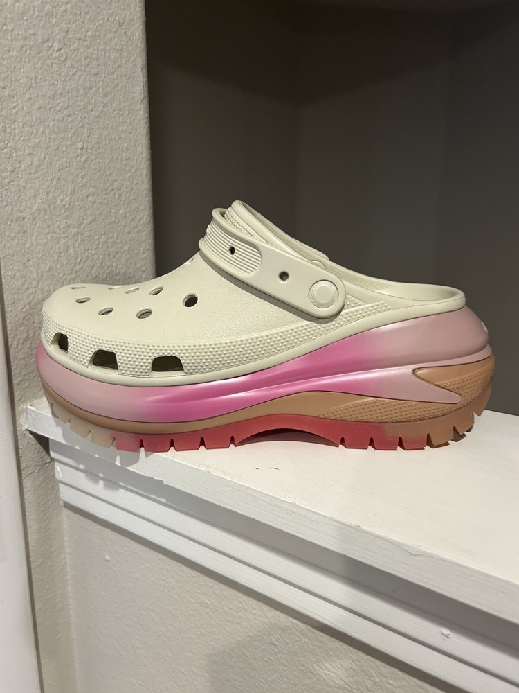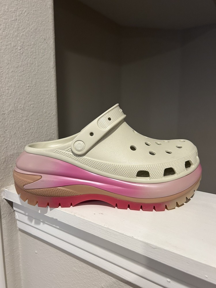 These Crocs Mega Crush Platform Clogs in Bone color are a limited edition women's size 11. They feature a slip-on style with a solid pattern and a lightweight design. The synthetic resin upper and lining material offer comfort and durability, while the eva outsole provides traction. These clogs have a classic clog style with a platform heel, making them a stylish and practical choice for everyday wear.