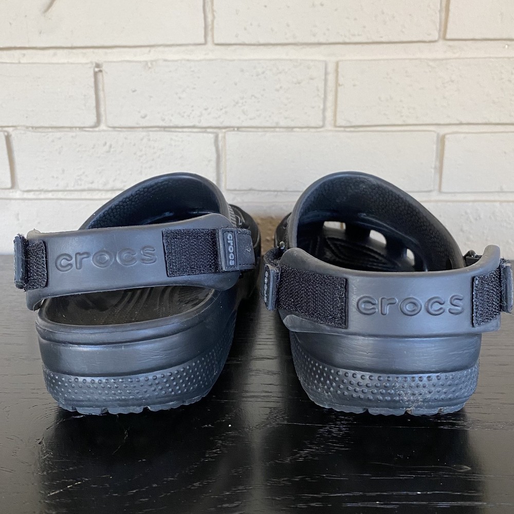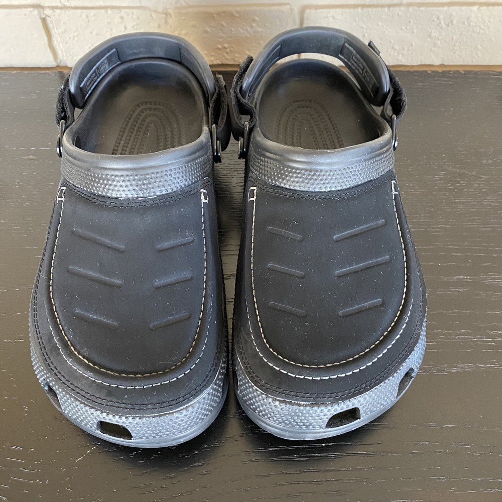 The CROCS Men's Classic Yukon Vista II Clog Sandal in Black is perfect for any casual or outdoor activity. The slip-on style and hook & loop closure make them easy to wear and the synthetic leather upper material provides a comfortable fit. The rubber outsole and synthetic lining material ensure durability and breathability, making them suitable for beach, hiking, or travel occasions. These sandals also feature an adjustable and rugged design with a classic solid pattern and logo accents. The medium shoe width and rubber insole material add to the overall comfort of the shoe. The Yukon Vista product line and crocs brand name provide a reliable and stylish addition to any wardrobe.