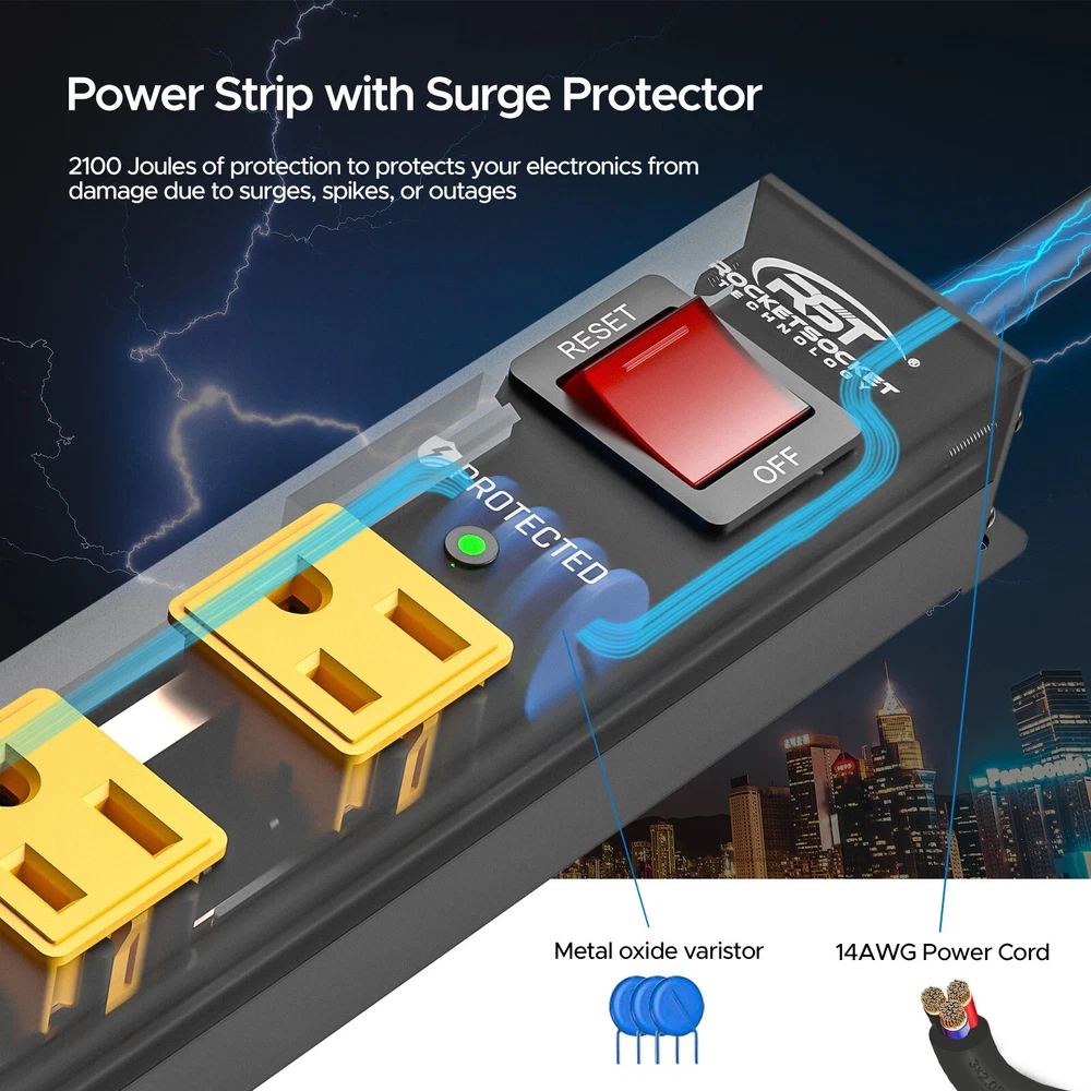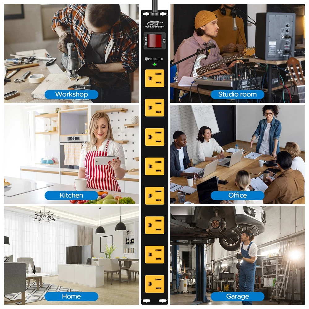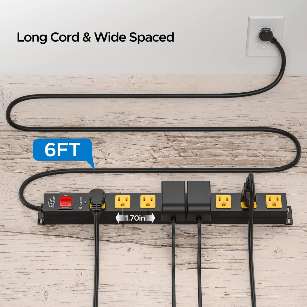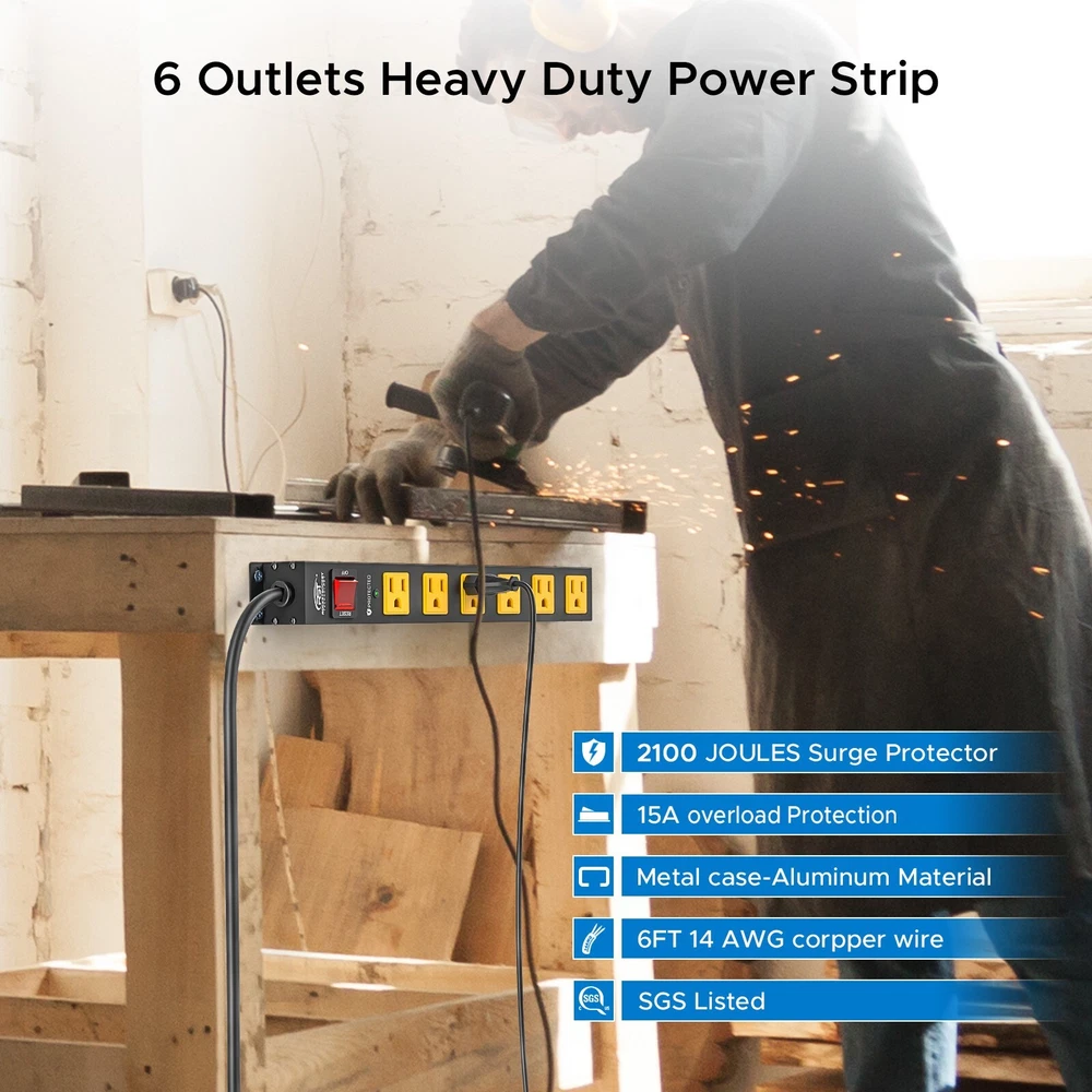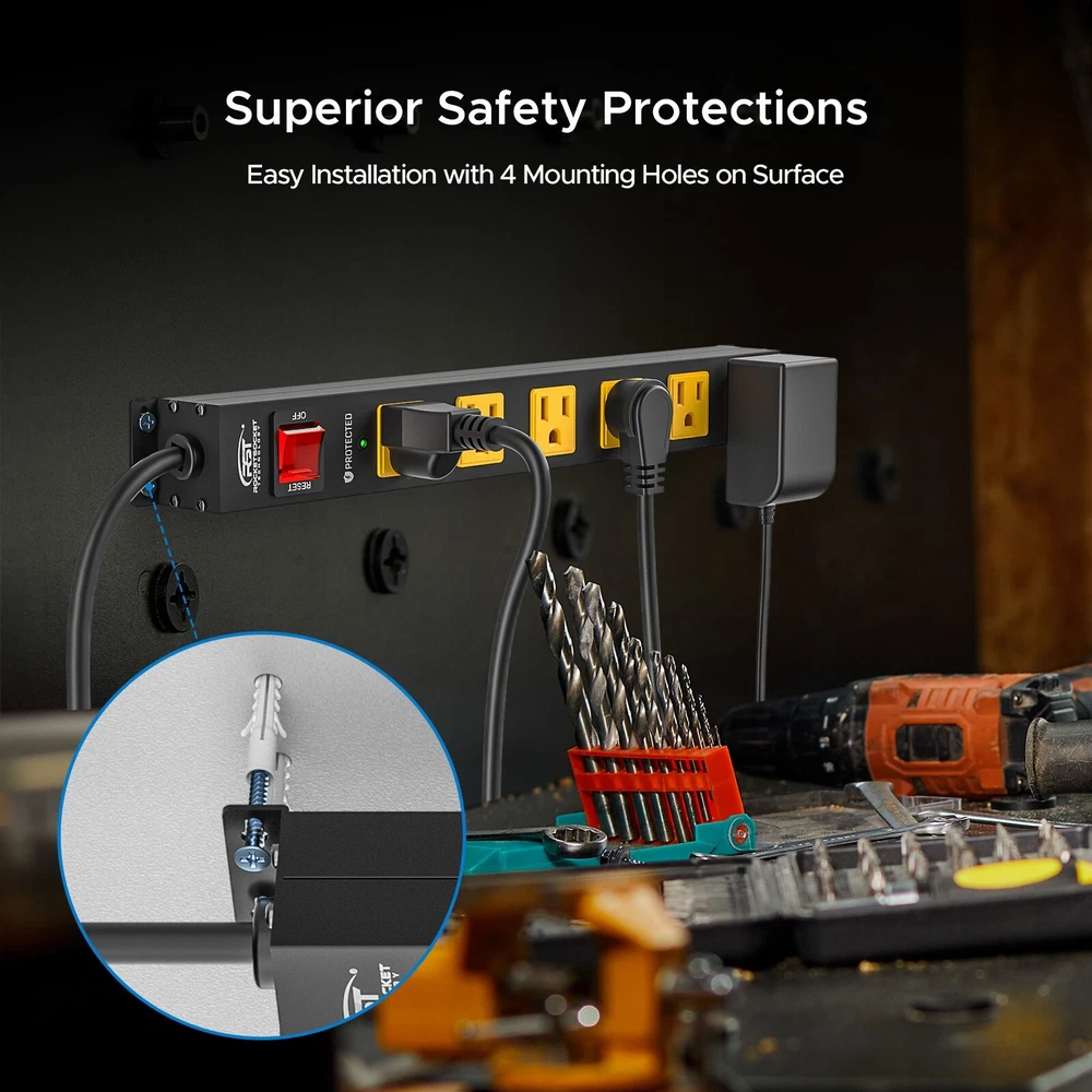 [Metal Heavy Duty] 1.5mm extra-thick aluminum alloy housing and reinforced engineering plastic covers make it extremely strong and durable. 6 Feet Extension Cord UL is listed for better corrosion and oil resistance, and 15AMP/14AWG SJT grade wire supports up to 125V/1875W of power. [All-round Protection] 2100 joules of protection to protect your electronics from damage due to surges, spikes, or outages. 15 Amp circuit breaker is equipped to instantly react to catastrophic events and overloads, providing maximum protection. [Humanized Design] Wide-spaced 1.7-inch center-to-center outlet, perfect for bulky plugs and power supplies. 45° angled flat plug, and mounting supported hanging slots, all these features improve the user experience in detail and bring you more convenience. [Versatility] - Makes it an ideal choice for a wide range of settings, including homes, garages, and workshops. Whether you're working on a DIY project in your garage, or running power tools and machinery in your workshop, this metal power strip can handle it all. [ECO-friendly & 18-month Warranty] The easy-to-recycle aluminum profile housing and controlled switch make it an excellent environmentally friendly product. You will get worry-free 18-month warranty, $3,000,000 product liability insurance, and friendly customer service. CRST 8-outlet Metal Mountable Power Strip Surge Protector With switch, flat plug, hook&Loop cord zip tie CRST 2023 new design heavy-duty metal surge protector power strip, suitable for home, office, garage, school, shop, studio, workshop, factory, multimedia studio, etc. 2100 Joules surge protection and 15A overload protection 15 Amp circuit breaker is equipped to instantly react to catastrophic events and overloads Metal housing strong and durable Four external mounting hole 6 feet long 14 AWG heavy-duty extension cord reel 8 outlets with switch-1875W Easy Installation Comes Equipped with Four External Mounting Hole That Makes it Easy to Install on a Variety of Surfaces, Including Desks, Walls, and Workbenches. Once Mounted, the Power Strip Can be Securely Fixed in Place, Ensuring That it Stays Put Even with Heavy Use. Wide Spaced 1.7-inch Spacing is the Perfect Solution for Cluttered Spaces. With Enough Room to Accommodate Multiple Appliances, You No Longer Have to Choose Between Which Devices to Plug in or Unplug. Save Space Our Innovative Power Strip Features Flat Plugs Angled at 45 Degrees, Enabling You to Use Your Outlets without Blocking Adjacent Ones. This Unique Design Saves Space and Makes It Easier to Plug in Bulky Adapters and Power Cords without Crowding Your Workspace. Heavy Duty Metal Housing 1.5 mm Extra-thick Aluminium Metal Case and Reinforced Engineering Plastics Covers Make it Extremely Strong and Durable.