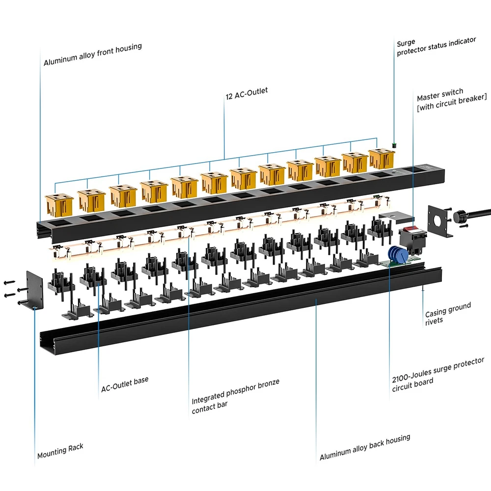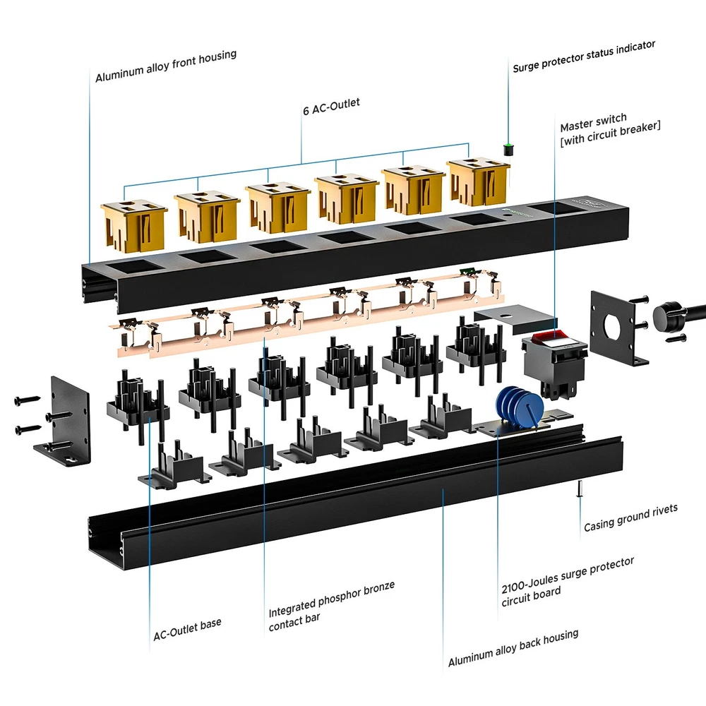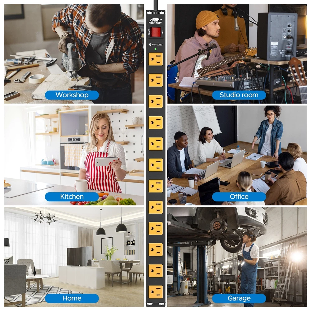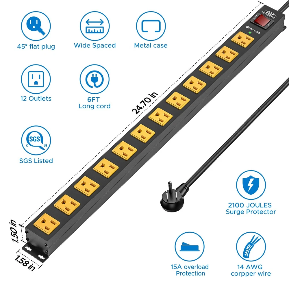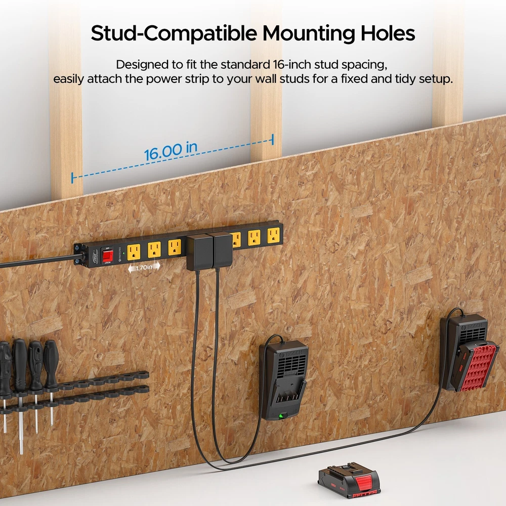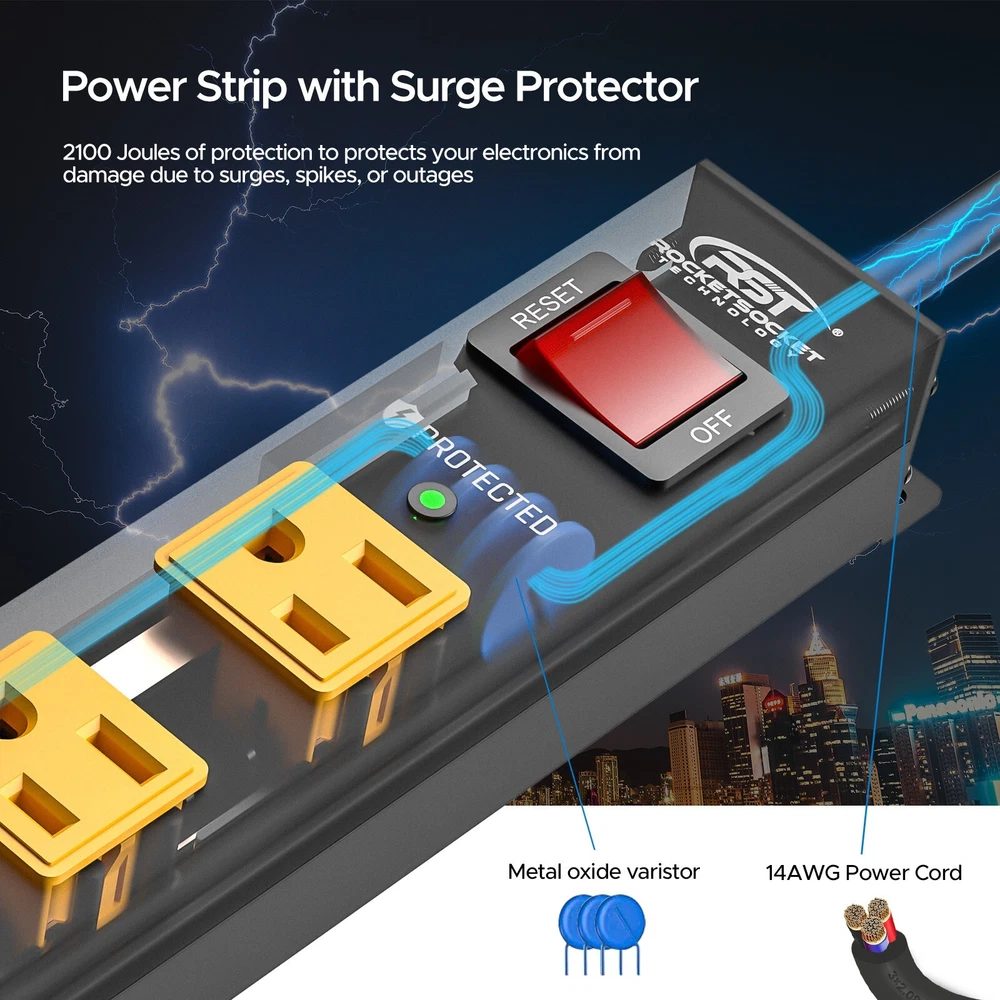 [Metal Heavy Duty] 1.5mm extra-thick aluminum alloy housing and reinforced engineering plastic covers make it extremely strong and durable. 6 Feet Extension Cord UL is listed for better corrosion and oil resistance, and 15AMP/14AWG SJT grade wire supports up to 125V/1875W of power. [All-round Protection] 2100 joules of protection to protect your electronics from damage due to surges, spikes, or outages. 15 Amp circuit breaker is equipped to instantly react to catastrophic events and overloads, providing maximum protection. [Humanized Design] Wide-spaced 1.7-inch center-to-center outlet, perfect for bulky plugs and power supplies. 45° angled flat plug, and mounting supported hanging slots, all these features improve the user experience in detail and bring you more convenience. [Versatility] - Makes it an ideal choice for a wide range of settings, including homes, garages, and workshops. Whether you're working on a DIY project in your garage, or running power tools and machinery in your workshop, this metal power strip can handle it all. [ECO-friendly & 18-month Warranty] The easy-to-recycle aluminum profile housing and controlled switch make it an excellent environmentally friendly product. You will get worry-free 18-month warranty, $3,000,000 product liability insurance, and friendly customer service. CRST 8-outlet Metal Mountable Power Strip Surge Protector With switch, flat plug, hook&Loop cord zip tie CRST 2023 new design heavy-duty metal surge protector power strip, suitable for home, office, garage, school, shop, studio, workshop, factory, multimedia studio, etc. 2100 Joules surge protection and 15A overload protection 15 Amp circuit breaker is equipped to instantly react to catastrophic events and overloads Metal housing strong and durable Four external mounting hole 6 feet long 14 AWG heavy-duty extension cord reel 8 outlets with switch-1875W Easy Installation Comes Equipped with Four External Mounting Hole That Makes it Easy to Install on a Variety of Surfaces, Including Desks, Walls, and Workbenches. Once Mounted, the Power Strip Can be Securely Fixed in Place, Ensuring That it Stays Put Even with Heavy Use. Wide Spaced 1.7-inch Spacing is the Perfect Solution for Cluttered Spaces. With Enough Room to Accommodate Multiple Appliances, You No Longer Have to Choose Between Which Devices to Plug in or Unplug. Save Space Our Innovative Power Strip Features Flat Plugs Angled at 45 Degrees, Enabling You to Use Your Outlets without Blocking Adjacent Ones. This Unique Design Saves Space and Makes It Easier to Plug in Bulky Adapters and Power Cords without Crowding Your Workspace. Heavy Duty Metal Housing 1.5 mm Extra-thick Aluminium Metal Case and Reinforced Engineering Plastics Covers Make it Extremely Strong and Durable.