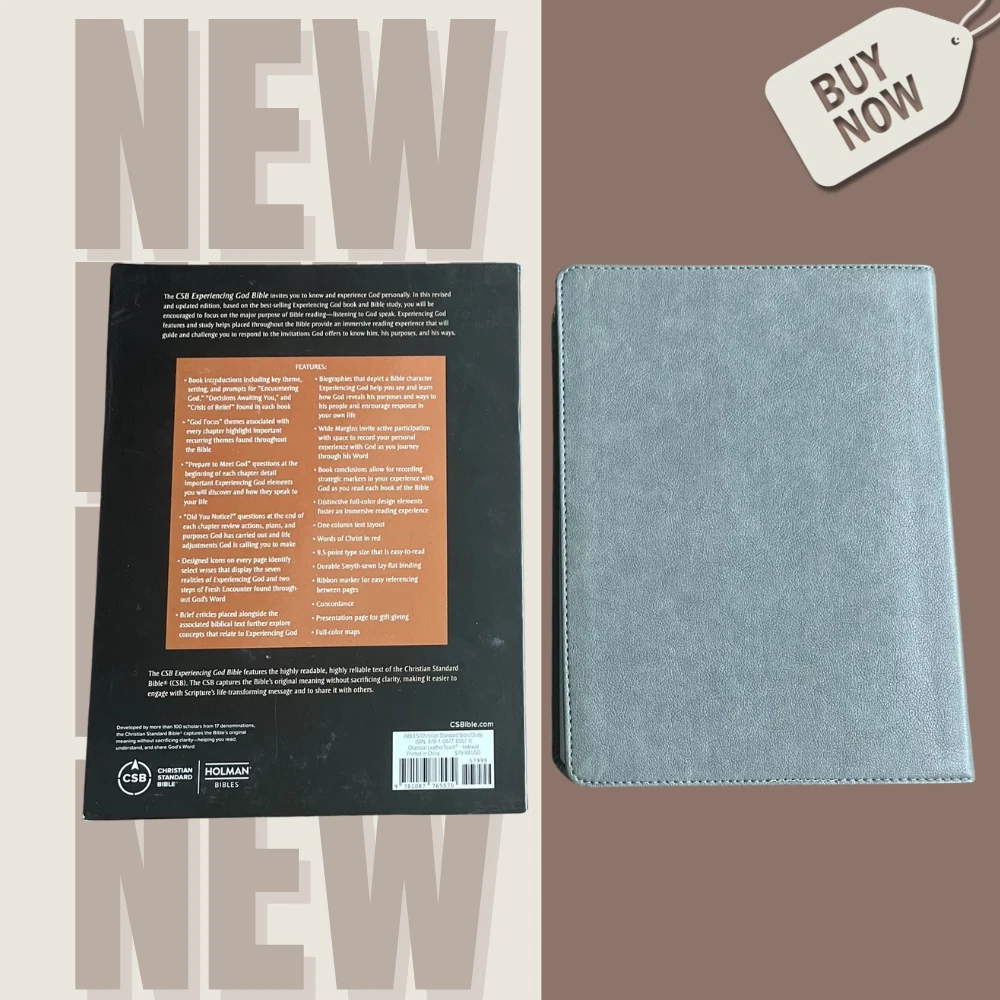 CSB Experiencing God, Charcoal Leather| 9781087765563 | SEALED | FREESHIP | AUTH This product is brand new with a sealed box. Will be shipped fast and securely! DETAIL The CSB Experiencing God Bible invites you to know and experience God personally. In this revised and updated edition, based on the best-selling Experiencing God book and Bible study, you will be encouraged to focus on the major purpose of Bible reading—listening to God speak. Experiencing God features and study helps placed throughout the Bible provide an immersive reading experience that will guide and challenge you to respond to the invitations God offers to know him, his purposes, and his ways. FEATURES: Book introductions including key theme, setting, and prompts for “Encountering God,” “Decisions Awaiting You,” and “Crisis of Belief” found in each book “God Focus” themes associated with every chapter highlight important recurring themes found throughout the Bible “Prepare to Meet God” questions at the beginning of each chapter detail important Experiencing God elements you will discover and how they speak to your life “Did You Notice?” questions at the end of each chapter review actions, plans, and purposes God has carried out and life adjustments God is calling you to make Designed icons on every page identify select verses that display the seven realities of Experiencing God and two steps of Fresh Encounter found throughout God’s Word Brief articles placed alongside the associated biblical text further explore concepts that relate to Experiencing God Biographies that depict a Bible character Experiencing God help you see and learn how God reveals his purposes and ways to his people and encourage response in your own life Wide Margins invite active participation with space to record your personal experience with God as you journey through his Word Book conclusions allow for recording strategic markers in your experience with God as you read each book of the Bible Distinctive full-color design elements foster an immersive reading experience Two-column text layout Words of Christ in red 9.5-point type size that is easy-to-read Durable Smyth-sewn lay-flat binding Ribbon marker for easy referencing between pages Concordance Presentation page for gift-giving Full-color maps The CSB Experiencing God Bible features the highly readable, highly reliable text of the Christian Standard Bible® (CSB). The CSB stays as literal as possible to the Bible’s original meaning without sacrificing clarity, making it easier to engage with Scripture’s life-transforming message and to share it with others.