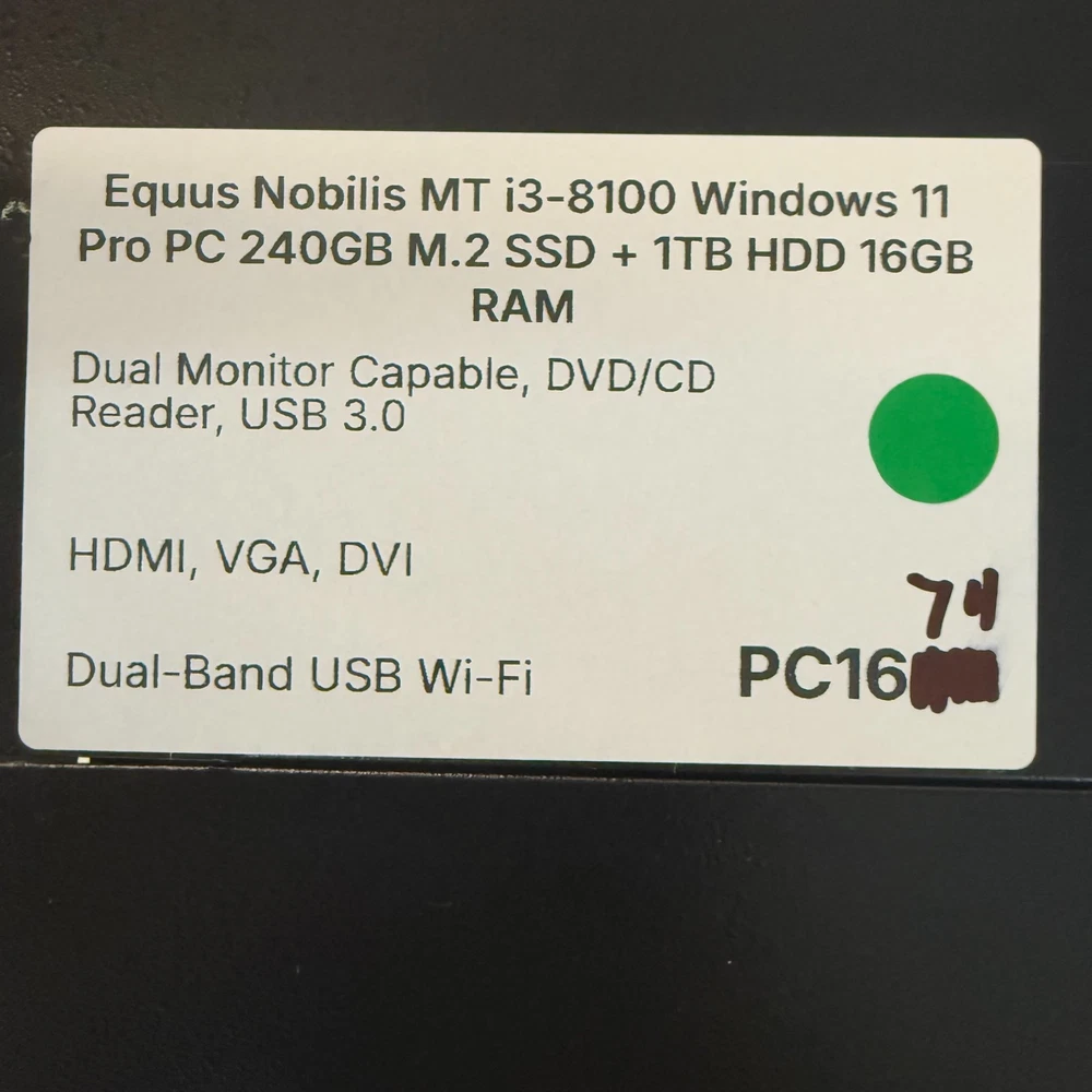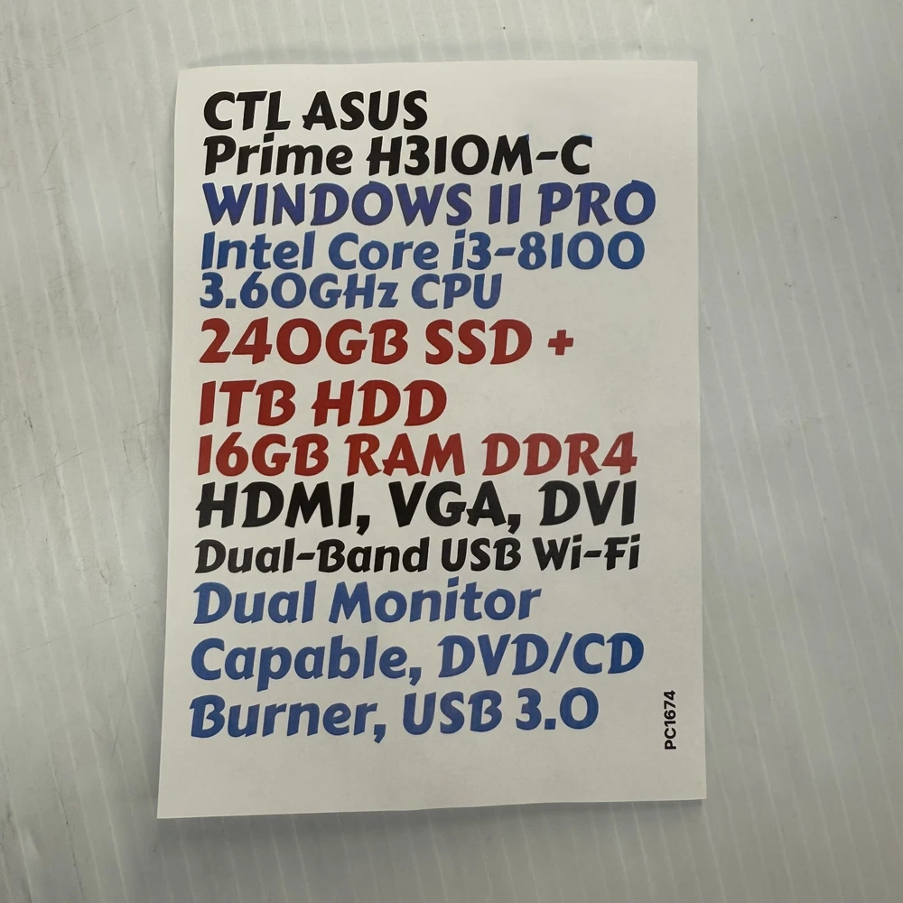 Professionally refurbished with a fresh, activated install of Windows 11 Pro 64-bit (25H2, latest version). This PC is fully tested and boots up fast thanks to the SSD Drive. As a refurbished, pre-owned unit, it may show light cosmetic wear, such as light scratches or scuff marks. Top surface has a few small dents. Sides and front may have scratches. This is a CTL Box with an ASUS Prime H310M-C Motherboard Inside. Fast Dual-Band, USB Wireless (Wi-Fi) Adapter Included! 13" Tall, x 12" Deep, x 5.5" Wide CTL ASUS Prime H310M-C Intel Core i3-8100 3.60GHz CPU 240GB SSD + 1TB HDD 16GB RAM DDR4 Video Outputs: HDMI, VGA, DVI DVD/CD Burner Gigabit Ethernet, Audio Jack, & Dual Monitor Capable, DVD/CD Burner, USB 3.0 It will be packed carefully.