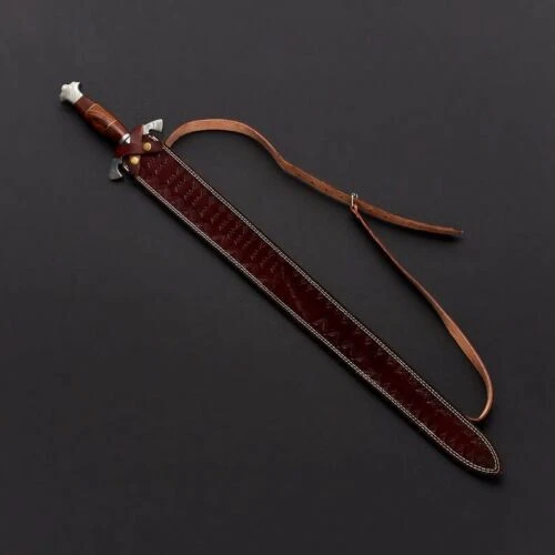 Materials DAMASCUS STEEL, BLACK HORN, LEATHER SHEATH Read the full description Description Hand Forged Celtic-Norse-Gladiator Sword- Medieval Viking Damascus Steel Custom Handmade Swords are individually hand forged in North America to look, feel and perform as the originals. Our ongoing commitment to painstakingly recreate each sword has made us popular among museum curators, collectors and re-enactment communities around the world. Hand-made with the finest material and forged from Damascus Steel. Our Medieval Viking Swords cater to the most discriminating collector, searching for a dependable and authentic medieval sword that are built to last. Features: Viking Sword Double Edge Free Leather Sheath Free Personalization Name or Runes or Logo Sword Size and Material Blade Material Damascus Steel Handle Material Black Horn Overall Length 32 inch typical Viking sword, this blade is ideally suited for a respectable and strong Viking Warrior. Classic and historical in its design, the Warriors Viking Sword with Scabbard is a straight-forward blade that was designed for war. This sword features a design that is typical of a classic Viking sword, featuring a large pommel to counterbalance the weight of a broad blade, as well as a narrow guard that is typically no longer than the width of the pommel. Where this blade differs is in its rich design. The pommel is a grand, subtly curved triangle shape with impressive textural designs, which are echoed and matched on the thick, gently curved guard. The grip is colored brown and wrapped to ensure a comfortable hold. The blade is straight and broad, featuring a deep fuller that runs the length of the blade, starting just above the guard and ending just shy of the blades point. Both the pommel and the guard are made from polished brass metal. Included with the sword is a matched scabbard, which features brass decorations along the throat, as well as a small brass chapel. The rest of the scabbard is brown, to match the swords grip. A Viking weapon could be considered a personal badge of honor, with greater weapons belonging to more noteworthy warriors. If that is the case, than this Warriors Viking Sword with Scabbard must be fit for a brave and highly skilled warrior indeed, as this is a weapon worthy of being openly displayed, both at your side and in your home