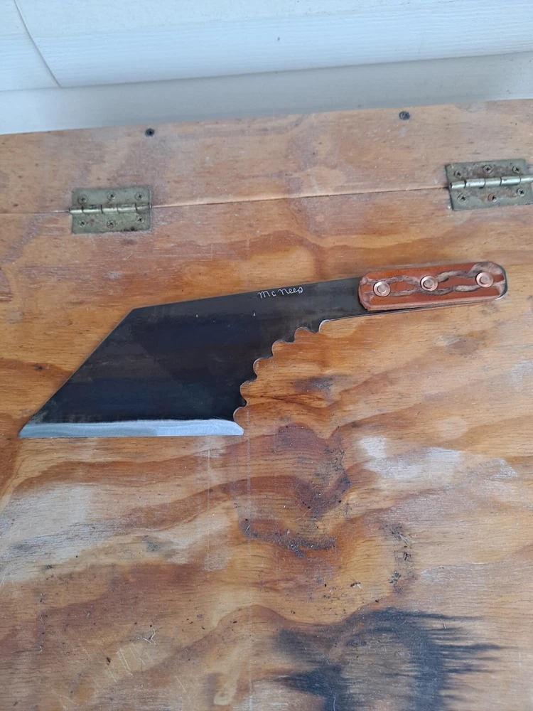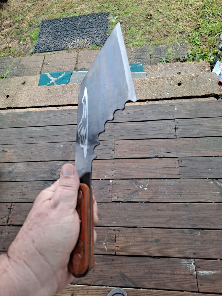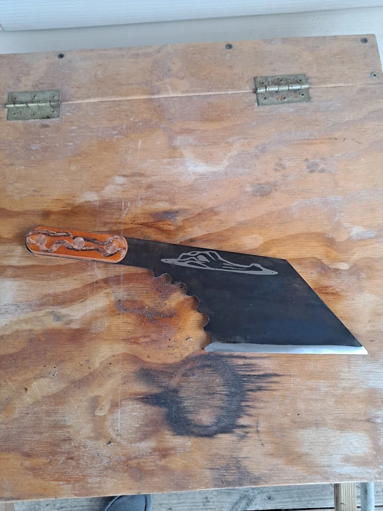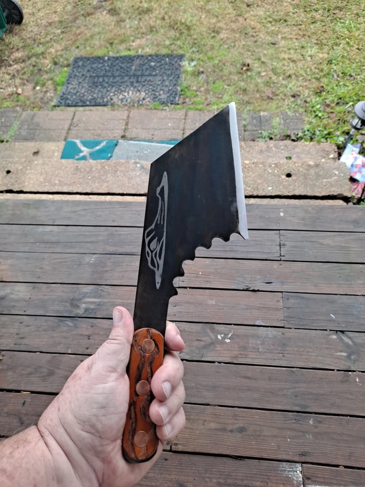 Here is a nice throwing or camp cleaver, made from high quality saw blade...14.5" x 14.5 oz with a 5.75" blade.. has my iron sole leather scales..perfect weight to length for perfect throwing. made right here in alabama... should be 18 to purchase. Thanks for looking