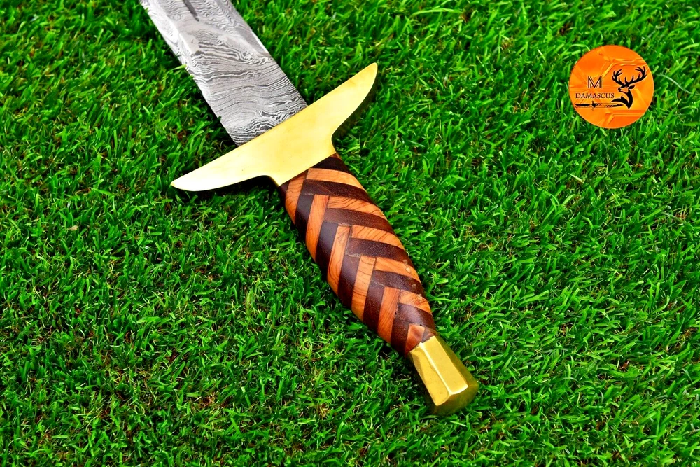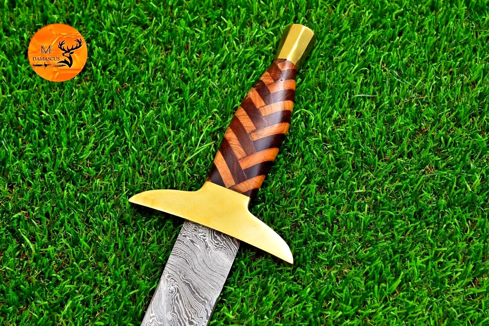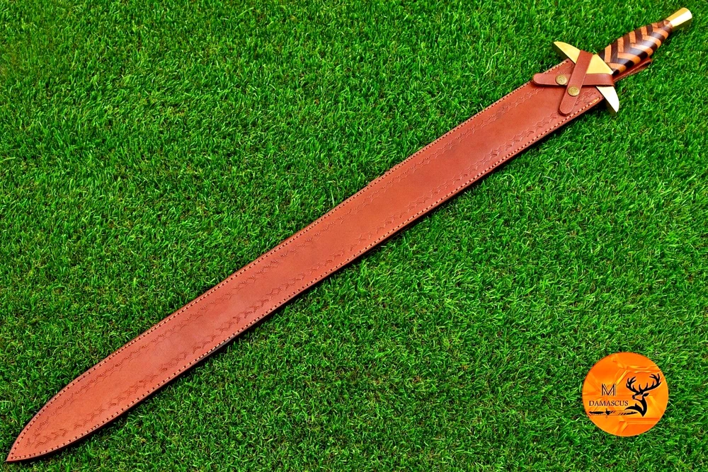 CUSTOM HAND MADE DOUBLE EDGE BLADE HAND FORGED DAMASCUS STEEL SWORD Wood & Brass Guard Handle This superb design Sword is hand forged. Blade of this Sword has a nice file work and is made of 512 layers of 4340 stainless steel and 1075 high carbon steel and hardness 55-58 HRC . This robust Sword is lab tested under intense conditions, the balance and shape of this Sword ensures perfect grip. Overall Length: 38” Inches Blade Length: 31” Inches Handle Length: 7” Inches Damascus Design: Twist Pattern Layers: 512 Package Includes: with Leather Sheath Bag Warning: Keep fingers clear of blades. Store away from children.