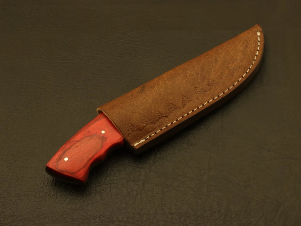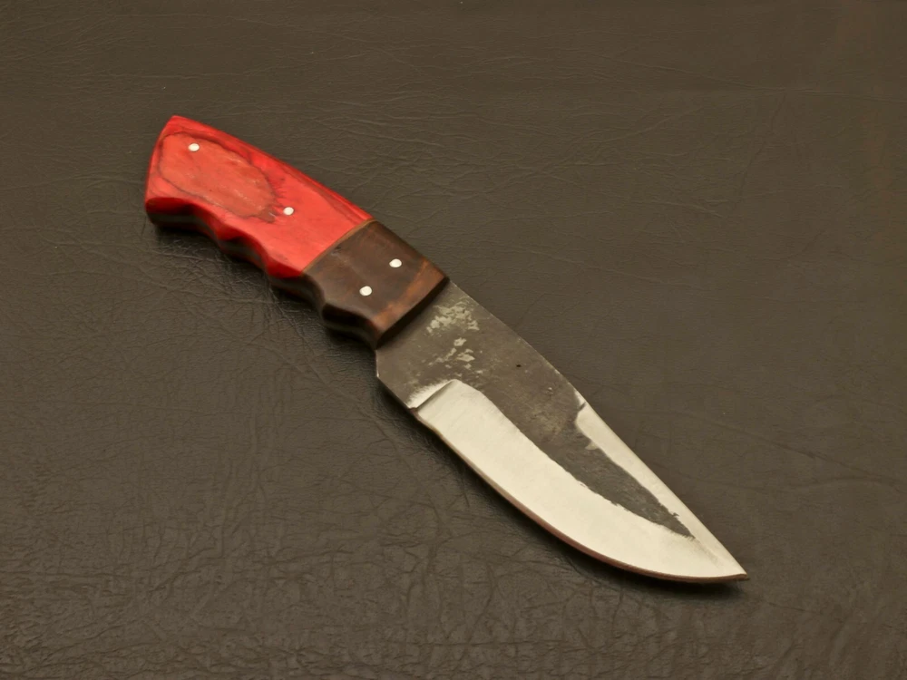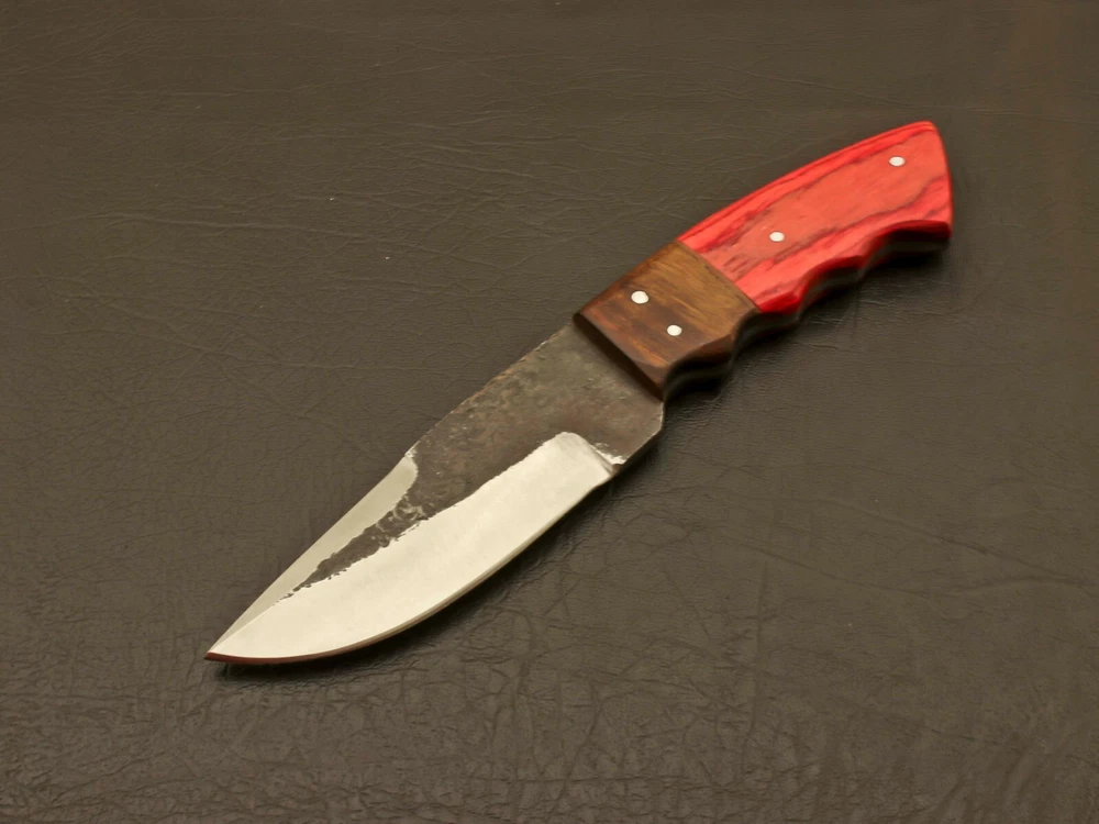SUPERB LOOKING HANDMADE FORGED RAILROAD SPIKE CARBON STEEL FIXED BLADE KNIFE Superb Looking Handle of this Unique Knife is made of Beautiful Hard Wood & Rose Wood Scales fastened with steel pins and strong epoxy for life time durability. Blade has given excellent heat treatment and rock well hardness of the blade along its edge is 50 to 54 and along the spine is 42-45. All of our knives are 100% hand crafted. True quality material used to form the blade. The handle materials, blade steels, and leather sheaths are made professionally with no expense spared. Great handle fitting, exception sharp edge, nicely balanced grasp the best part? This hunting knife comes complete with a genuine leather sheath for easy storage and quick access, making it the perfect gift for anyone who loves outdoor activities, from camping and hiking to hunting and fishing. So why wait? Add this classic boot knife to your EDC kit today and experience the quality and craftsmanship that only a truly exceptional knife can offer. Overall Length: 8.5” Inches Blade Length: 4.5 ”Inches Handle Length: 4.0"Inches Handle Material : Wood Sheath : Leather Hardness : 58-60 HRC Care Instructions: Keep the blade dry after each cleaning. Warning : Take care when removing product from packaging. Keep fingers clear of blades. Store away from children. Complimentary gift messages *Gift wrapping service available for minimal additional fee ADD ONS: *Custom orders for 10 or more pieces. You can choose & submit your own handle or design. LIFETIME WARRANTY No premium knife is complete without a lifetime warranty; our masterpiece knife is fully covered for life, We do sell wholesale, please contact us for special discounts on bulk orders. FEEDBACK POLICY: YOUR FEEDBACK IS VERY IMPORTANT FOR US, IF THEIR IS ANY KIND OF PROBLEM PLEASE GIVE US OPPORTUNITY TO SORT THE ISSUE