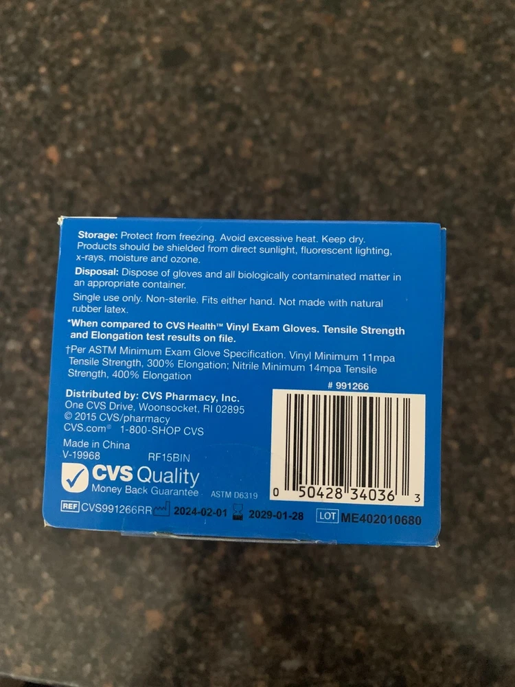 Single use only. Non-sterile. CVS/pharmacy™ Nitrile Exam Gloves feel and perform like latex but contain none of the proteins that can lead to latex allergies. These gloves have a tight cuff seal, are stronger than vinyl gloves and offer a high degree of tactile sensitivity. Per ASTM Minimum Exam Glove Specification. Vinyl Minimum 11mpa Tensile Strength, 300% Elongation; Nitrile Minimum 14mpa Tensile Strength, 400% Elongation Textured fingers with tight beaded cuff Outstanding tactile sensitivity Soft & powder free
