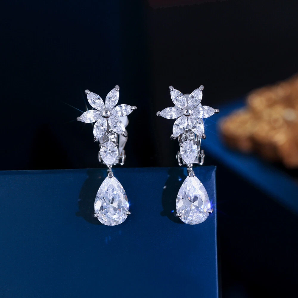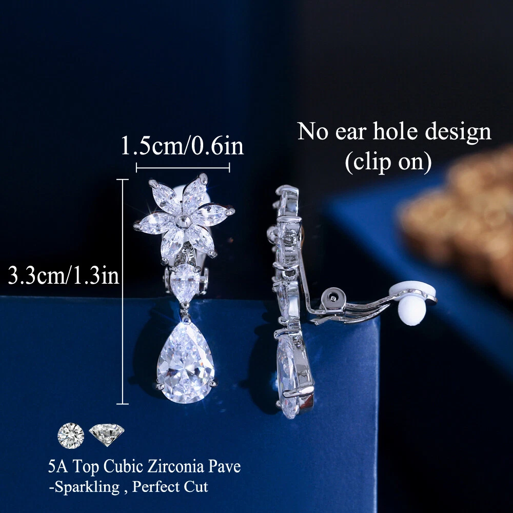 Silver Plated CZ Flower Drop Clips On Earrings Without Pierced Ear Clip Jewelry Specifications: 1. Condition: New 2. Material: Cubic Zirconia 3. Earring Size : 3.3 cm/1.3 inch*1.5 cm/0.6 inch 4. Wearing Occasion: Wedding / Daily Wear / Office / Anniversary / Party/ Engagement / Christmas 5. Fit for: Women ,Bride , Bridesmaid , Girls , Mother , Wife , Lover , Fiancee , Friends . Features: 1. 100% Brand new and high quality. 2. Brillant Simulated Diamond - Top Level Cubic Zirconia. Excellent Cut Simulated Diamond. Enjoy the Dazzling Sparkle from Cubic Zirconia Clip on Earrings. 3. Our Fashion Clip on Earrings are suitable for all non Pierced Ears. 4. Perfect for Various Occasions: Ideal for Bridal, Wedding, Prom, Parties, Holidays, Special Occasions, Birthday, Valentine's Day, Mother's Day or Anniversary Gifts. Package Includes: 1 Pair of Clip on Earrings Payment Delivery details Terms of sales & Feedbacks About us & Contact us Our commitment Payment 1. We only ship item to your Ebay verified address . Please Make sure all address are the same 2.Please leave note in ebay when making the payment if you have any special request (colors/size). Delivery details We only send items to the registered eBay address.Items will be shipped within 2 business days from the date payment is received (not include public holiday and weekend) . As per eBay regulations, import duties, taxes, and customs charges are the buyer's responsibility. Please check with your country's customs office to determine what these additional costs may be prior to bidding or buying. Terms of sales & Feedbacks After-Sale Please contact us to request a return/replace/refund authorization .It will be best if you use ebay message to contact me. 1, Return and replacement request is available only the requests within 30 days after parcel received. 2, Returning the item as the same condition as received. Situation and solution Defectives ---Please contact us and provide a photo of the defective part. After situation confirmed,we will offer you refund/return/replacement according to the situation Not as Described ---Please contact us and provide a photo of the wrong part. After situation confirmed,we will offer you refund/return/replacement according to the situation Not Received ---Please undersatnding shipping on the way was out of our control ,because of the busy shipping season,holidays,bad weather or force majeure etc. It may be delay for days. But if it took too much time and not deliveried, Please message me, I will offer you solution for it. Feedbacks 1. If you are satisfied with our service, please leave us a + Good feedback and rate the details of the transaction (DSR) with a. . When you rate the shipping time part please take international transit into consideration.] Your recognition will make us more confident to develop business and serve you better. 2. Please contact us first if you have any problem with the items,we will solve it in time ! 3. Please do not leave Neutral or Negative Feedback before you contact us, Thanks For Your Business ! About us & Contact us Working time: Chinese time(Eastern eight zones):Monday to Friday ,9:00 am to 6:00 pm. We do not work on chinese legal holiday. Message reply: We will reply all messages within 24 hours of business time. Please contact us via ebay message, it was the best way for both you and us to solve problems. Any questions or anything you need, please feel free to contact us. Our commitment 1.Wholesale price will be offered to you if you need in bulk ! 2.About Size