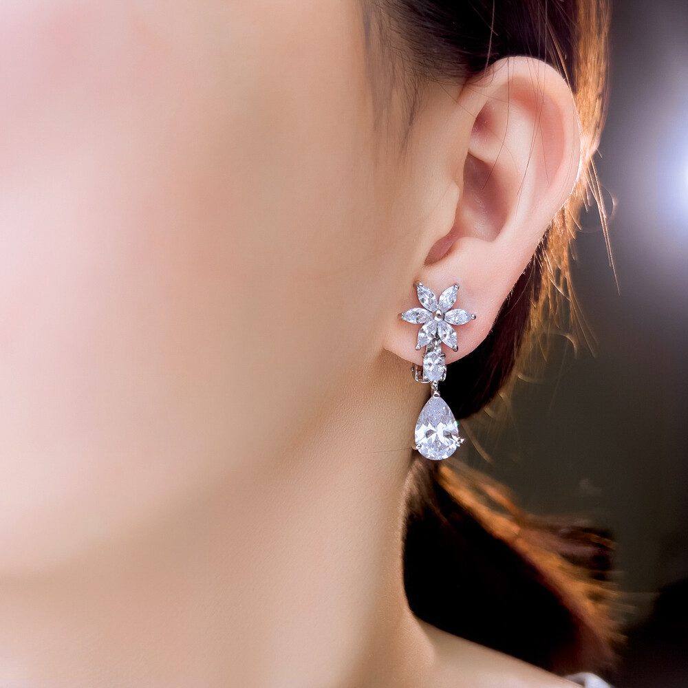 CZ Floral Drop Clip-On Earrings for Weddings Brides Non-Pierced Elegant Jewelry