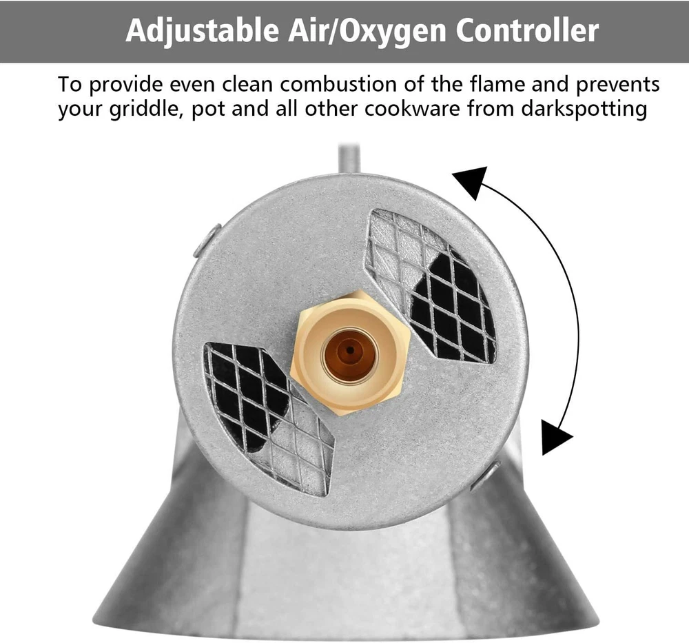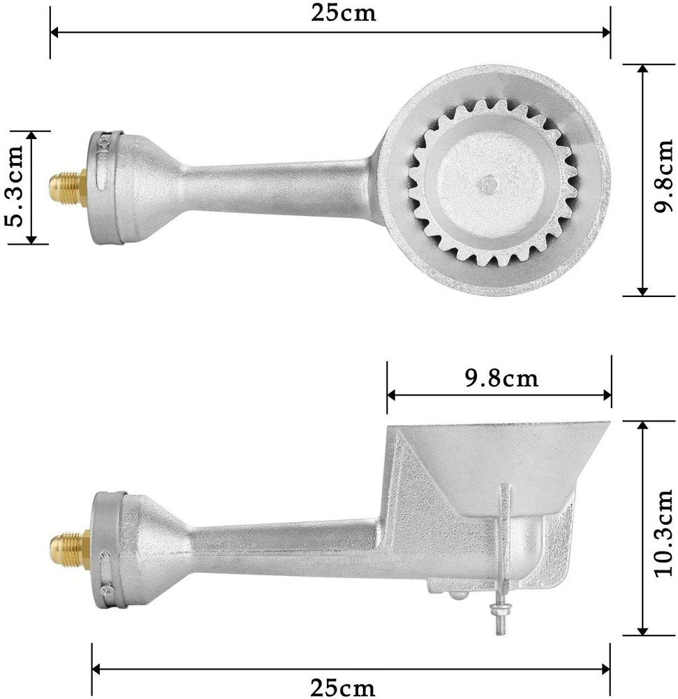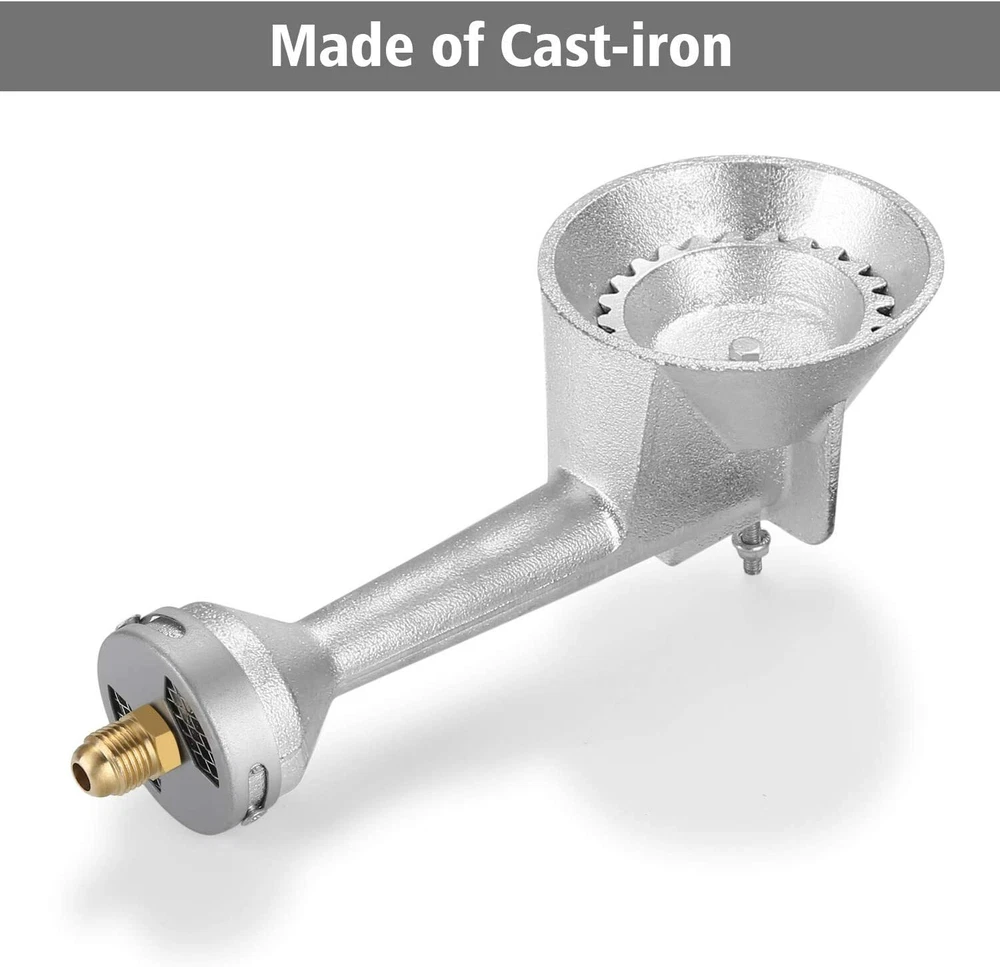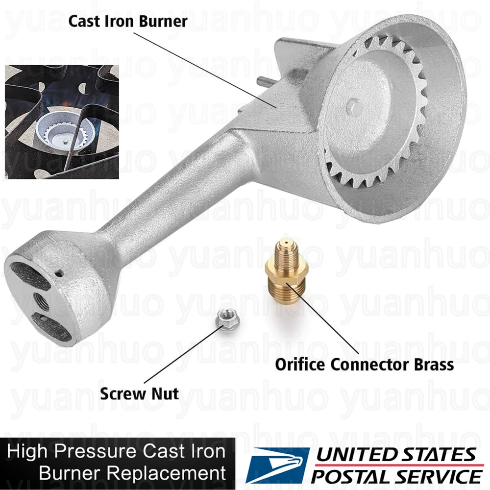 eBay High Pressure Propane Cast-Iron Round Burner Head, Propane Burner Head with Orifice Brass Fitting Universal Cast-Iron Round Burner Head: It is made of high quality cast iron and has better heat resistance than conventional aluminum burners. It also has air shutter for better ventilation to the propane can thorough combustion. You can use it with high pressure or low pressure regulators. Built in Air Shutter: It also has air shutter for better ventilation to the propane can thorough combustion and prevent your griddle, pot and all other coolwares from darkspotting. Brass Fitting: 3/8" flare M x 1/8" MNPT high quality brass. Application: Fits most propane grill, stove, smoker, burner, heater, fireplace, fire pit, cooker, turkey fryers, torches and variety of high pressure appliances. Attention: It can only be used for propane. And it is suitable for high pressure system. Please do not use for low pressure equipment to prevent damage to your low pressure equipment. Product Specification This product is 65000 BTUs. Propane Burner Head : Material: High quality Cast Iron Negotiability: Air Shutter can control the amount of air coming in. Brass Fitting : Material: High Quality Brass Size: 3/8" flare M x 1/8" MNPT NOTE! To be used with Propane Only.