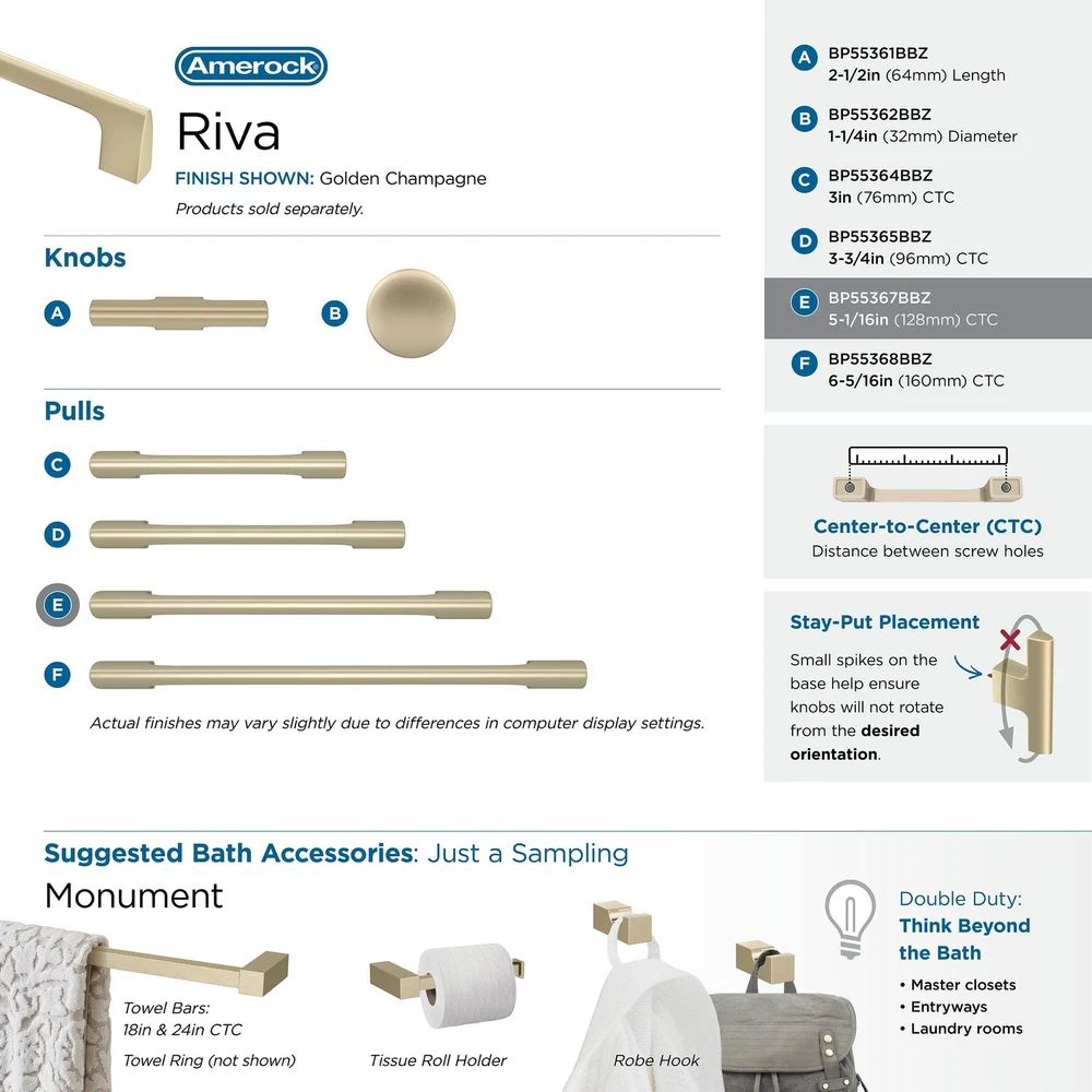 The Allison by BP55367BBZ Riva 5-1/16 in (128 mm) Center-to-Center Pull is finished in Golden Champagne. A focus on the beauty of the straight line and showcasing thoughtfully executed proportions, Riva's minimalistic appearance creates a stand-out design. Its desirable, streamlined look enhances any space. Warm and inviting without being brassy and featuring hints of silver in reflective light, our Golden Champagne finish elevates designs with enviable versatility. Use for a soft and elegant touch on lighter finishes or as a contrasting pop against darker finishes. Founded in 1928, ’s award-winning home solutions including decorative and functional cabinet hardware, bath accessories, decorative hooks and wall plates have built the company’s reputation for chic design accessories that inspire homeowners to express their personal style. Ideal for residential or commercial applications, Allison by marries beauty and function. It’s the best combination of approachable artistry and lasting quality. 5-1/16 in (128 mm) Center-to-Center Pull Finished in Golden Champagne exclusive design Includes mounting hardware: #8-32 x 1 in. Truss Head Machine Screw & #8-32 x 1-1/2 in. Truss Head Machine Screw DISCLAIMER - We do our best to show colors accurately, but they might look different on your screen due to individual monitor settings. Golden Champagne is a COOL, neutral gold with slight blue undertones