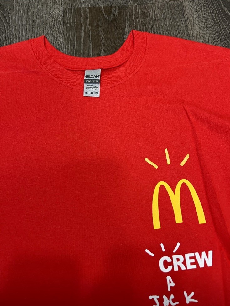 The Travis Scott Cactus Jack x McDonald's Crew Tee (2020) is a, red 100% cotton, short-sleeve, crewneck t-shirt. It was originally distributed to McDonald’s crew members during the promotional campaign. The shirt features a collaborative logo on the front and is designed for a regular fit. Size XL - Brand New $40
