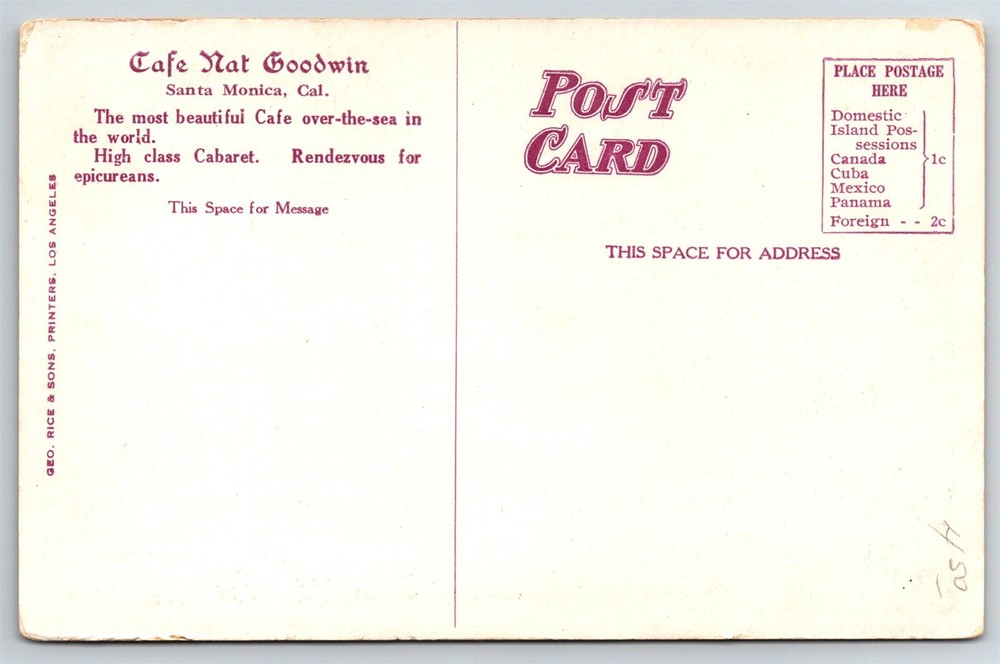 Cafe Nat Goodwin Santa Monica CA High Class Cabaret Cars C1910s Postcard W20 Thank you for visiting! This is a standard size postcard, 3.5" X 5.5". In stock, usually ships within 24 hours of your purchase. Please ask questions if you are unsure about anything. Our goal is for your complete satisfaction with the postcard and your experience. Check all my other listings in my store. RETIREDWITHBOOKS Powered by SixBit's eCommerce Solution