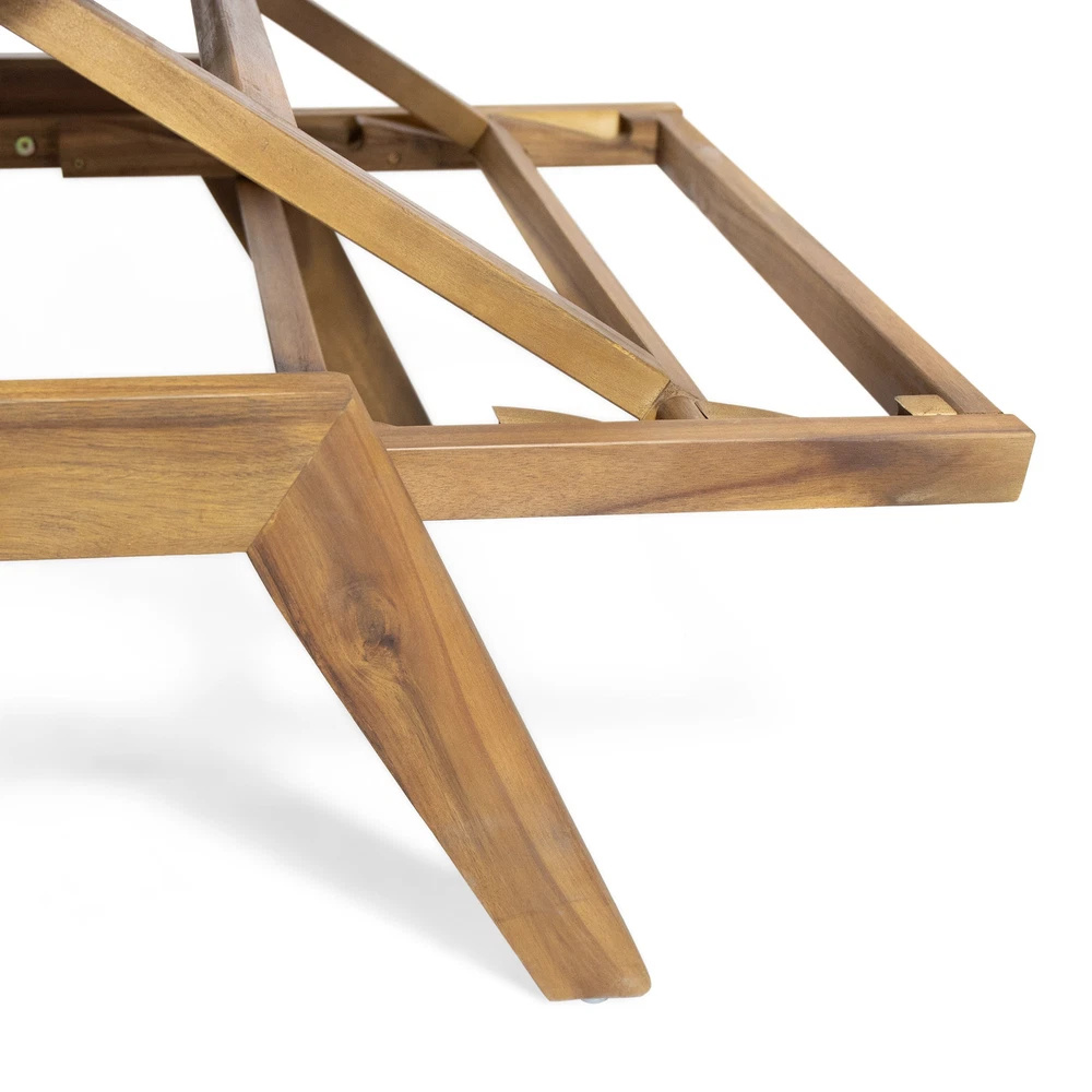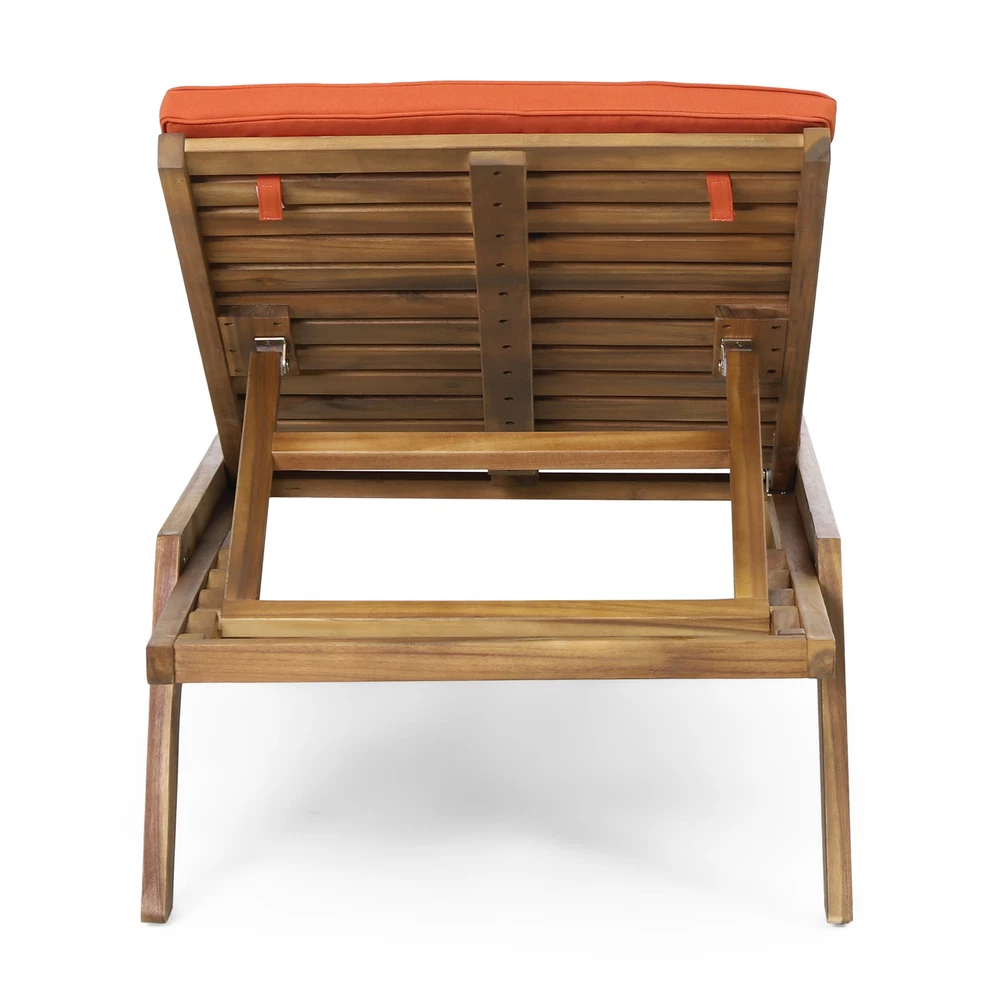 Specifications Place of Origin #originPlace# Main Color Teak Main Material Acacia Wood Dangerous Goods #dangerFlag# Dimensions & Weights Assembled Length (in.) 78.75 Assembled Width (in.) 25.75 Assembled Height (in.) 13.00 Weight (lbs) 48.50 Product Features What better way to enjoy the warm rays of the great outdoors than with the perfect seating set? Ideal for family and friends alike, our chaise lounge set offers you outstanding outdoor comfort with its thin slat paneling and precise structure. ACACIA WOOD: Made with acacia wood that brings a sleek and exotic look to your space, this durable hardwood naturally withstands outdoor elements and will not darken over time. Acacia wood is perfect as a solid, heavy frame that resists wear and tear. WATER-RESISTANT CUSHIONS: Our cushions are covered with a non-porous material that makes cleaning any spill a breeze. Please note that these cushions are water-resistant and not waterproof. Please do not submerge in water. DIMENSIONS: Choose an accessory that is the perfect size for you and your furniture. Each chaise lounge is 78.75” W x 25.75” D x 13.00-37.00” H. You will love how much your space can transform with the simple addition of this charming lounge set. This comes as a set of two. ADJUSTABLE: This chaise lounge set offers adjustable seating to ensure maximum comfort. This accommodates five different positions, including a fully reclined option. Description