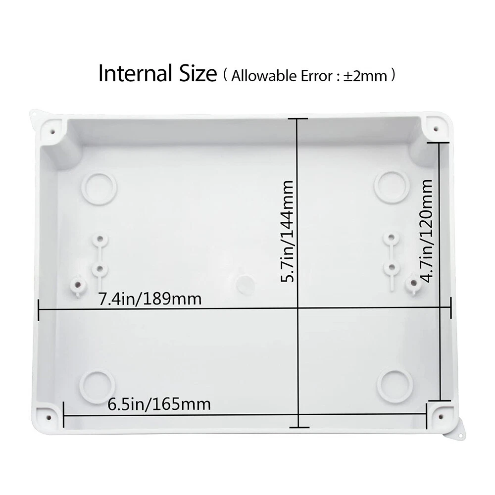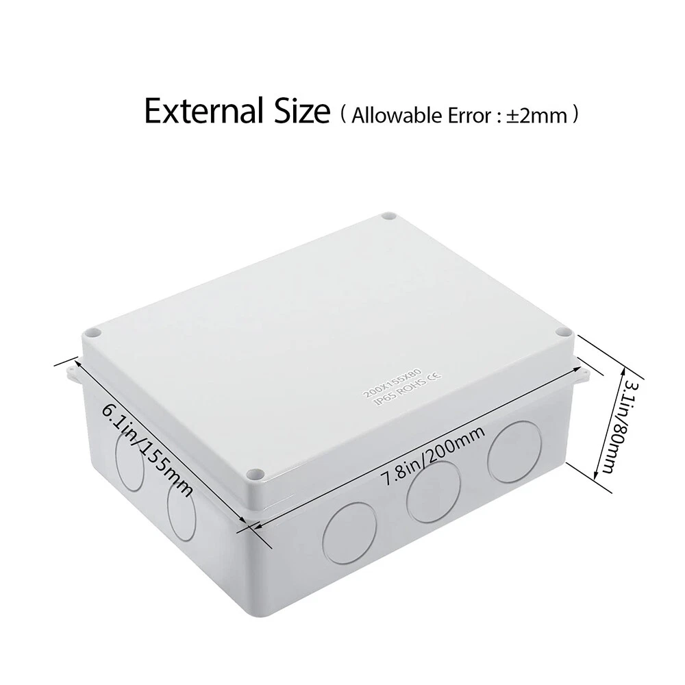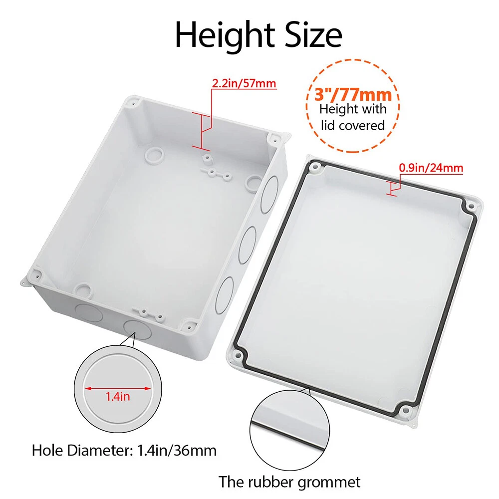 Features: [ Sturdy Construction ] Electrical Junction box is made of high-quality ABS plastic material, which offers excellent impact resistance and electrical insulation. Rest assured that your equipment will be well-protected in harsh environments. [ Safe and Certificated ] With CE RoHS compliant and waterproof rated, the electrical box is free of hazardous substances. The plastic box is predrilled which is easy to install and modify for your project. [ Indoor and Outdoor Use ] With the feature of water resistance and dustproof,it can effectively block splashing water, rain, dust, snow, oil, UV and more. Whether you need to use it indoors or outdoors, this surface mounted project box is easy to operate. [ Extensive Application ] Our junction box is used in a variety of applications: residential homes wiring and connecting electrical devices, such as light fixtures, switches, and outlets; protect and connect electrical equipment for machines, motors etc. Size: 7.87”x6.1"x3.15" Package Included: 1x Electrical Junction Box