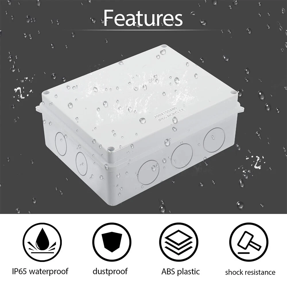 gtin13: Does Not Apply Application: Automotive, Branch Circuit, Charging/Power, Commercial, Control Equipment Panels, Conveyance Lines, Cooker, Data Centers, Electrical Wiring, Electronics, Fan Control, Home/Garden, Home Appliance, Industrial, Instruments, Large Appliances, Light Control, Multi-Outlet/Power Splitter, Outlet, Portable Generator, Power Transformers, Small Appliances, Telecommunications, Transportation, Voltage Conversion Protection Properties: Wire Protection Brand: Unbranded Features: Waterproof UPC: Does Not Apply Size: 7.87”x6.1"x3.15" MPN: Does Not Apply Estado del artículo: Nuevo Resistance Properties: Child Resistant, Corrosion Resistant, Dustproof, Dust Resistant, Impact Resistant, Moisture Resistant, Rustproof, Rust Resistant, Scratch Resistant, Shockproof, Sunlight/UV Resistant, Tear Resistant, Waterproof, Water Resistant, Weatherproof, Weather Resistant Material: ABS/Plastic Room: Any Room Type: Small Junction Box IP Rating: IP65 Color: White Suitable For: Ceiling, Exterior, Interior, Wall Mounting Style: Ceiling, Fixed, Modular, Panel, Surface, Suspended, Unit, Wall