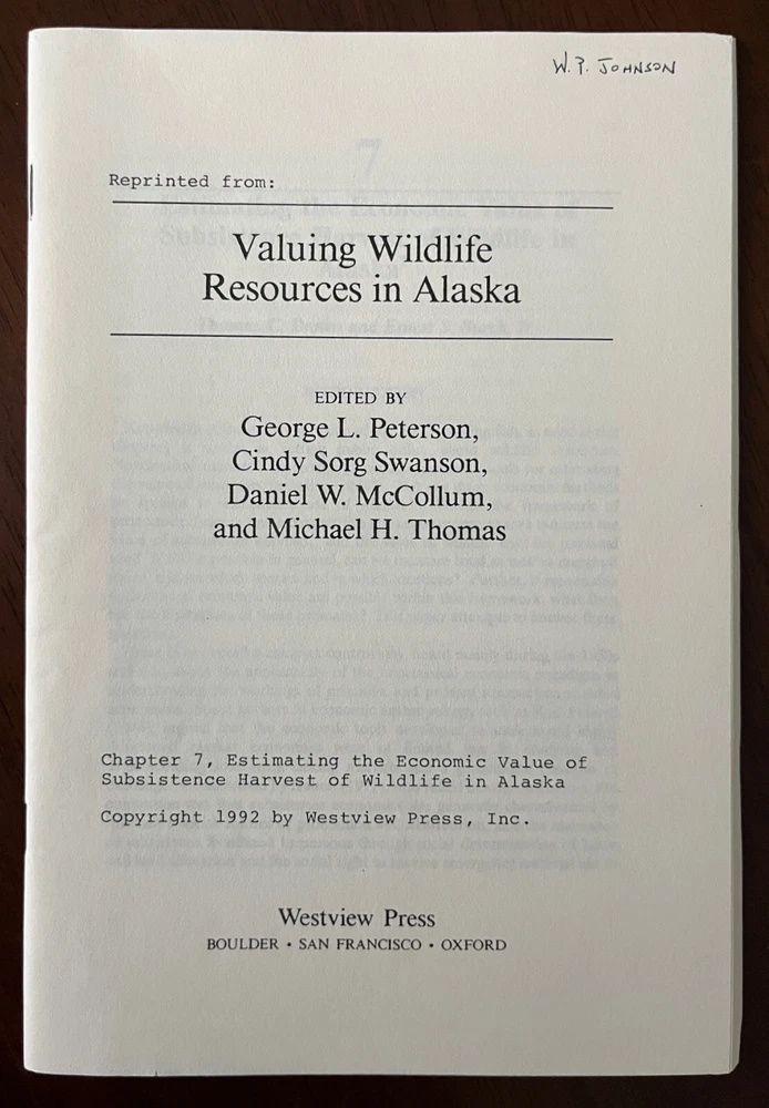 Reprint of Chapter 7: "Estimating the economic value of subsistence harvest of wildlife in Alaska" by T.C. Brown and E.S. Burch, Jr. Pages 204-254 from 'Valuing Wildlife Resources in Alaska,' Edited by G. L. Peterson and others. Published by Westview Press. 1992. Paperback, Staple Bound The reprint has a name printed on the front cover.