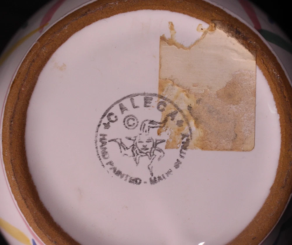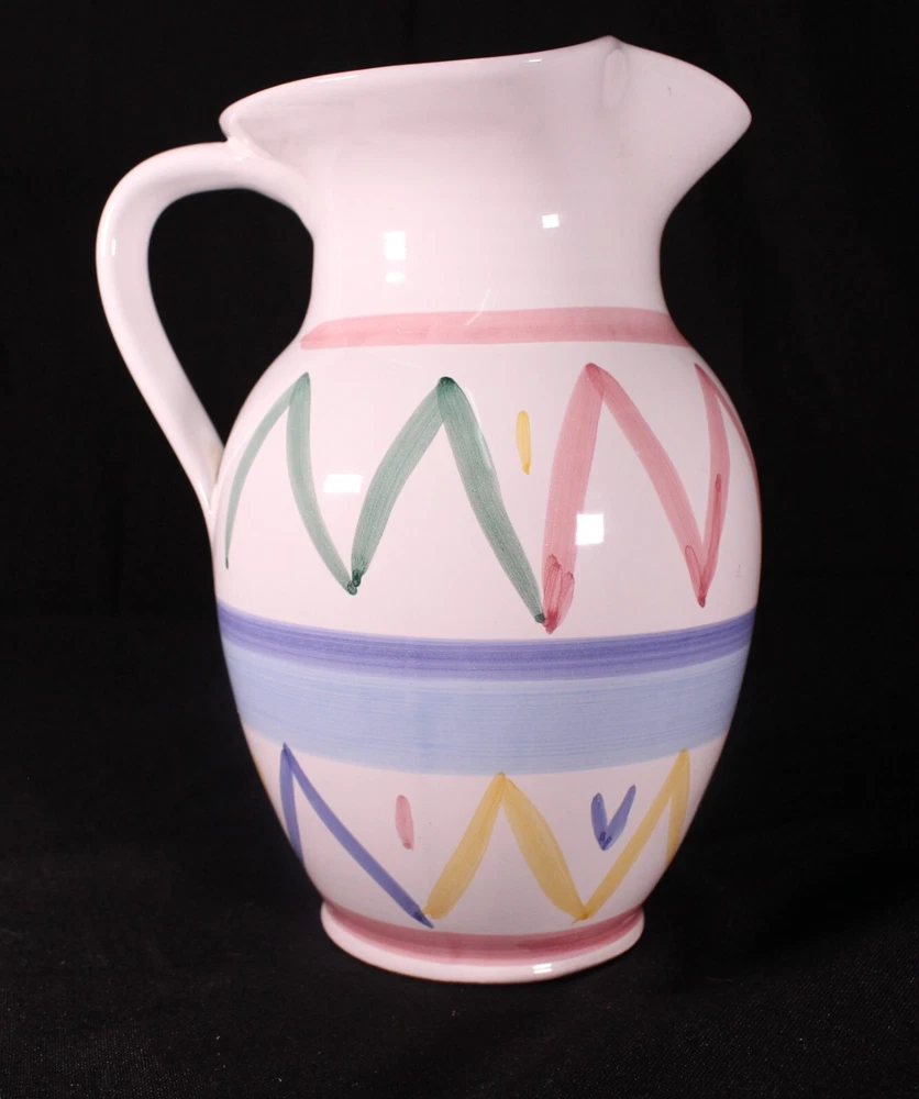 This unique Caleca pitcher is a rare find for any collector. Handcrafted in Italy in 1995, this vintage piece features a stunning zigzag design and is made of high-quality clay. The round shape and glossy finish make it a beautiful addition to any decorative cookware or pottery collection.The pitcher is an original, licensed reproduction with a painted backstamp and is part of the Sole product line. It comes from a line of art pottery and is a perfect blend of style and function. This handmade piece is perfect for serving your favorite beverage and will surely be a conversation starter.