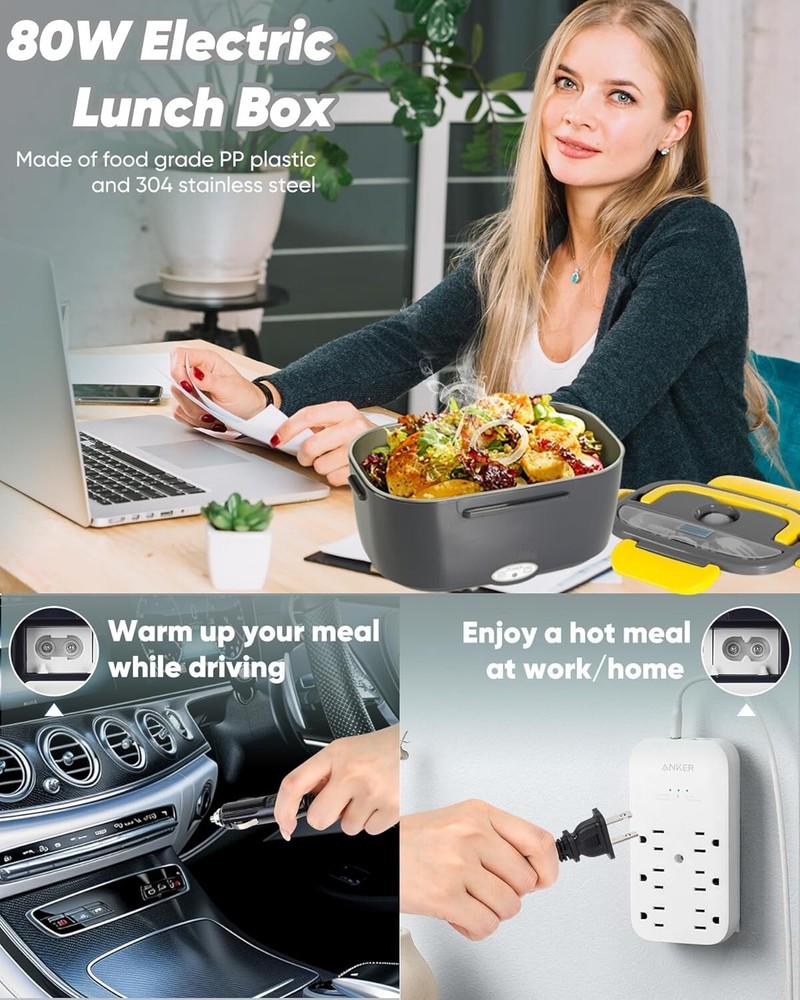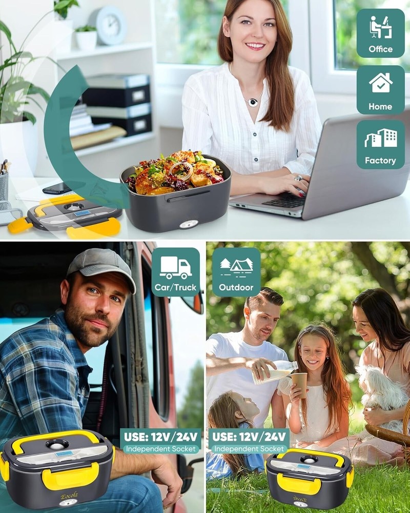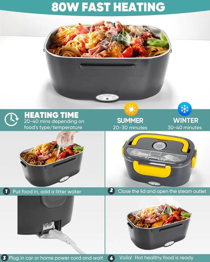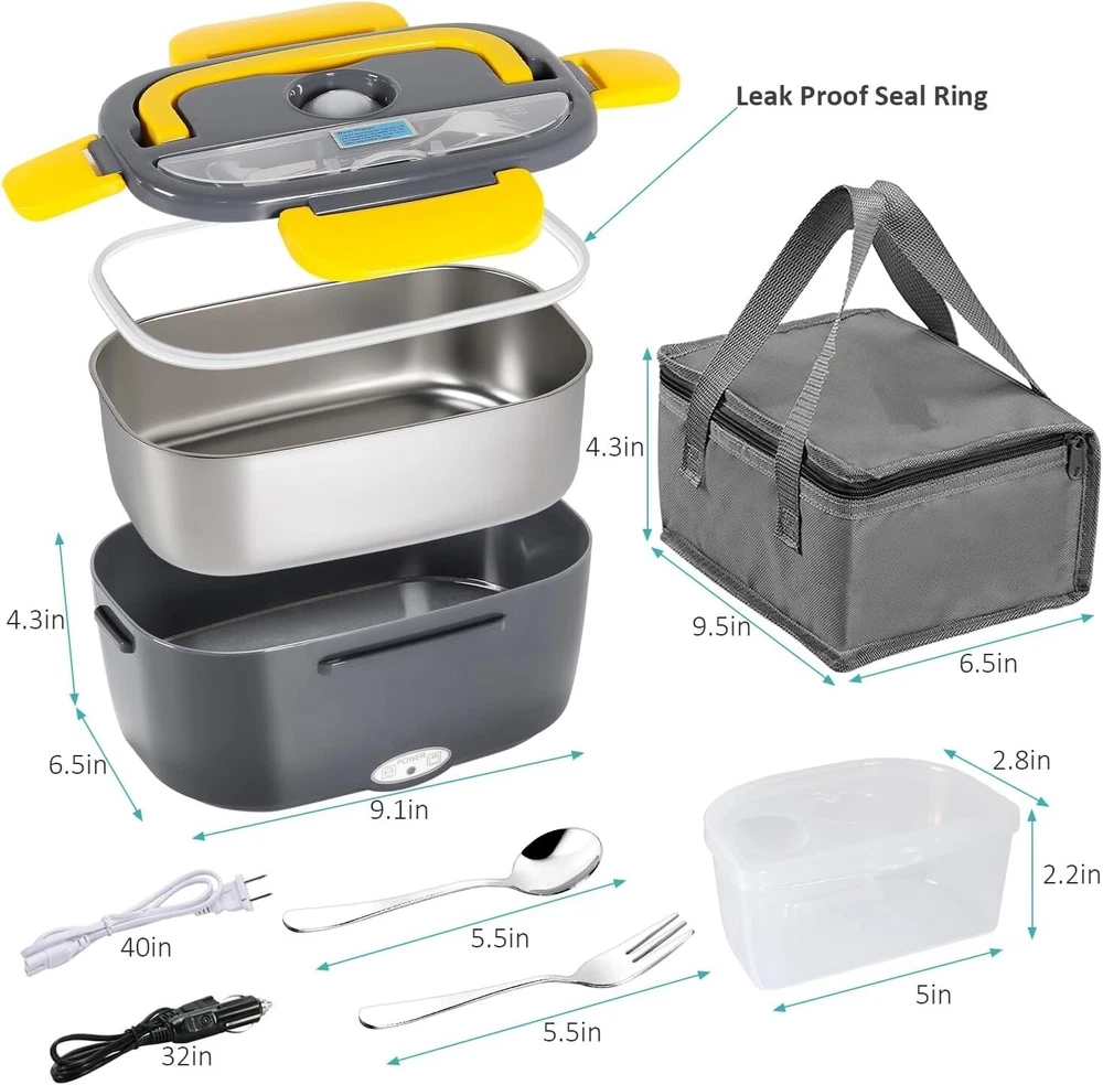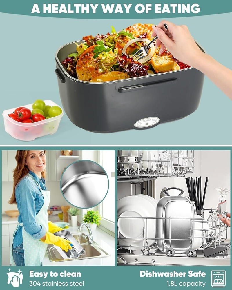 Calentador De Alimentos Eléctrico Para Lonchera: Lonchera Térmica De 1,5 Litros. 2 EN 1 PARA COCHE Y HOGAR: Nuestro calentador de alimentos cuenta con dos enchufes: uno para el trabajo/casa (110 V) y otro para coche/camión (12 V/24 V). Puede llevar esta lonchera portátil a diario y calentar comidas cómodamente en diferentes lugares. MATERIAL DE GRADO ALIMENTARIO SEGURO: La lonchera eléctrica está hecha de plástico de grado alimenticio y un recipiente de acero inoxidable 304. Nuestro recipiente térmico para alimentos tiene una fuerte resistencia al calor y cumple con los estándares de seguridad de los materiales dietéticos. Dile adiós a la comida rápida. CALENTAMIENTO RÁPIDO: Incorpora componentes de calentamiento PTC de bajo consumo que evitan el sobrecalentamiento. Utiliza un ciclo de calor de bajo consumo para mantener los alimentos a una temperatura adecuada y conservar su humedad. Olvídate de buscar un microondas y hacer cola para calentarlos. FÁCIL DE LIMPIAR: Esta lonchera portátil para calentar alimentos contiene una bandeja extraíble de acero inoxidable, fácil de limpiar. ¡Además, es apta para lavavajillas! El diseño impermeable del puerto de conexión lo protege del agua mientras no calienta. DISEÑO ÚTIL: Incluye un compartimento de plástico extraíble para separar diferentes tipos de alimentos. También incluye una cuchara y un tenedor. Simplemente conecta el cable y disfruta de una comida caliente en la oficina o de viaje.
