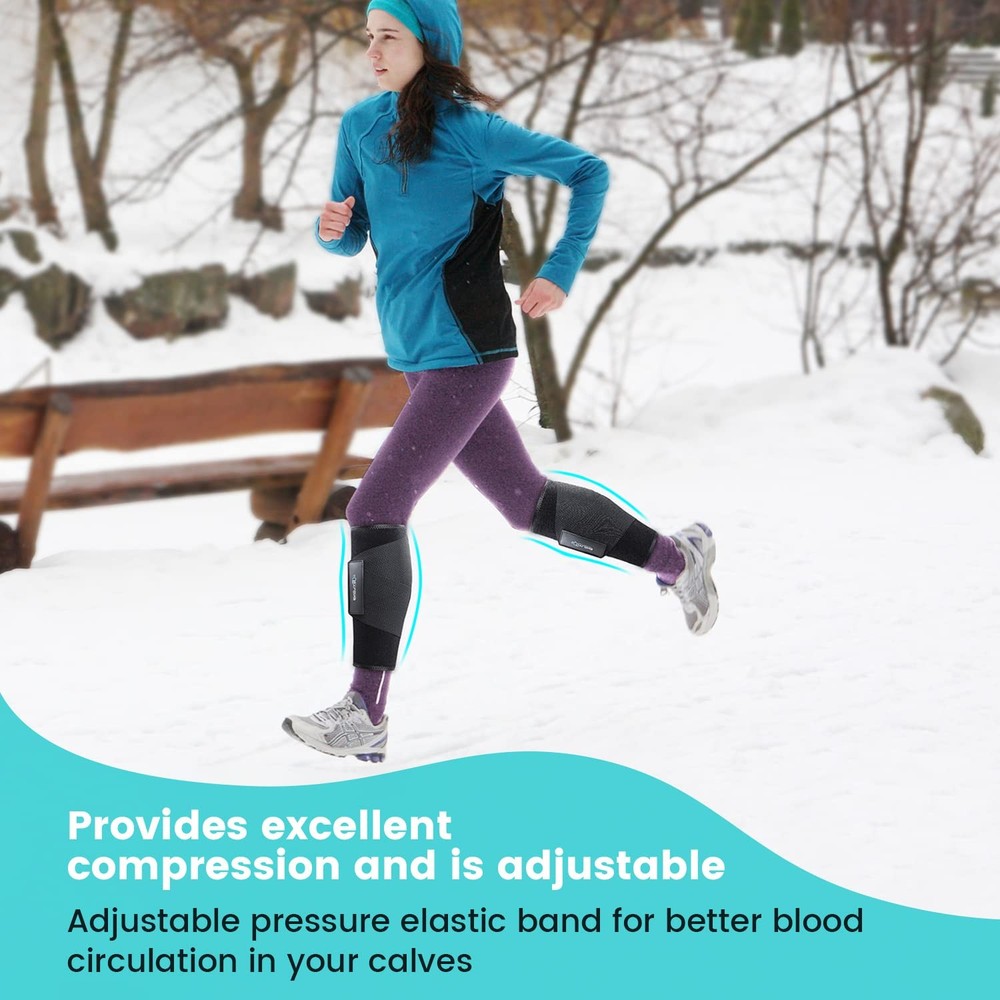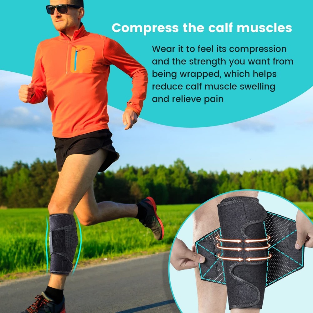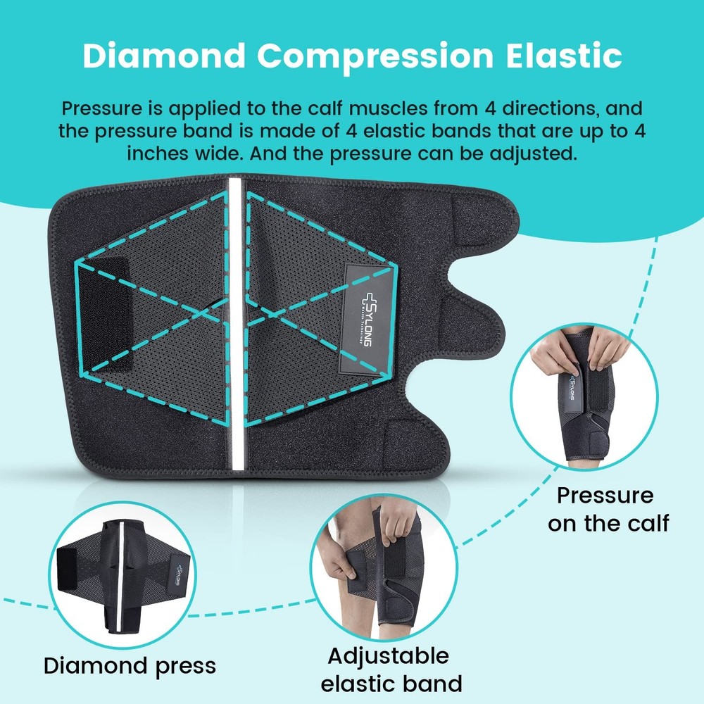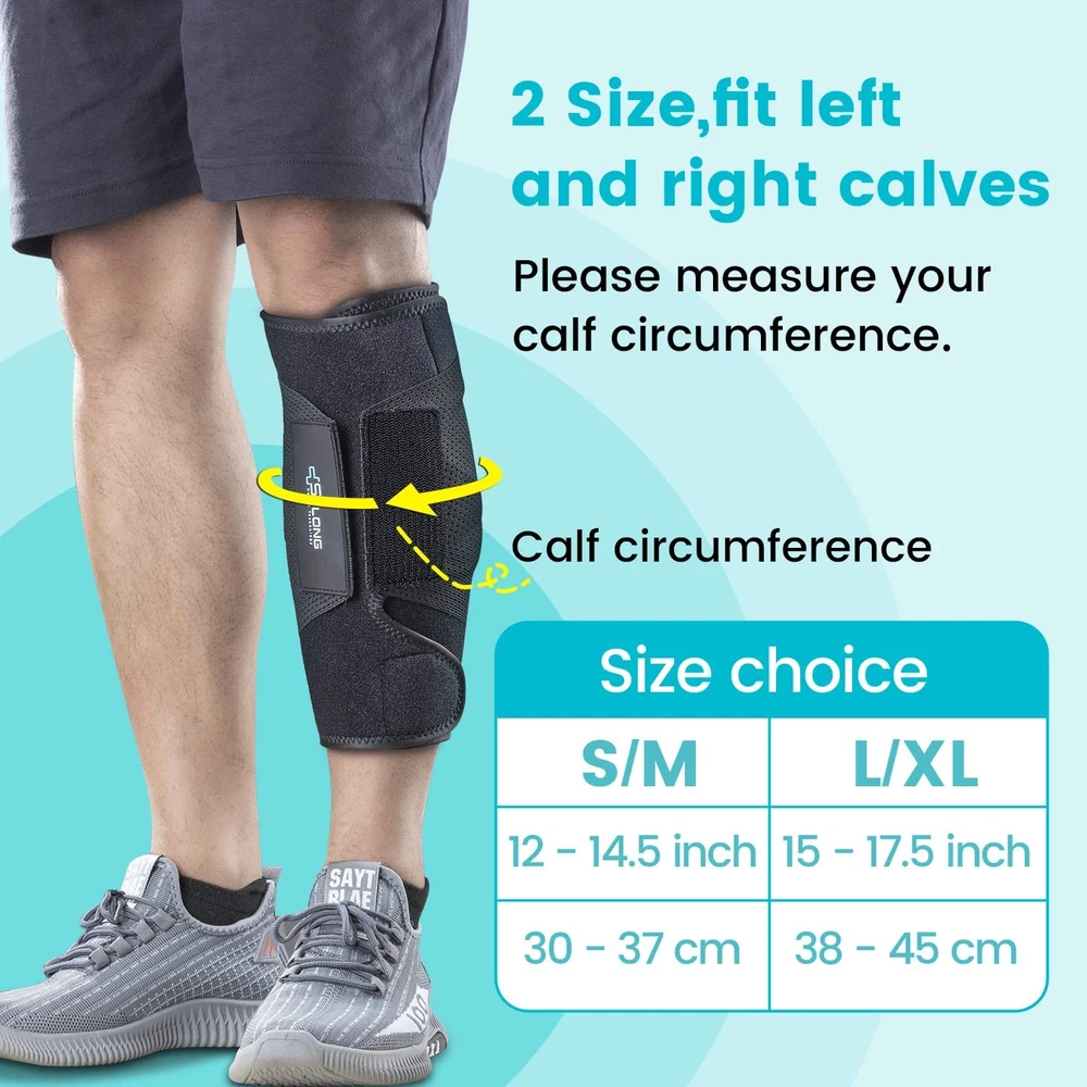 【Pressure brace for calf muscles】According to the characteristics of the calf muscles, the R&D team designed a brace that fits the shape of the calf muscles, and used elastic bands for pressure. This brace is great for calf swelling, varicose veins, cramps, sore muscles and other calf injuries. 【Diamond-shaped elastic band】The most different feature of this calf brace from other products is the design of 4 elastic bands with a width of 4 inch. 4 elastic bands form a diamond shape, exert pressure on the calf muscles from 4 directions, the pressure is greater and more uniform, and the pressure can be adjusted. This design has been patented, it is very effective.It can be used for fitness, running,hiking,cycling, also helps with lower leg congestion and soreness from prolonged standing. 【Premium Comfort Fabric and Back Reflective Strips】The surface of this calf brace is made of soft fabric, with a layer of stretchy SBR material in the middle, and punched with many small holes for easy ventilation. It is washable and reusable. In addition, it has a reflective strip on the back of the calf, which reflects the car lights behind you when you run at night or in the evening, making you safer. 【Easy to put on and fit left and right legs】This brace is fastened with high-quality durable Velcro, which can be fastened easily, safely and quickly with one hand, and the pressure on the calf muscles can be adjusted at will. The elastic bands on both sides are almost symmetrical and suitable for the left and right legs. 【2 Sizes】There are 2 sizes for men and women. Please measure your calf circumference, S/M will fit 12-14.5 inches (30-37 cm), L/XL will fit 15-17.5 inches (38-45 cm). → We hope this calf brace can help you and reduce pain and swelling in your calf muscles. Reducing your pain is our value.