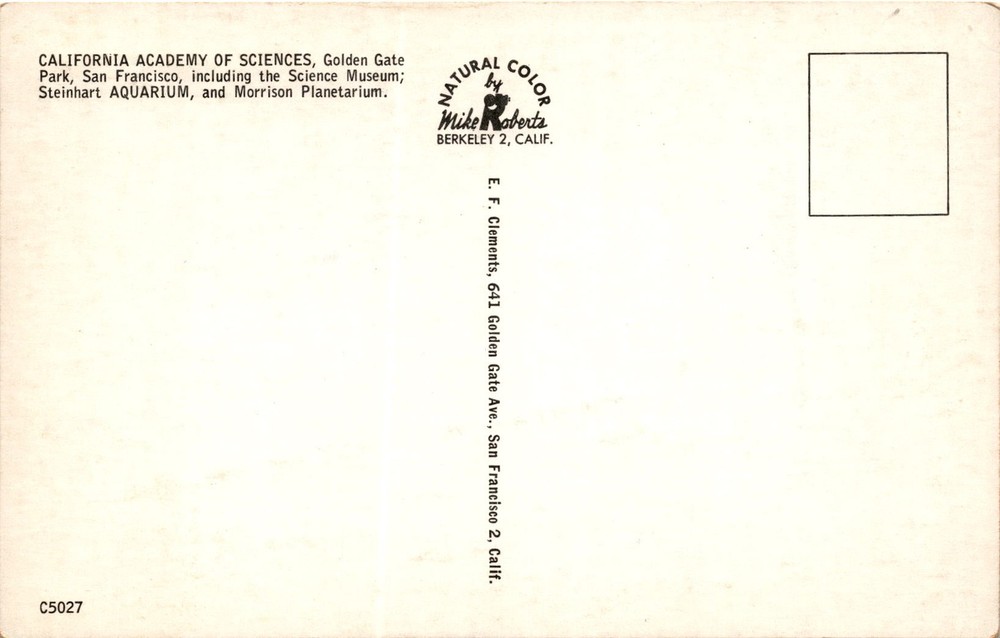 The postcard features an image of the California Academy of Sciences located in Golden Gate Park, San Francisco. The academy includes the Science Museum, Steinhart Aquarium, and Morrison Planetarium. The California Academy of Sciences is a renowned scientific and educational institution that houses a natural history museum, an aquarium, a planetarium, and a research facility.