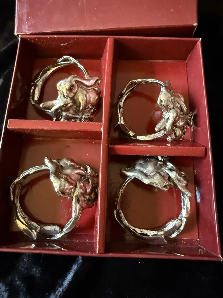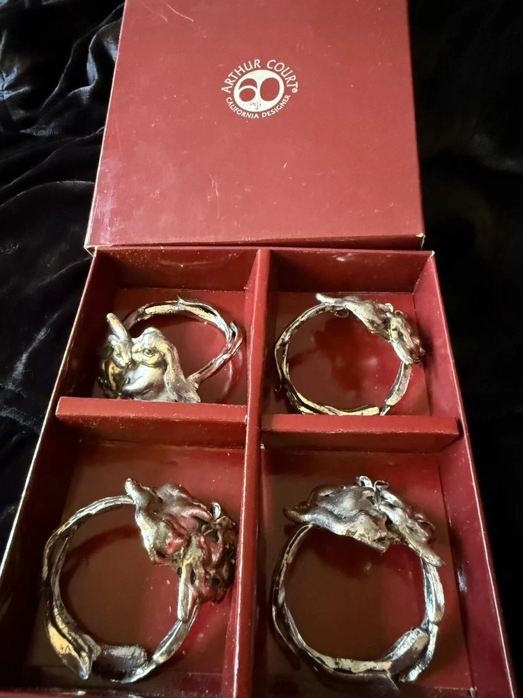 Antique:NoBrand:Arthur CourtOccasion:All Occasions, EasterOriginal/Licensed Reproduction:OriginalColor:SilverNumber of Items in Set:4Number in Pack:4Type:Napkin RingFeatures:WashableHandmade:NoTime Period Manufactured:1990-1999Material:Nickel