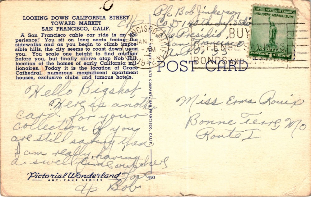 MAKE AN OFFER. THE MORE YOU BUY THE BETTER DEAL I WILL ACCEPT The postcard depicts a view looking down California Street toward Market in San Francisco, California. The text on the postcard describes the experience of riding a San Francisco cable car, where passengers sit facing the sidewalks and feel as though the city is coasting down upon them as they climb the steep hills.