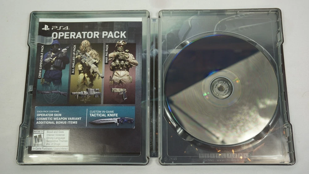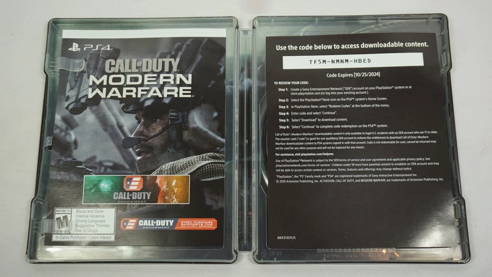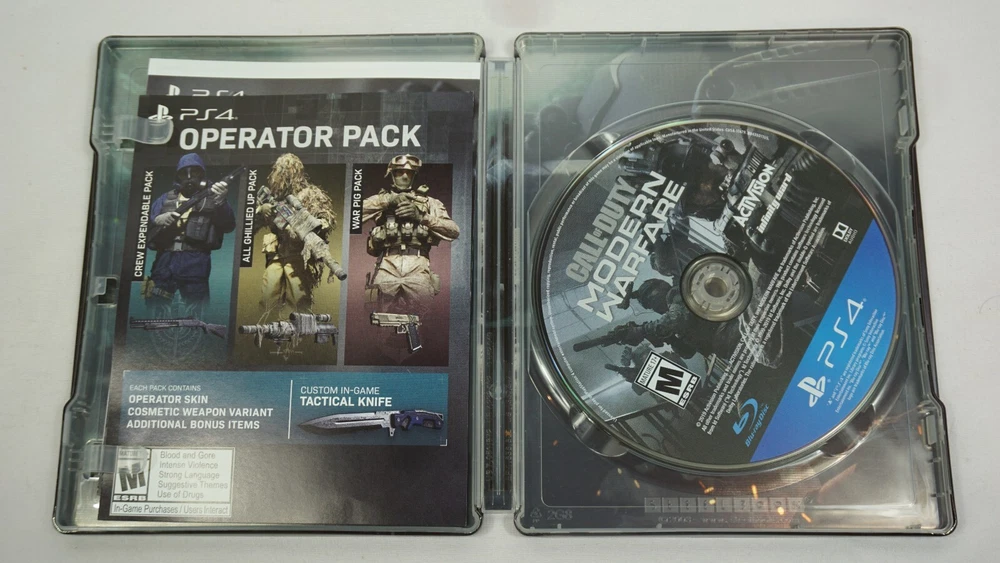Immerse yourself in the adrenaline-fueled world of Call of Duty: Modern Warfare with this PS4 game. This SteelBook Edition includes a dark theme and is the Complete Edition with manual and ad included. The game is rated M for mature audiences and is part of the popular Call of Duty video game series. Experience the thrill of battle and action-adventure gameplay as you navigate through this first-person shooter game. This region-free game is perfect for gamers around the world and comes with fast shipping and a tested guarantee. Get your hands on this 2019 release from Sony and take your gaming experience to the next level. Case has some knicks. Manual is clean. Ad Insert is clean. Disc is clean. TESTED AND WORKING! AUTHENTIC AND TESTED