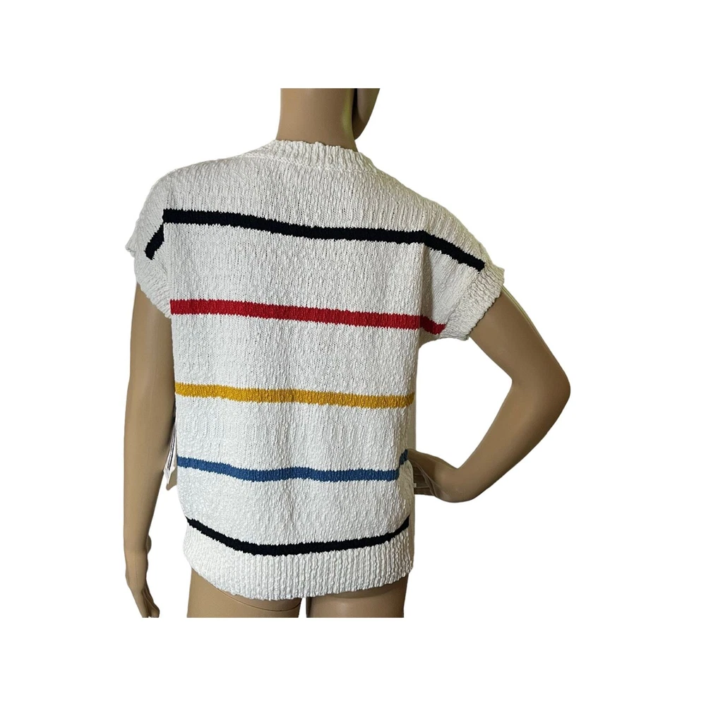 Callahan Revolve Cotton Nubby Texture Sweater Multicolor Striped - NEW WITH TAGS! SIZE SMALL Featuring a unique nubby texture and fun multicolor striped pattern, the Callahan Cotton Short Sleeve Sweater is a must-have for any outfit. Crafted from 100% cotton and soft to the touch, this timeless sweater is perfect for elevating your casual look. With short sleeves that provide great flexibility and breathability, you'll be wearing this classic piece all season long. Add a touch of timeless style to your wardrobe with the Callahan Cotton Short Sleeve Sweater. -Callahan -Style #5208 -Cotton -Nubby texture -Short sleeves -Multicolor striped -Sweater, New. -Measurements (approximate in inches taken flat) Bust 18.75/Waist 17.5/Length 23 Shoulder to hem #Sale #Style #Fashionista #FashionBlogger #OutfitGoals #Bold #Bright