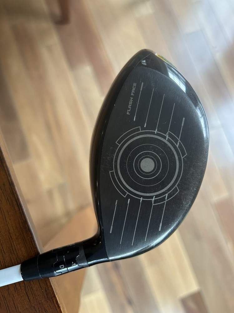 This is a left-handed Callaway Epic Flash driver with a 9 degree loft and an extra stiff Flex ATMOS Fujikura Tour Spec 75g graphite shaft. The head material is titanium, and the color is green. It is a Driver, tailored for men, and part of the Epic Flash model line. The club is 46 inches long and designed for maximum performance and forgiveness on the golf course.