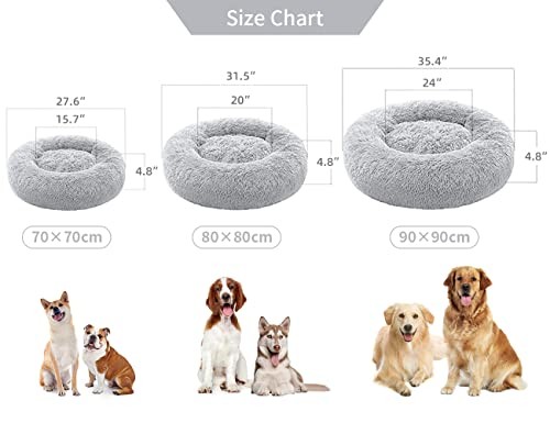 Features: Sweet Calming Dog Donut Bed - The fluffy donut large dog bed is made of high quality nylon and faux fur, the interior is filled with thick PP cotton to make the whole puppy bed more comfortable. All crafting materials are 100% safe and will not cause allergies to your pets. Scientific Design Extra Large Dog Beds-The raised edge of our large dog beds gives your dog enough support to the head and a sense of security, there is also enough padding on the bottom and sides to relieve the dog's muscle soreness and joint pain. Non-slip Bottom Fluffy Dog Bed - Our calming xl dog bed adopts non slip bottom, which can be fixed on the floor. The bottom of the bed is designed with sticky beads and high-density fabric, which is waterproof, dustproof and anti-skidding, providing a dry and warm environment for your pets. Washable Anti-Anxiety Dog Bed - The donut cuddler dog bed is machine washable, make sure that the doughnut dog bed is washed in cold water with gentle mode(no bleach), and thoroughly dried in low temperature. Regular washing can avoid dirt and provide a comfortable sleeping environment for your pet. Choose the Right Size - The large dog bed with 3 size option: 70*70cm-Outer diameter 70cm/27.6inch roundInner diameter 40cm/15.7inch round; 80*80cm-Outer diameter 80cm/31.5inch roundInner diameter 50cm/20inch round; 90*90cm-Outer diameter 90cm/35.4inch roundInner diameter 60cm/24inch roundPlease select the most suitable size and your favor color, according to your pal's actual size.