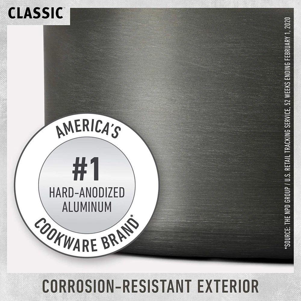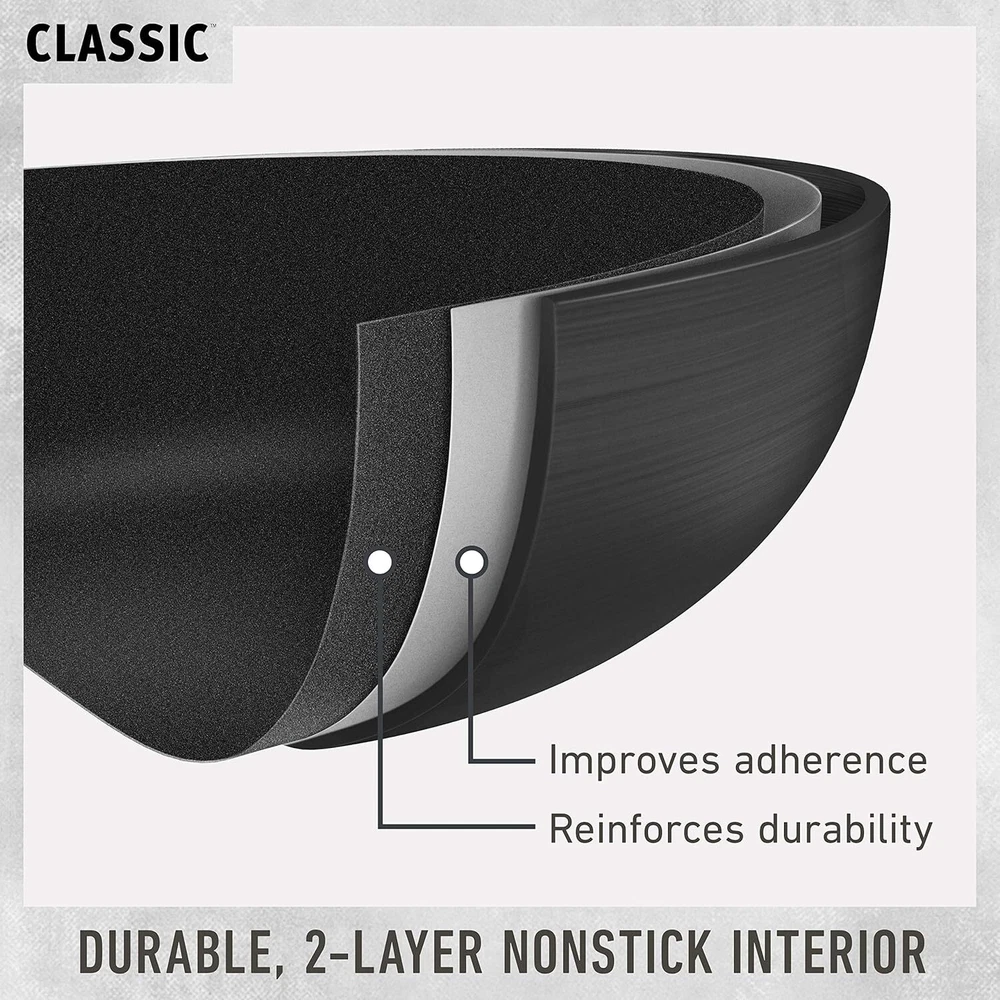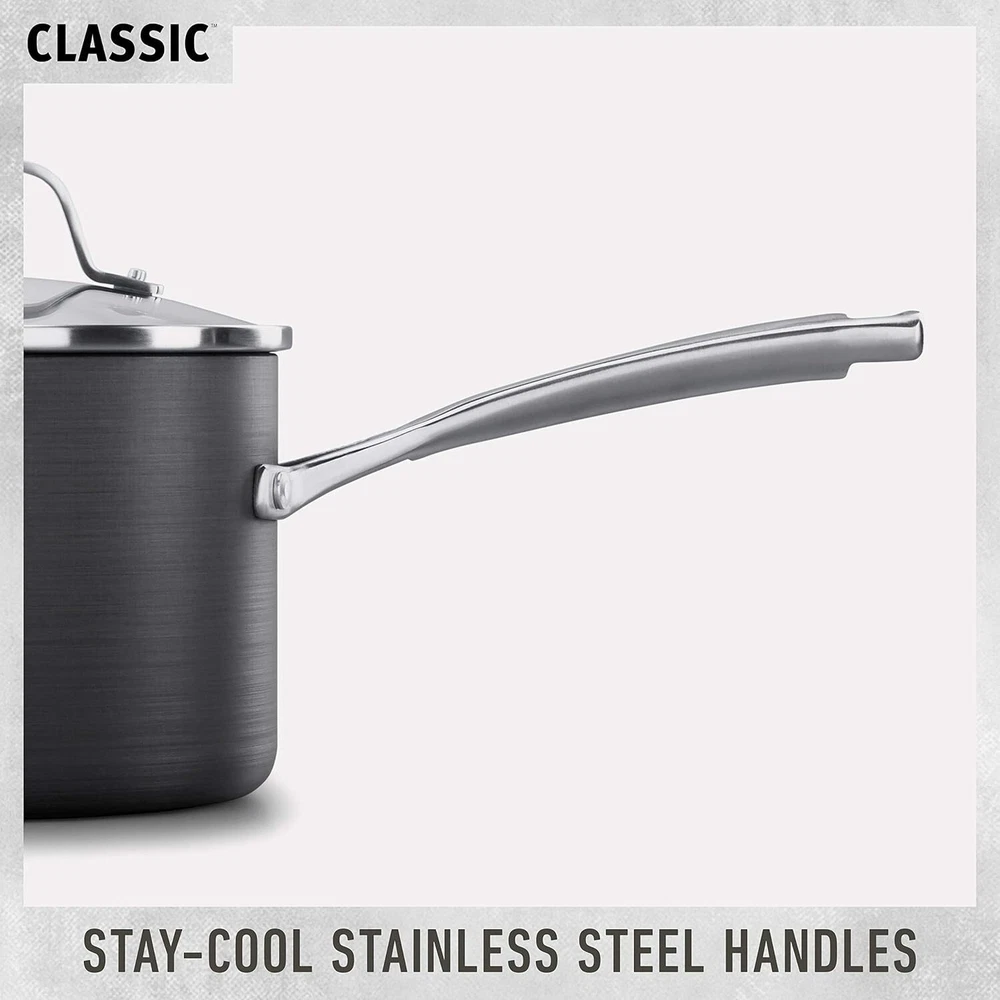 Product Description The Calphalon Classic Nonstick 10 Piece Cookware Set features pots and pans with convenient fill lines, straining covers, and pour spouts that save time in the kitchen. This set helps eliminate the need to use or clean additional cookware such as measuring cups, strainers, or colanders. Pans are made with dual layer nonstick for extra easy food release and cleanup, and are constructed from durable hard anodized aluminum for fast and even heating. Long, cast stainless steel handles stay cool while cooking on the stove top and the entire nonstick cookware set is oven safe up to 450 degrees , making it easy to finish recipes or keep food warm until it's served. The nonstick Calphalon cookware set includes an essential assortment of cookware for your kitchen so it’s for everyday cooking. On Dec 12, 2024 at 18:30:57 PST, seller added the following information: