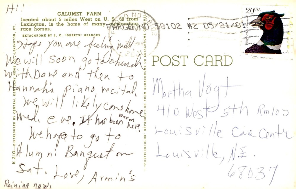 Calumet Farm, located 5 miles west of Lexington on U.S. 60, is home to many outstanding race horses. The postcard features an Ektachrome photo by J. C. Meadors.