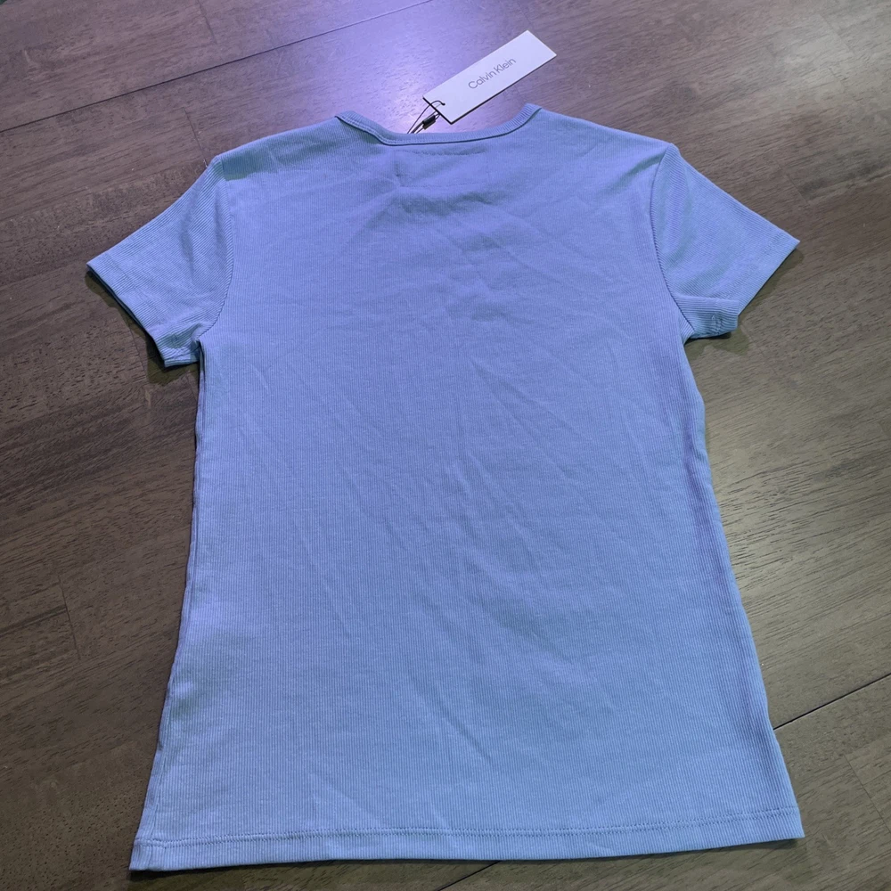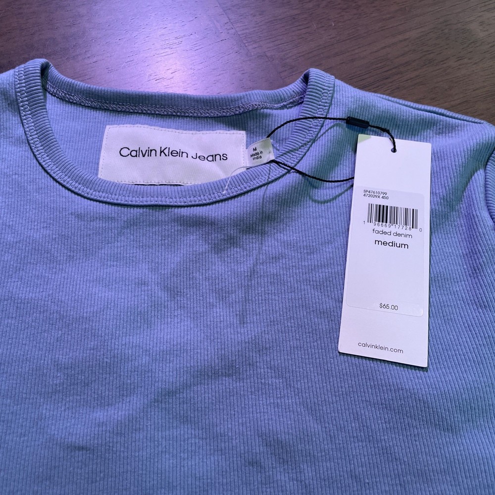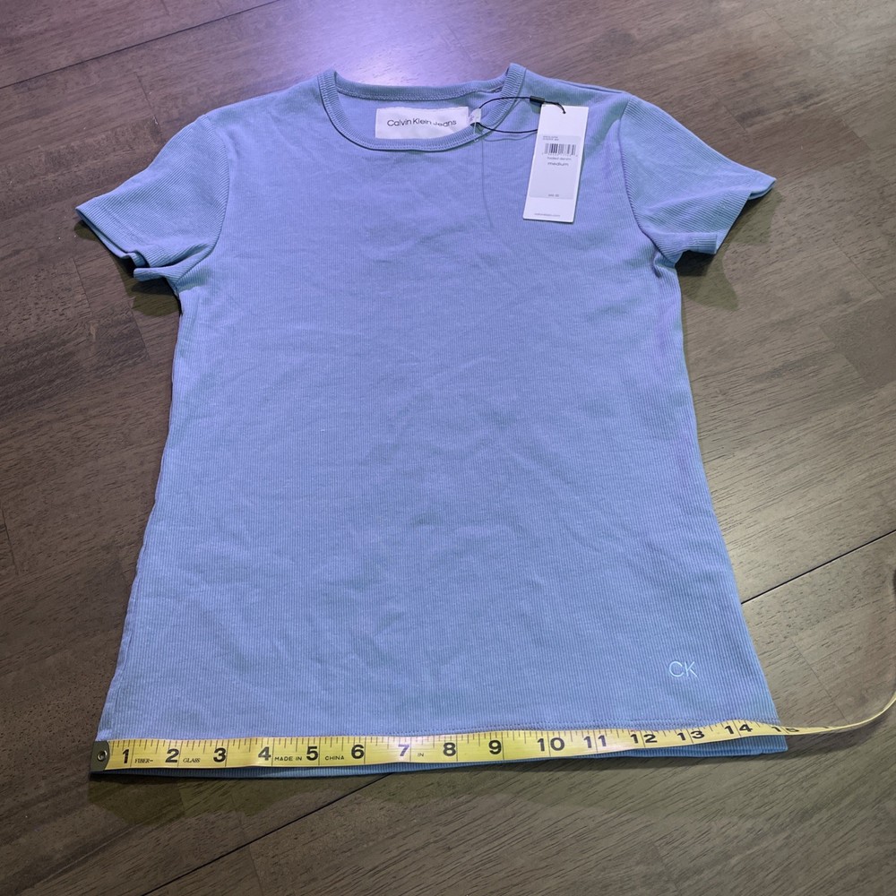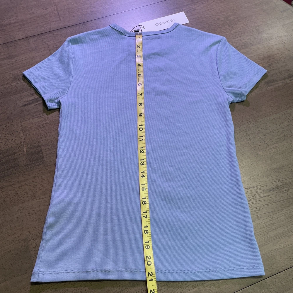 Calvin Klein faded denim blue women’s short sleeve shirt. Item is a medium but a very snug medium. I normally wear a XS-S and this fits me snug. Please see photos for measurements and let me know if you have any questions.