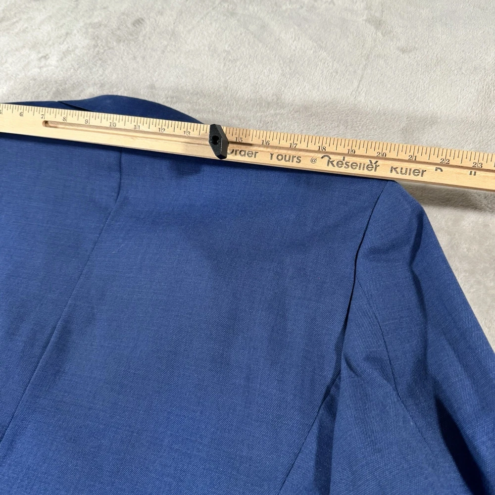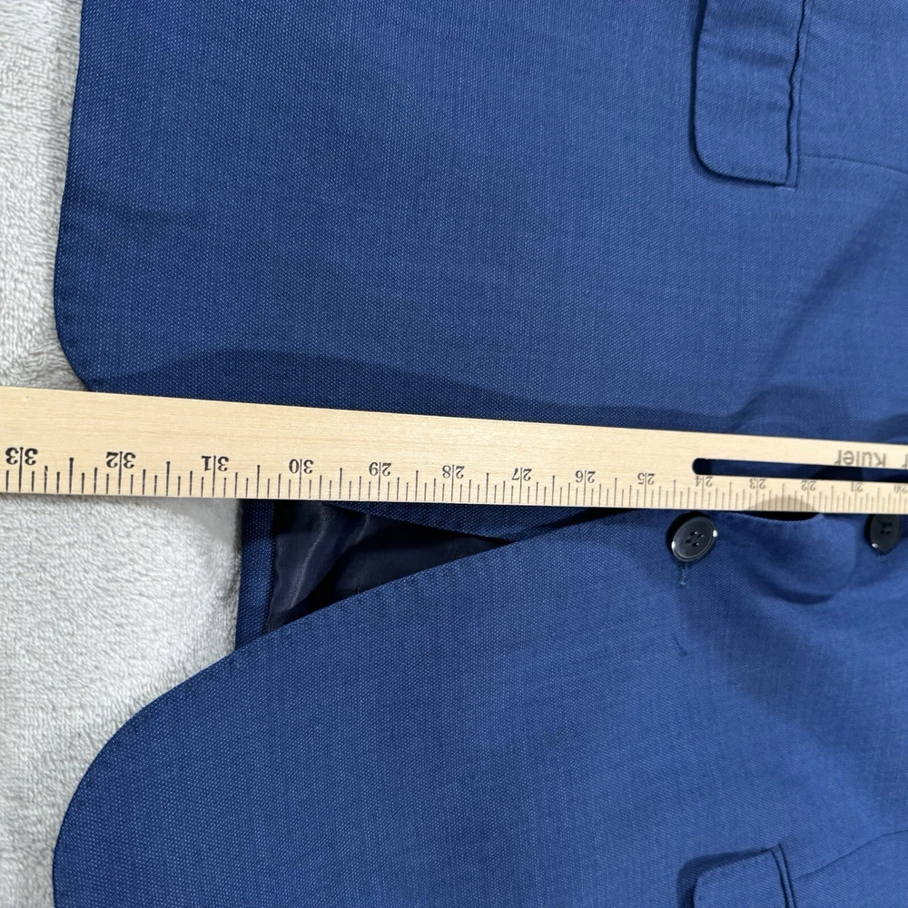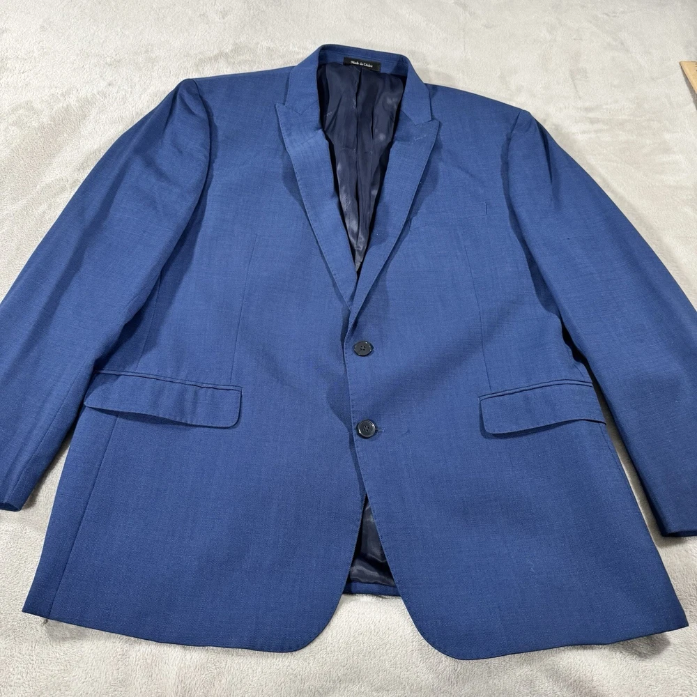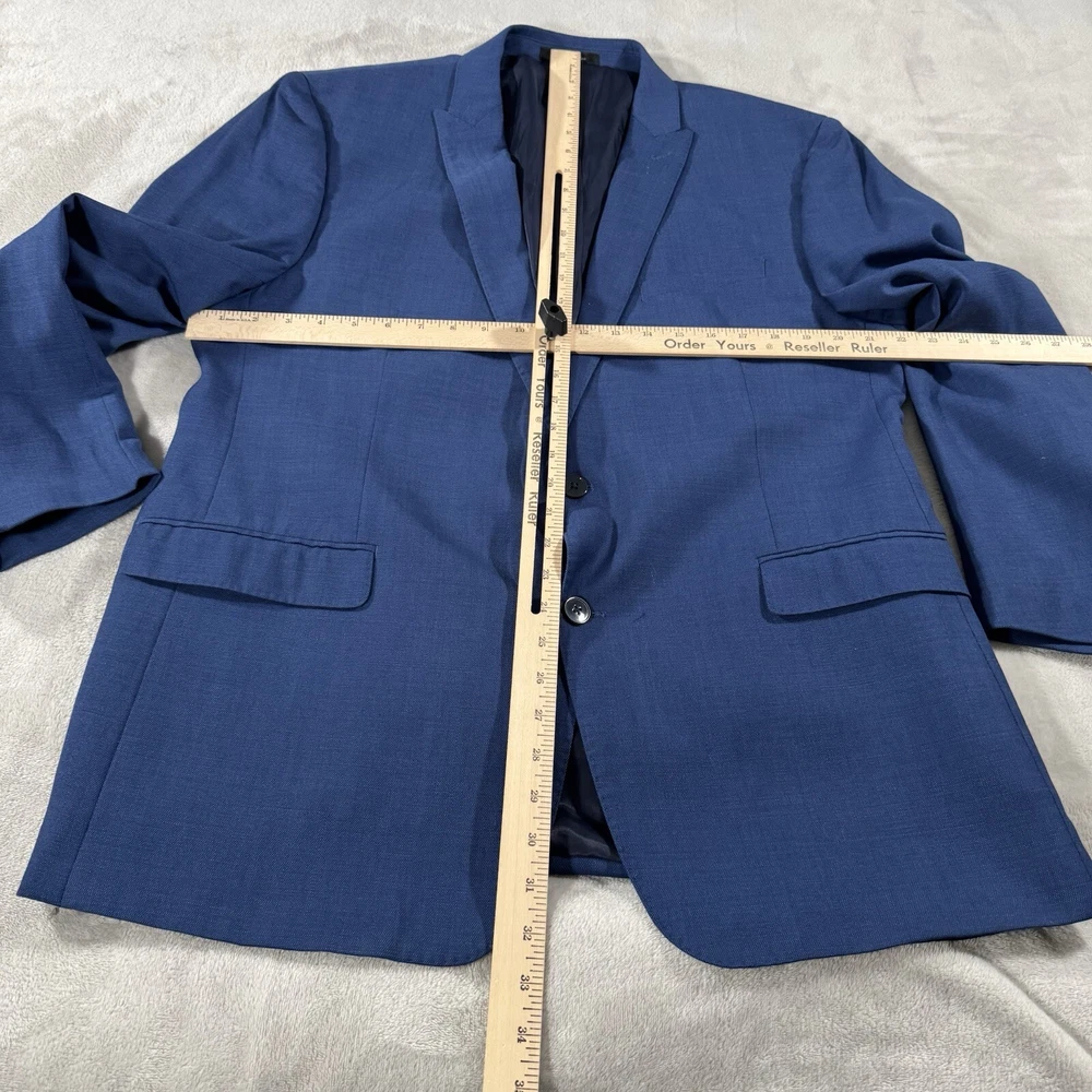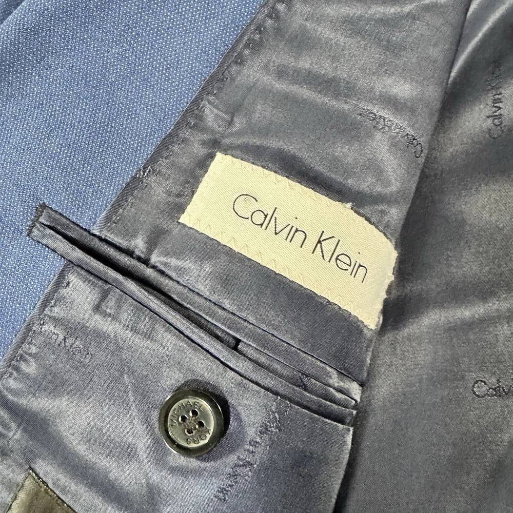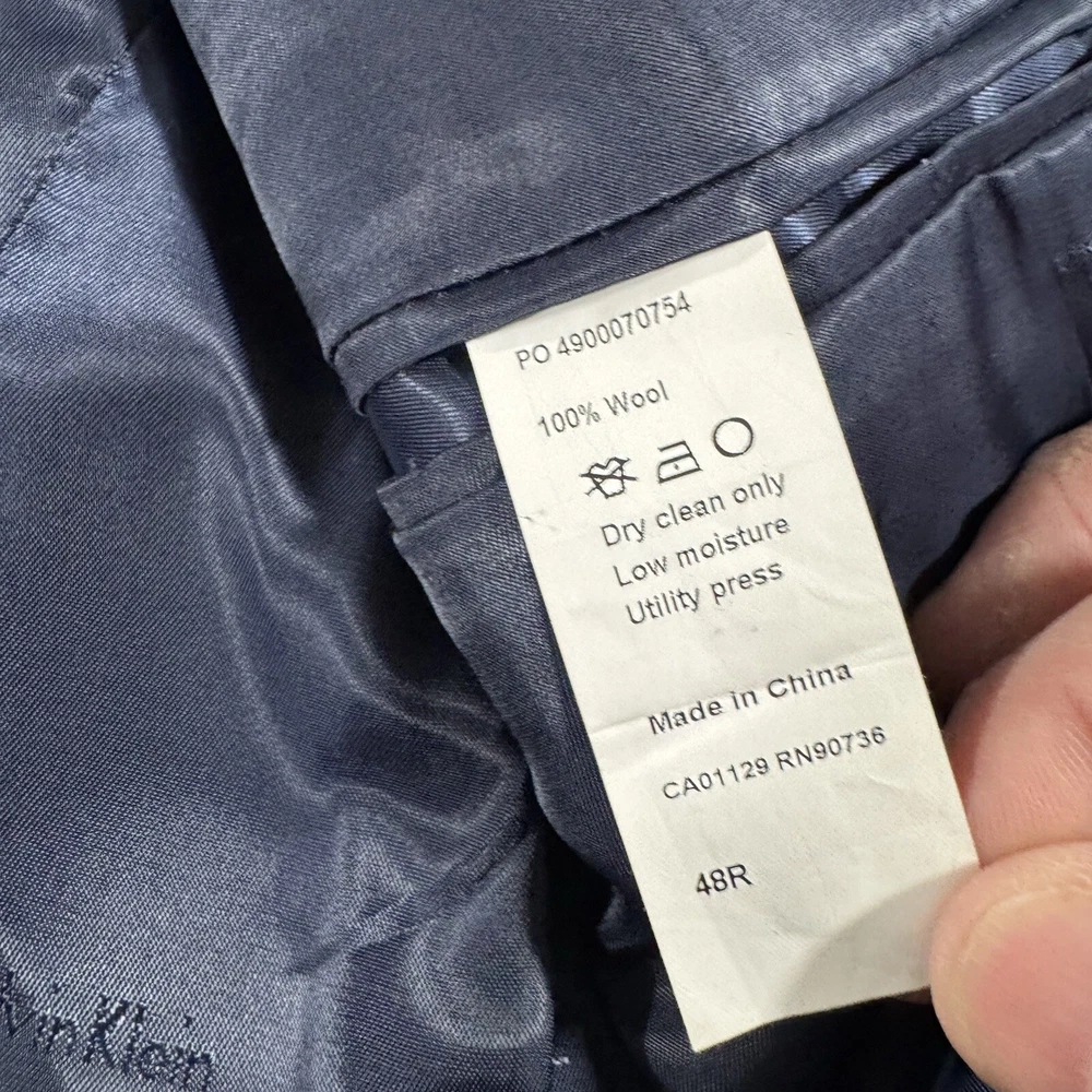 This Calvin Klein blazer is a stylish addition to any wardrobe. The blue color and solid pattern make it perfect for any occasion, whether it's for business, casual or a party. The blazer is made of a combination of spandex and wool, and features a woven fabric type that makes it comfortable to wear during any season. The blazer is a 2 piece, with a single-breasted cut and a two-button front button style. The notch lapel style and four-button sleeve button style add to its sleek design. The blazer is slim fit, with a regular size type and a chest size of 48. It is great for men who want to look stylish and well-dressed.