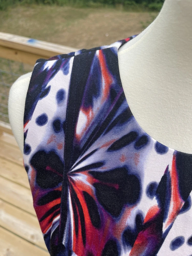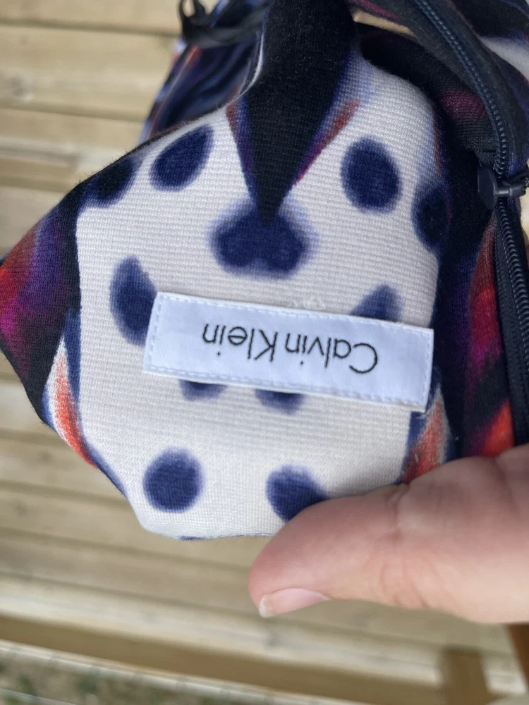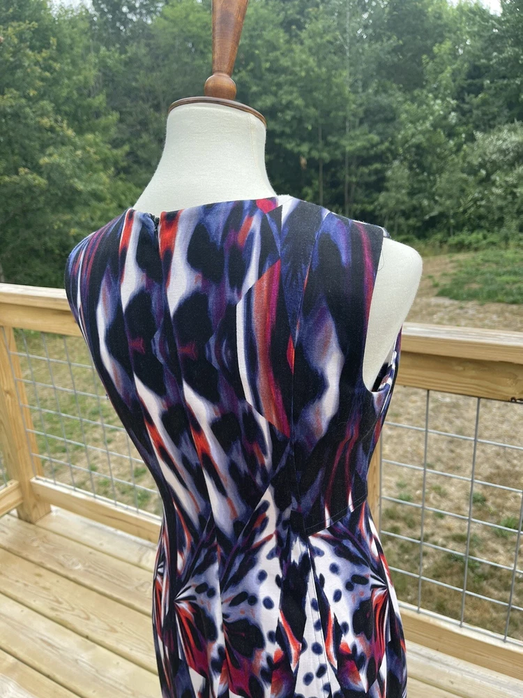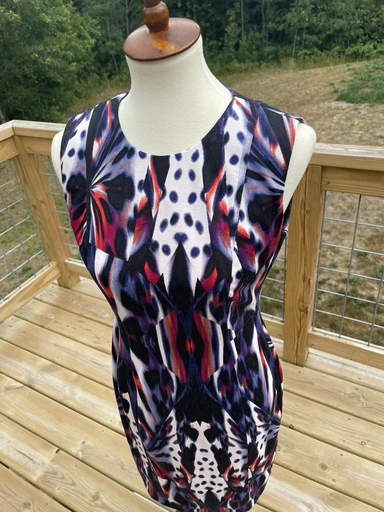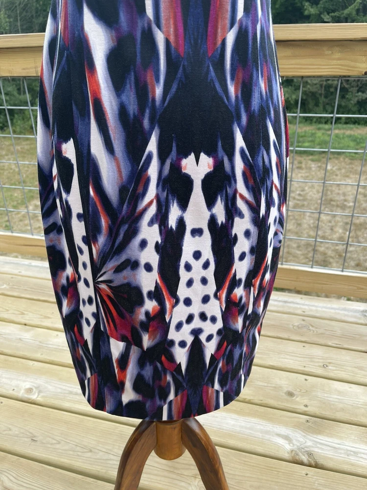Calvin Klein Dress Womens S M Classic Wild Sleeveless Sheath Pencil Career 3952. EXCELLENT Condition! Like New or very close Very nice quality stretch fabric Vibrant colors: black white orange gray purple violet blue It’s not animal print but it has that vibe Like a cross between a butterfly a zebra and a leopard :) 18” pit to pit 37” Shoulder to Bottom
