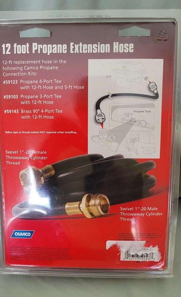 This CAMCO RV propane extension hose throwaway connector is the perfect addition to your RV. At 12 feet long, it provides ample length for connecting your propane tank to your camper. The hose is made in the United States and is designed to fit most standard propane tanks. With a no-warranty option, you can be sure that this product is built to last and will provide you with years of reliable use. The manufacturer part number is 59043, and it is easy to install. This extension hose is perfect for anyone who enjoys traveling in their RV and wants to ensure that they always have enough propane on hand.