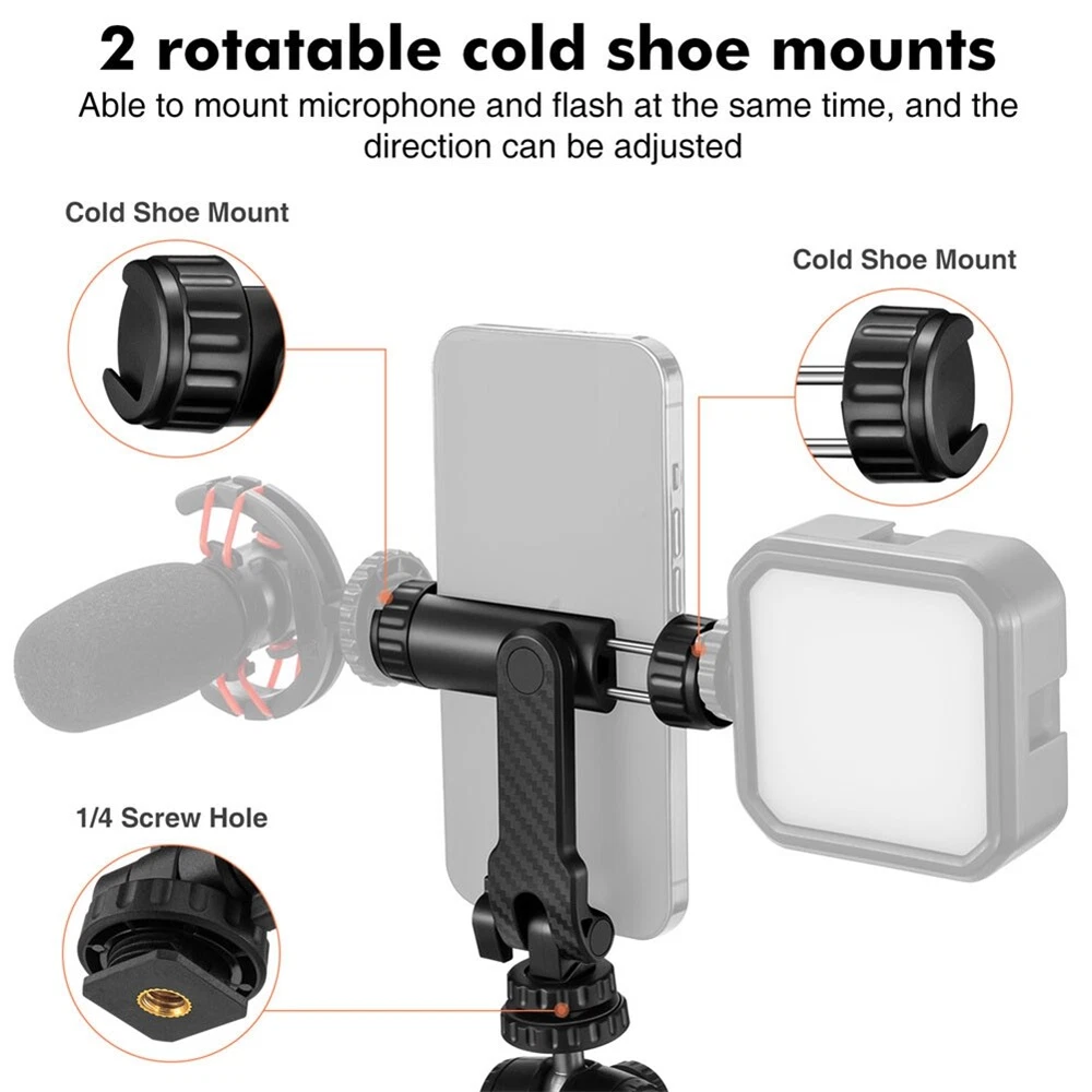 Camera Hot Shoe 360 Rotatable Phone Mount Holder Tripod W Cold Shoe for Mic1436 [Newest Phone Tripod Mount]Cell Phone Mount Tripod design with 360° Rotatable, you can attach extra LED light, microphone or other filming equipment. It helps to record steady videos for , and platforms and live streaming channels. [2 Cold Shoe Mount & 1/4 inch Screw Thread]The mobile phone tripod mount is equipped with two cold shoe mounts, allowing you to attach microphones, photography lights, and other accessories. Additionally, the cold shoe mounts can be easily rotated to adjust the angle of your equipment.Also features a standard 1/4 inch screw hole, making it compatible with tripods, selfie sticks, monopods, cameras, stabilizers, video sliders, ring lights, handle grips, and other accessories. [360° Adjustable Phone Holder] phone tripod adapter has an adjustable angle design,adopts 360° rotation design to support from different angles,allowing you to adjust the pitch angle on a tripod or camera hot shoe without needing a ball . It's more convenient and easy to use. [Quick Release]With the quick to mount smartphone tripod adapter to tedious. You just need to pull the spring, insert the phone and it will be fixed automatically. When you want to the phone, pull the spring clip, which is easy and convenient. Material: plastic colour: black Package Contents: 1 x Phone Mount Holder