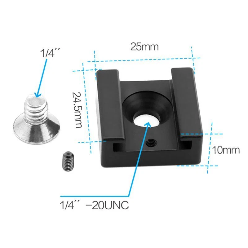 Description: brand new and high quality. Feature: Made of high-quality aluminum alloy material, durable, firm and stable for us to use. Can be attached to camera cage, shoulder rig, EVF mount for flashlight, camera microphone, Equipped with a little stop screw to prevent the equipment from sliding forward accidentally. Comes with a 4 mounting screw, easy to install and remove. Cold Shoe Mount Adapter only, other accessories in the picture is not included. Specifications: Item Type: Cold Shoe Mount Adapter Material: Aluminum Alloy Size: 25x24.5x10mm/0.98x0.96x0.39in Screw: 4 Screw Color: Black Quantity: Pc Note: 1cm=10mm=0.39inch Please allow 0-1cm error due to manual measurement. pls make sure you do not mind before you bid. Due to the difference between different monitors, the picture may not reflect the actual color of the item. Thank you! Package Includes: x Cold Shoe Mount Adapter x Mounting Screw x Wrench