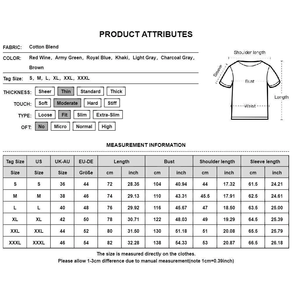 You may also like Mens Stretch Turtle Neck Under Shirt Long Sleeve Winter Warm Thermal Jumper Tops 20.79 USD Free shipping Mens Summer Linen Button T-Shirt Size Casual Loose Long Sleeve Blouse Tops Beach 19.49 USD Free shipping Mens Short Sleeve Shirts Tee Casual Business Golf Zipper Slim Fit T-shirt Tops 19.39 USD Free shipping Mens Henley T Shirt Grandad Button V Neck Autumn Casual Long Sleeve Shirts Tops 14.09 USD Free shipping Mens Turtle High Neck Jumper Tops Shirts Long Sleeve Casual Slim Pullover Blouse 17.49 USD Free shipping Men Long Sleeve Pullover T-Shirt Tops Collar Button Golf Casual Shirt Blouse Tee 18.89 USD Free shipping Mens Button Collar Solid T Shirts Tee Summer Short Sleeve Casual Loose Top US 18.99 USD Free shipping Mens Shirts Long Sleeve Casual Grandad Collar Regular Fit Work T Shirt Tops 27.79 USD Free shipping Mens Sleeveless Vest Tank Top Running Gym Top Sports Muscle Fit T-Shirt Blouse 15.69 USD Free shipping Mens Sleeveless Twill Vest Tank Summer Muscle Sports Gym Joggers Casual Tops Tee 19.59 USD Free shipping MENS COTTON LINEN VEST TANK TOPS SUMMER MUSCLE GYM SPORT TOPS LOOSE FIT T-SHIRT 17.59 USD Free shipping Mens Lapel Button Neck Business Shirt Casual Long Sleeve Tee Tops Sport T Shirts 17.69 USD Free shipping SAFE & SECURE SHOPPING 100% SATISFACTION GUARANTEED FAST SHIPPING Mens Plain Long Sleeve Shirts Button Casual Slim Fit Work Grandad Henley Tops US Product Description Product Features: Sleeve Length:Long Sleeve Sleeve Type:Regular Neckline:Half open collar Material:Cotton Blend Fabric Type:Jersey Pattern:Tie Dye Closure:Button Occasion:Elegant fashion Accents:Button Season:Spring/Autumn Department:Men Size Type:Regular Collar Style:O-Neck Type:T-Shirt Fit:Classic Features:buttons Hooded:Yes Clothing Length:Regular Applicable Scene:Home Applicable Season:Spring and Autumn About This Item(We aim to show you accurate product information) 1.The Real Object May Exist Slightly Colors Differences Compared To Images As Different Computers Display.Caution If Minding,Thanks. 2.There Might Be A Manual Measuring 1-3 cm Error.Sorry For Any Inconvenience(note 1cm=0.39inch) . 3.Please Prevail On Real Item, Model Images For Reference Only. 4.Attention!!!Please check the size chart carefully before placing the order. Thanks for your understanding. Package Content: 1 x Top Size C hart: Size-Details Tag Size UK Size EU Size US Size length Bust Shoulder length Sleeve length cm inch cm inch cm inch cm inch S 36 44 34 72 28.35 104 40.94 44 17.32 61.5 24.21 M 38 46 36 74 29.13 110 43.31 45.5 17.91 62.5 24.61 L 40 48 38 76 29.92 116 45.67 47 18.50 63.5 25.00 XL 42 50 40 78 30.71 122 48.03 49 19.29 64.5 25.39 2XL 44 52 42 80 31.50 130 51.18 51 20.08 65.5 25.79 3XL 46 54 44 82 32.28 138 54.33 53 20.87 66.5 26.18 Sleeve Length:Long Sleeve Sleeve Type:Regular Neckline:Half open collar Material:Cotton Blend Fabric Type:Jersey Pattern:Tie Dye Closure:Button Occasion:Elegant fashion Accents:Button Season:Spring/Autumn Department:Women Size Type:Regular Collar Style:O-Neck Theme:NO Type:T-Shirt Fit:Classic Features:buttons Hooded:Yes Clothing Length:Regular Applicable Scene:Home Applicable Season:Spring and Autumn Shirts Type:NO Payment Shipping Returns Contact Us Payment We ship to your eBay or Paypal address. Please make sure your eBay and Paypal address is correct before you pay. Shipping All orders will be processed and shipped within 48 hours, Monday to Friday in most cases. Most packages will be shipped via USPS First Mail, it usually takes 3-7 days for delivery. A tracking number will be emailed to you upon shipment. Please note that USPS does not update tracking information location by location. We only ship to address that you input during Paypal checkout. Buyers are responsible for wrong or undeliverable address. Returns Please see the size reference to find the correct size. There may be slightly color difference cause of light shooting. Please allow 1-3cm difference due to manual measurement(note 1cm=0.39inch) Returns will be accepted within 60 days after delivery. However, if the item is damaged upon arrival, buyers must contact us within 3 days after delivery for any refund or replacement. Returns will not be accepted if buyers caused any damages to the item. Refunds are given as Exchange or Money Back. Contact Us Please be patient when contacting us, all messages will be replied within 12 hours. Customer Service from 9:00 am - 6:00 pm on Business Days. Please let us know immediately if a package is damaged upon arrival. Feel free to contact us if you’d like to combine shipping on your purchases. We appreciate your feedback and we will send buyers positive feedback after a shipment has been processed. Customer satisfaction is significant to us. If you are dissatisfied with a transaction for any reason. Before taking any action, please contact us through eBay and we will do everything we can to help you. Copyright © 2022 Tongtool