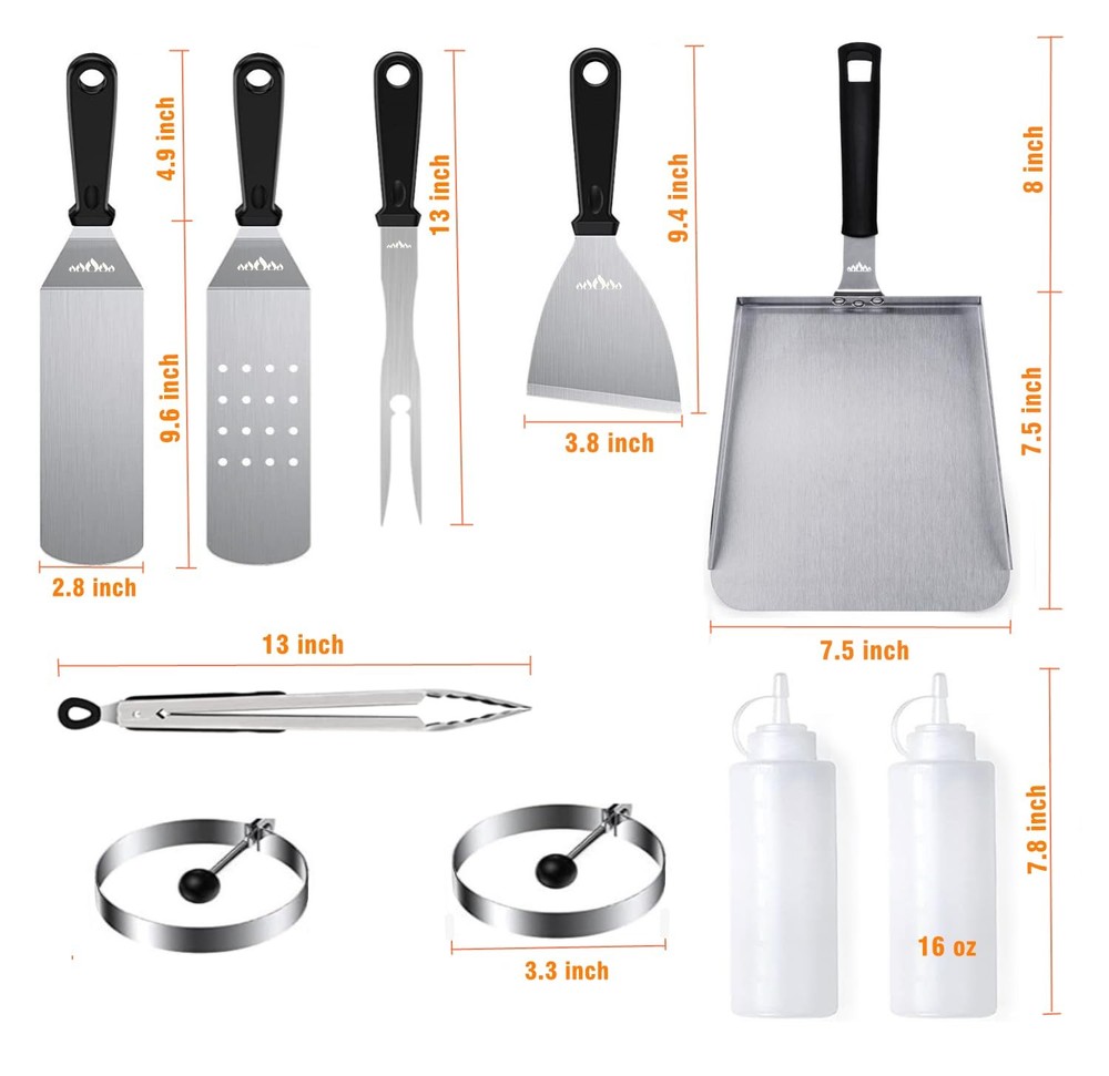 Featured Cooking Accessories Set- Contains 2 spatulas, 1 wide scooper, 1 tong, 1 meat fork, 1 straight shank scraper, 2 16 oz squeeze bottles, and 2 egg ring Multipurpose Cooking Utensil Set - Great for indoor outdoor cooking on flat top griddle, skillet, hibachi and teppanyaki Unique Accessory Combination for Flat top griddle- 2 Oversized spatulas, great for flipping beef cubes, burgers, pancakes, vegetables, and all other barbecue applications, 1 extra-large stainless steel wide shovel for scooping large quantities of food, 1 BBQ meat fork, 1 food tong, 1 straight shank scraper keeps your hands off the hot cooking surface, making it safer to clean the cooking surface, 2 16 oz squeeze bottle and 2 egg ring Premium Stainless Steel- Excellent durability for commercial applications, made of stronger & thicker stainless steel, maintenance free Easy to Clean & Dishwasher Safe- After all the cooking is done, you can prevent rust by simply washing the surface of food debris and juices with soapy water, or simply put them in the dishwasher. No other additional maintenance measures are required Great Gift Choice - Ideal griddle gift choice for Fathers Day, Thanksgiving or Christmas. Desirable gift for barbecue and camping enthusiast