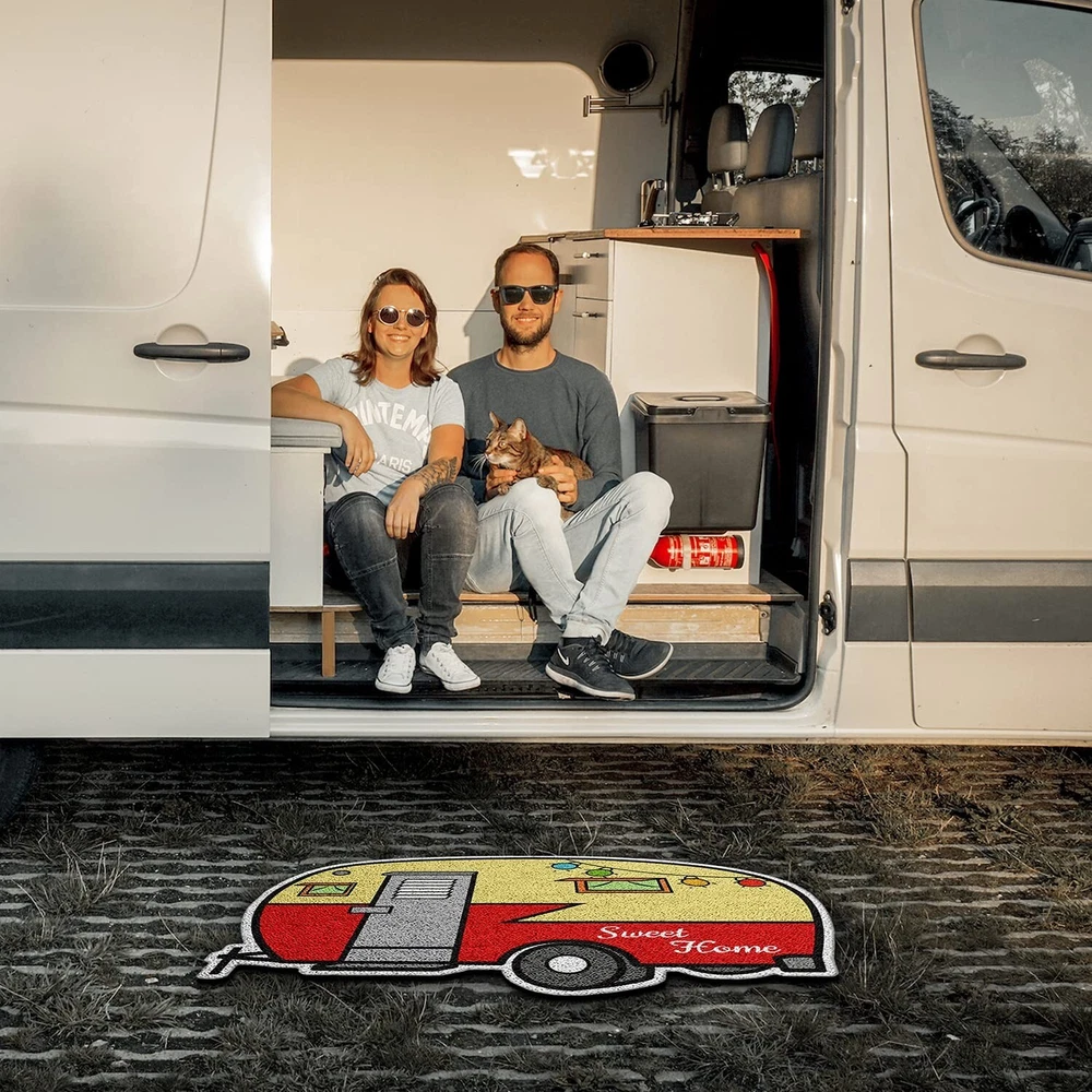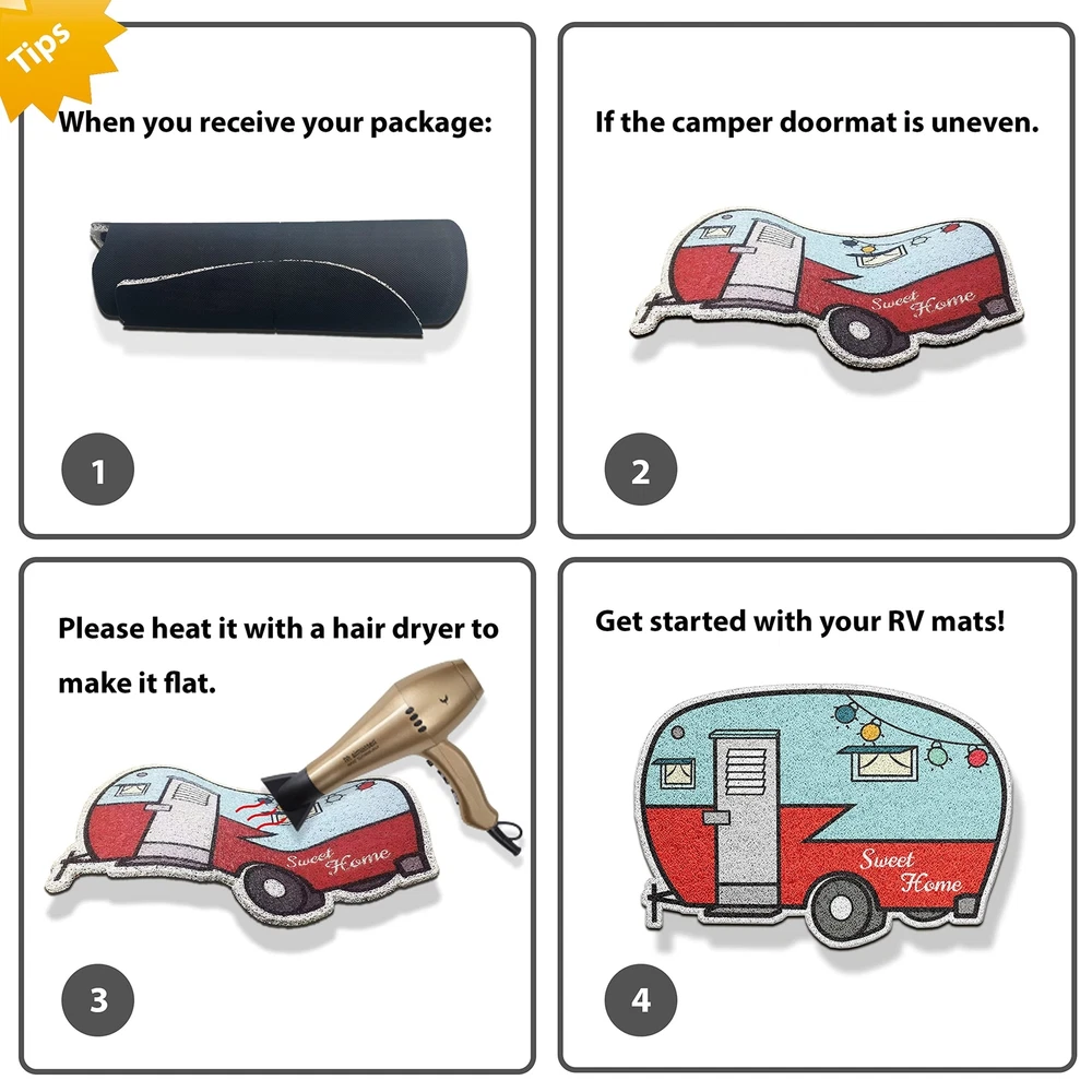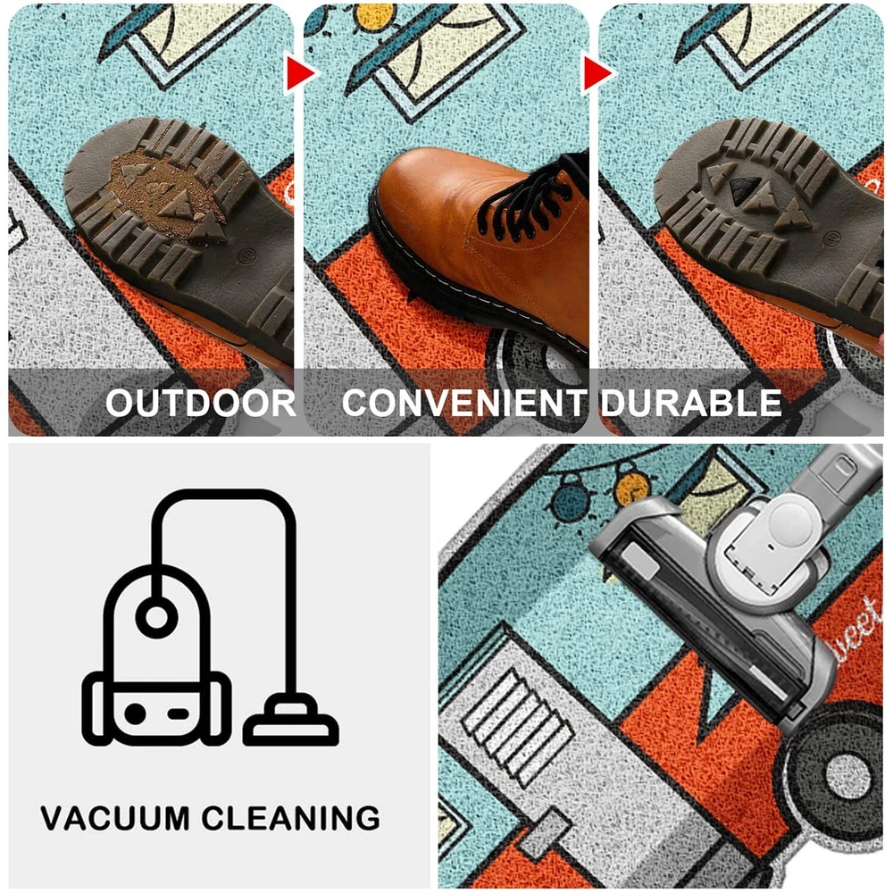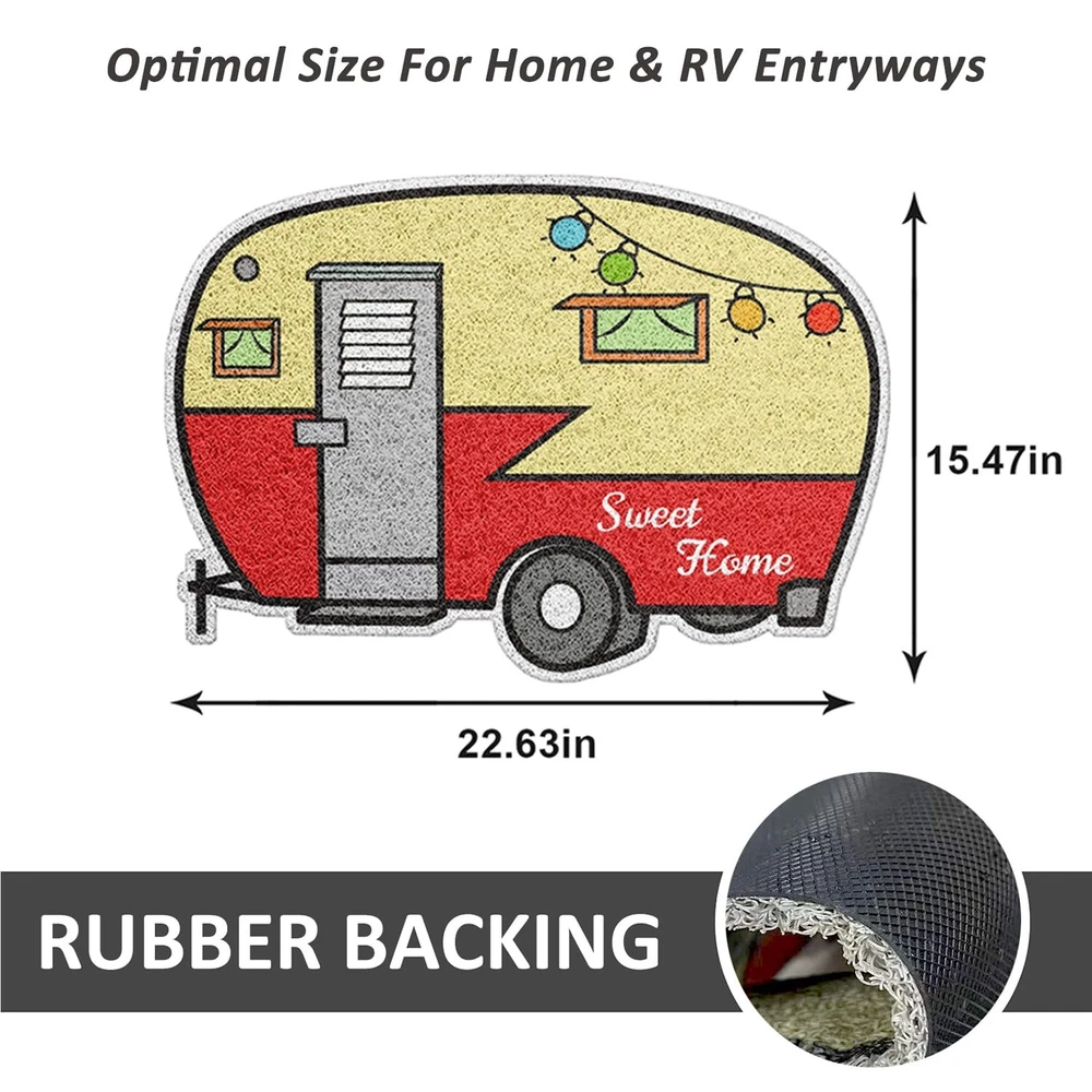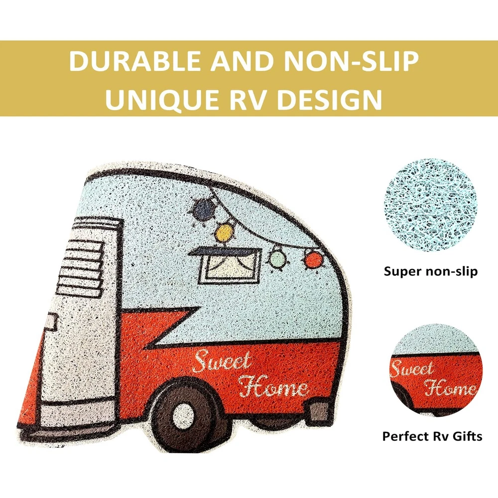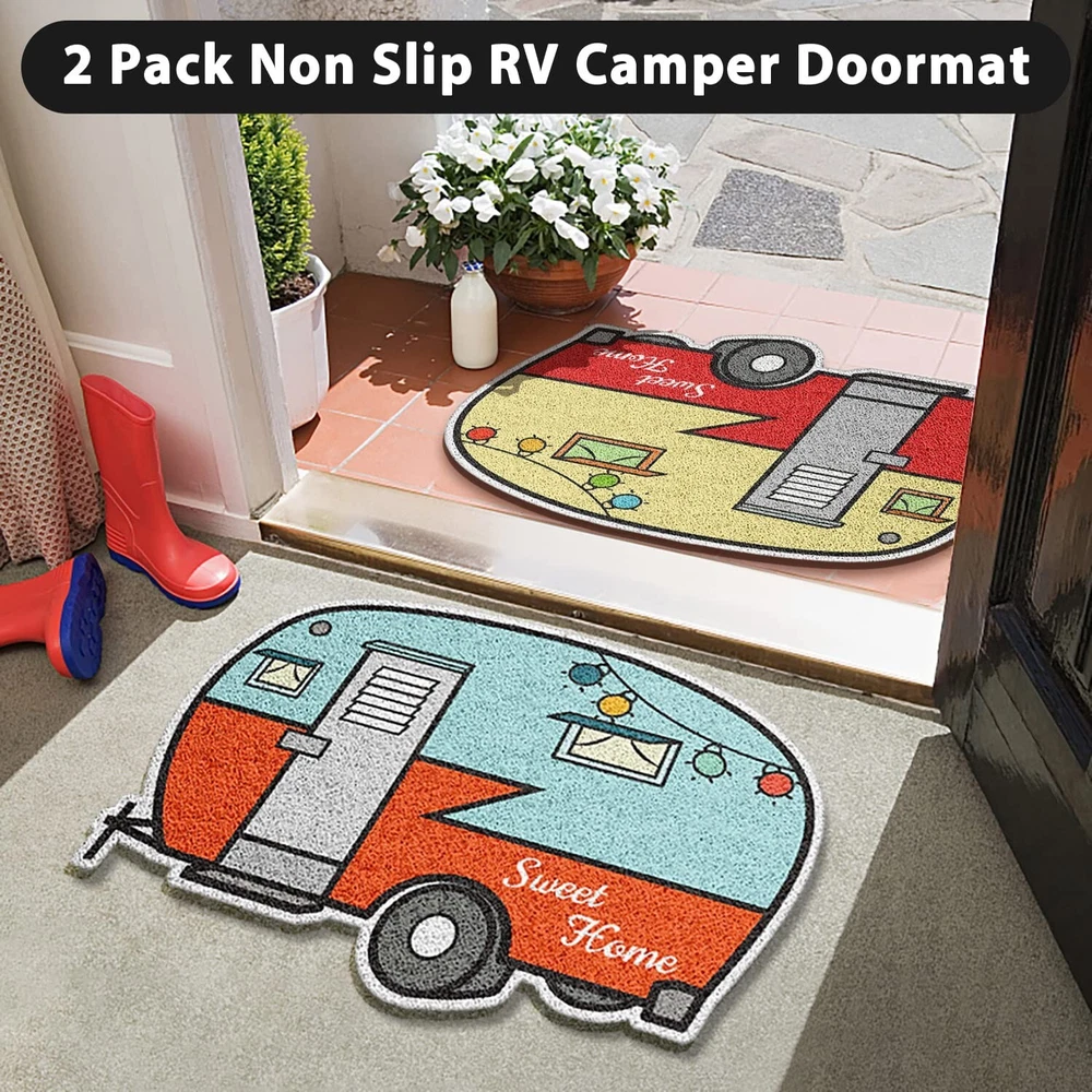 Camper Door Mat,Outdoor Doormats 24"x16" for Entrance,2Pcs Non Slip RV Front Door Mat Inside,Welcome Mats,Travel Trailer Accessories and Campsite Decor,Gift for Families Friends Campers Product Details Brand: Nianjida Size: 1'11" x 1'4" (Rectangular) Material: Polyvinyl Chloride Weave Type: Machine Made Item Weight: 2.45 Pounds Brand: Nianjida Size: 1'11" x 1'4" (Rectangular) Material: Polyvinyl Chloride Weave Type: Machine Made Item Weight: 2.45 Pounds Pile Height: Low Pile Construction Type: Machine Made Back Material Type: Polyvinyl Chloride Color: Blue、yellow Indoor/Outdoor Usage: Both Is Stain Resistant: Yes Product Care Instructions: Hand Wash Only" or "Machine Pattern: Geometric Shape: Rectangular Special Feature: Waterproof, Stain Resistant, Non Slip, Washable Product Dimensions: 23"L x 16"W Rug Form Type: Doormat Style: Retro Nianjida Camper Door Mat, Camping Mat Outdoor & RV Décor Occasion: Christmas, New Year, Housewarming Min. Required Door Width: 24 Inches Number of Pieces: 2 Water Resistance Level: Water Resistant Model Name: 001 Age Range (Description): Adult UPC: 734172481915 Item Weight: 2.45 pounds Manufacturer: Nianjida-001 Country of Origin: China Item model number: 001 Date First Available: June 27, 2022 [Unique RV Decor ]: Camper decor add personality and style to your entrance. Show campers how cute this unique mat is! Camping design allows you to celebrate each holiday and season with different styles. Our offers indoor outdoor door mat from simple classic designs,modern,geometric,fun,colorful,to camping door mat and pet friendly entry mats for your home. [Optimal Size for Most Home& RV Entryways]: Our camper mat 23 x 16inch is designed specifically for home& RV use,making it ideal for any RV. This trailer door mat is not only the ideal choice as a funny welcome mats outdoor,but also the best ideal gifts for RV trailer owners as a decorative entrance decorations. [Perfect RV Gifts] - Perfect for anyone who loves camping,perfect Camping Gift for camper owners,RV owners,travel trailer accessories inside&outside. Decorate your camper entrance with this rv doormat outdoor entrance,add a camping atmosphere and welcome guests to your camper,your camping friends and family will love the gorgeous greetings they receive when they visit! [Multiple Uses]: These durable outdoor mats for home entrance aren't just for your front porch or entryway,use on patios,in a garage,laundry room,mud porch- any entry or exit with high traffic would benefit from these outdoor/indoor front door mat. This home sweet home doormat featuring looped PVC material that helps trap moisture and dirt from entering your home,RV,or campsite. [Easy to Clean]: Camping rug is durable and easy to clean. This fall door mat outdoor captures dirt and moisture to keep your indoor space clean. You just use a vacuum to clean it or shake it off. For deep cleaning,you can rinse it with a garden hose and let it dry. It will be a beautiful and creative way to decor your camper when keeping clean. Tips: After you open the doormat, pls use hair dryer to heat up the doormat and make it flat again before using.